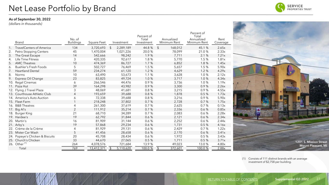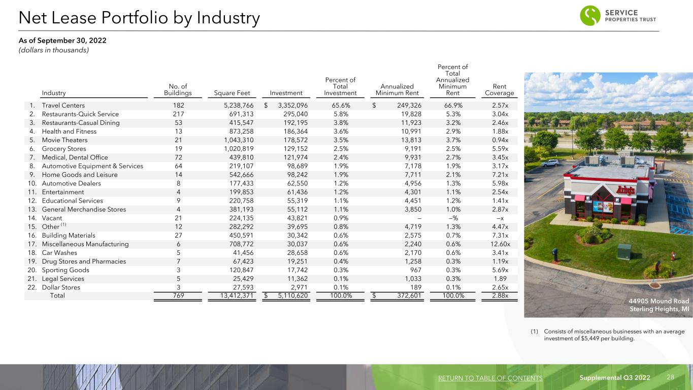 Supplemental Q3 2022 27 Brand No. of Buildings Square Feet Investment Percent of Total Investment Annualized Minimum Rent Percent of Total Annualized Minimum Rent Rent Coverage 1. TravelCenters of America 134 3,720,693 $ 2,289,189 44.8 % $ 168,012 45.1 % 2.65x 2. Petro Stopping Centers 45 1,470,004 1,021,226 20.0 % 78,099 21.0 % 2.33x 3. The Great Escape 14 542,666 98,242 1.9 % 7,711 2.1 % 7.21x 4. Life Time Fitness 3 420,335 92,617 1.8 % 5,770 1.5 % 1.81x 5. AMC Theatres 10 474,369 86,727 1.7 % 6,852 1.8 % 1.45x 6. Buehler's Fresh Foods 5 502,727 76,469 1.5 % 5,657 1.5 % 5.90x 7. Heartland Dental 59 234,274 61,120 1.2 % 4,629 1.2 % 4.29x 8. Norms 10 63,490 53,673 1.1 % 3,628 1.0 % 2.12x 9. Express Oil Change 23 83,825 49,724 1.0 % 3,717 1.0 % 4.34x 10. Regal Cinemas 6 266,546 44,476 0.9 % 3,736 1.0 % 1.19x 11. Pizza Hut 39 164,298 43,982 0.9 % 3,300 0.9 % 2.26x 12. Flying J Travel Plaza 3 48,069 41,681 0.8 % 3,215 0.9 % 4.55x 13. Courthouse Athletic Club 4 193,659 39,688 0.8 % 1,878 0.5 % 1.73x 14. America's Auto Auction 6 72,338 39,688 0.8 % 3,216 0.9 % 5.90x 15. Fleet Farm 1 218,248 37,802 0.7 % 2,728 0.7 % 1.75x 16. B&B Theatres 4 261,300 37,619 0.7 % 2,625 0.7 % 0.13x 17. Big Al's 2 111,912 35,214 0.7 % 2,336 0.6 % 0.85x 18. Burger King 21 68,710 34,289 0.7 % 2,083 0.6 % 2.28x 19. Hardee's 19 62,792 31,844 0.6 % 2,121 0.6 % 2.34x 20. Martin's 16 81,909 31,144 0.6 % 2,252 0.6 % 2.44x 21. Arby's 19 57,868 29,234 0.6 % 1,731 0.5 % 4.16x 22. Crème de la Crème 4 81,929 29,131 0.6 % 2,429 0.7 % 1.22x 23. Mister Car Wash 5 41,456 28,658 0.6 % 2,170 0.6 % 3.41x 24. Popeye's Chicken & Biscuits 20 45,708 28,434 0.6 % 1,972 0.5 % 3.43x 25. Church's Chicken 33 44,670 27,065 0.5 % 1,711 0.5 % 3.71x 26. Other (1) 264 4,078,576 721,684 13.9 % 49,023 13.0 % 4.80x Total 769 13,412,371 $ 5,110,620 100.0 % $ 372,601 100.0 % 2.88x (1) Consists of 111 distinct brands with an average investment of $2,758 per building. Net Lease Portfolio by Brand As of September 30, 2022 (dollars in thousands) RETURN TO TABLE OF CONTENTS 1201 S. Mission Street Mount Pleasant, MI