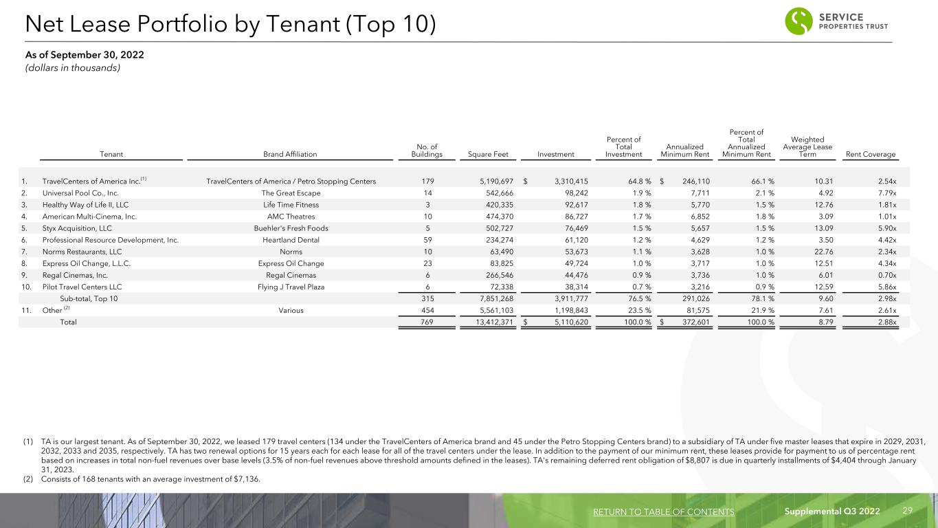 Supplemental Q3 2022 29 Tenant Brand Affiliation No. of Buildings Square Feet Investment Percent of Total Investment Annualized Minimum Rent Percent of Total Annualized Minimum Rent Weighted Average Lease Term Rent Coverage 1. TravelCenters of America Inc.(1) TravelCenters of America / Petro Stopping Centers 179 5,190,697 $ 3,310,415 64.8 % $ 246,110 66.1 % 10.31 2.54x 2. Universal Pool Co., Inc. The Great Escape 14 542,666 98,242 1.9 % 7,711 2.1 % 4.92 7.79x 3. Healthy Way of Life II, LLC Life Time Fitness 3 420,335 92,617 1.8 % 5,770 1.5 % 12.76 1.81x 4. American Multi-Cinema, Inc. AMC Theatres 10 474,370 86,727 1.7 % 6,852 1.8 % 3.09 1.01x 5. Styx Acquisition, LLC Buehler's Fresh Foods 5 502,727 76,469 1.5 % 5,657 1.5 % 13.09 5.90x 6. Professional Resource Development, Inc. Heartland Dental 59 234,274 61,120 1.2 % 4,629 1.2 % 3.50 4.42x 7. Norms Restaurants, LLC Norms 10 63,490 53,673 1.1 % 3,628 1.0 % 22.76 2.34x 8. Express Oil Change, L.L.C. Express Oil Change 23 83,825 49,724 1.0 % 3,717 1.0 % 12.51 4.34x 9. Regal Cinemas, Inc. Regal Cinemas 6 266,546 44,476 0.9 % 3,736 1.0 % 6.01 0.70x 10. Pilot Travel Centers LLC Flying J Travel Plaza 6 72,338 38,314 0.7 % 3,216 0.9 % 12.59 5.86x Sub-total, Top 10 315 7,851,268 3,911,777 76.5 % 291,026 78.1 % 9.60 2.98x 11. Other (2) Various 454 5,561,103 1,198,843 23.5 % 81,575 21.9 % 7.61 2.61x Total 769 13,412,371 $ 5,110,620 100.0 % $ 372,601 100.0 % 8.79 2.88x (1) TA is our largest tenant. As of September 30, 2022, we leased 179 travel centers (134 under the TravelCenters of America brand and 45 under the Petro Stopping Centers brand) to a subsidiary of TA under five master leases that expire in 2029, 2031, 2032, 2033 and 2035, respectively. TA has two renewal options for 15 years each for each lease for all of the travel centers under the lease. In addition to the payment of our minimum rent, these leases provide for payment to us of percentage rent based on increases in total non-fuel revenues over base levels (3.5% of non-fuel revenues above threshold amounts defined in the leases). TA's remaining deferred rent obligation of $8,807 is due in quarterly installments of $4,404 through January 31, 2023. (2) Consists of 168 tenants with an average investment of $7,136. Net Lease Portfolio by Tenant (Top 10) As of September 30, 2022 (dollars in thousands) RETURN TO TABLE OF CONTENTS