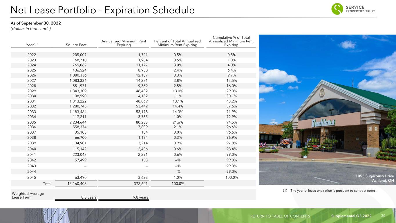 Supplemental Q3 2022 30 Year (1) Square Feet Annualized Minimum Rent Expiring Percent of Total Annualized Minimum Rent Expiring Cumulative % of Total Annualized Minimum Rent Expiring 2022 205,007 1,721 0.5% 0.5% 2023 168,710 1,904 0.5% 1.0% 2024 769,082 11,177 3.0% 4.0% 2025 436,524 8,950 2.4% 6.4% 2026 1,080,336 12,187 3.3% 9.7% 2027 1,083,336 14,231 3.8% 13.5% 2028 551,971 9,369 2.5% 16.0% 2029 1,343,309 48,482 13.0% 29.0% 2030 138,590 4,182 1.1% 30.1% 2031 1,313,222 48,869 13.1% 43.2% 2032 1,280,745 53,442 14.4% 57.6% 2033 1,183,464 53,178 14.3% 71.9% 2034 117,211 3,785 1.0% 72.9% 2035 2,234,644 80,283 21.6% 94.5% 2036 558,374 7,809 2.1% 96.6% 2037 35,103 154 0.0% 96.6% 2038 66,700 1,184 0.3% 96.9% 2039 134,901 3,214 0.9% 97.8% 2040 115,142 2,406 0.6% 98.4% 2041 223,043 2,291 0.6% 99.0% 2042 57,499 155 —% 99.0% 2043 — — —% 99.0% 2044 — — —% 99.0% 2045 63,490 3,628 1.0% 100.0% Total 13,160,403 372,601 100.0% Weighted Average Lease Term 8.8 years 9.8 years (1) The year of lease expiration is pursuant to contract terms. Net Lease Portfolio - Expiration Schedule As of September 30, 2022 (dollars in thousands) RETURN TO TABLE OF CONTENTS 1055 Sugarbush Drive Ashland, OH