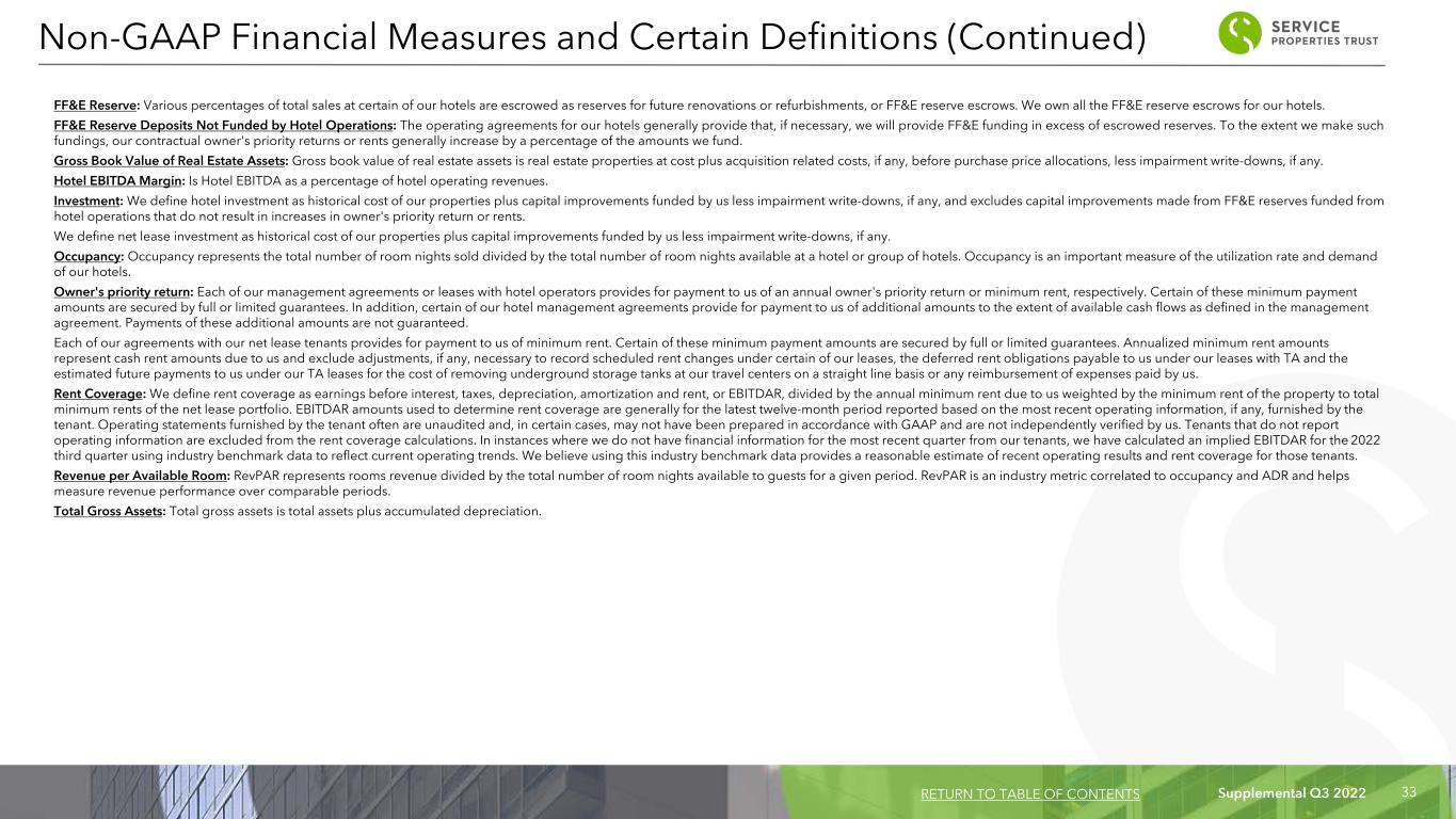 Supplemental Q3 2022 32 Non-GAAP Financial Measures We present certain “non-GAAP financial measures” within the meaning of the applicable Securities and Exchange Commission, or SEC, rules, including FFO, Normalized FFO, EBITDA, Hotel EBITDA, Adjusted Hotel EBITDA, EBITDAre and Adjusted EBITDAre. These measures do not represent cash generated by operating activities in accordance with GAAP and should not be considered alternatives to net income (loss) as indicators of our operating performance or as measures of our liquidity. These measures should be considered in conjunction with net income (loss) as presented in our condensed consolidated statements of income (loss). We consider these non-GAAP measures to be appropriate supplemental measures of operating performance for a REIT, along with net income (loss). We believe these measures provide useful information to investors because by excluding the effects of certain historical amounts, such as depreciation and amortization expense, they may facilitate a comparison of our operating performance between periods and with other REITs and, in the case of Hotel EBITDA, reflecting only those income and expense items that are generated and incurred at the hotel level may help both investors and management to understand the operations of our hotels. FFO and Normalized FFO: We calculate funds from operations, or FFO, and Normalized FFO as shown on page 9. FFO is calculated on the basis defined by The National Association of Real Estate Investment Trusts, or Nareit, which is net income (loss), calculated in accordance with GAAP, excluding any gain or loss on sale of properties and loss on impairment of real estate assets, if any, plus real estate depreciation and amortization, less any unrealized gains and losses on equity securities, as well as adjustments to reflect our share of FFO attributable to an investee and certain other adjustments currently not applicable to us. In calculating Normalized FFO, we adjust for the items shown on page 9. FFO and Normalized FFO are among the factors considered by our Board of Trustees when determining the amount of distributions to our shareholders. Other factors include, but are not limited to, requirements to satisfy our REIT distribution requirements, limitations in our credit agreement and public debt covenants, the availability to us of debt and equity capital, our distribution rate as a percentage of the trading price of our common shares, or dividend yield, and to the dividend yield of other REITs, our expectation of our future capital requirements and operating performance and our expected needs for and availability of cash to pay our obligations. Other real estate companies and REITs may calculate FFO and Normalized FFO differently than we do. EBITDA, EBITDAre and Adjusted EBITDAre: We calculate earnings before interest, taxes, depreciation and amortization, or EBITDA, EBITDA for real estate, or EBITDAre, and Adjusted EBITDAre as shown on page 10. EBITDAre is calculated on the basis defined by Nareit, which is EBITDA, excluding gains and losses on the sale of real estate, loss on impairment of real estate assets, if any, and adjustments to reflect our share of EBITDAre attributable to an investee. In calculating Adjusted EBITDAre, we adjust for the items shown on page 10. Other real estate companies and REITs may calculate EBITDA, EBITDAre and Adjusted EBITDAre differently than we do. Hotel EBITDA: We calculate Hotel EBITDA as hotel operating revenues less hotel operating expenses of all managed and leased hotels, prior to any adjustments required for presentation in our condensed consolidated statements of income (loss) in accordance with GAAP. We believe that Hotel EBITDA provides useful information to management and investors as a key measure of the profitability of our hotel operations. Other Definitions Adjusted Total Assets and Total Unencumbered Assets: Adjusted total assets and total unencumbered assets include original cost of real estate assets calculated in accordance with GAAP before impairment write-downs, if any, and exclude depreciation and amortization, accounts receivable and intangible assets. Annualized Dividend Yield: Annualized dividend yield is the annualized dividend paid during the period divided by the closing price of our common shares at the end of the period. Average Daily Rate: ADR represents rooms revenue divided by the total number of room nights sold in a given period. ADR provides useful insight on pricing at our hotels and is a measure widely used in the hotel industry. Chain Scale: As characterized by STR, a data benchmark and analytics provider for the lodging industry. Comparable Hotels Data: We present RevPAR, ADR and occupancy for the periods presented on a comparable basis to facilitate comparisons between periods. We generally define comparable hotels as those that we owned on September 30, 2022 and were open and operating since the beginning of the earliest period being compared. For the periods presented, our comparable results excluded three hotels that had suspended operations during part of the periods presented. Consolidated Income Available for Debt Service: Consolidated income available for debt service, as defined in our debt agreements, is earnings from operations excluding interest expense, unrealized gains and losses on equity securities, depreciation and amortization, loss on asset impairment, unrealized appreciation on assets held for sale, gains and losses on early extinguishment of debt, gains and losses on sales of property and amortization of deferred charges. Debt: Debt amounts reflect the principal balance as of the date reported. Net debt means total debt less unrestricted cash and cash equivalents as of the date reported. Non-GAAP Financial Measures and Certain Definitions RETURN TO TABLE OF CONTENTS