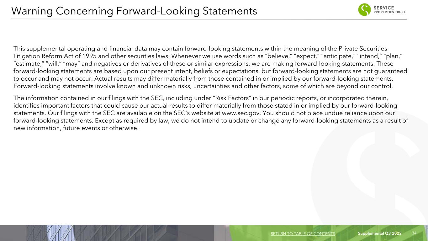 Supplemental Q3 2022 33 FF&E Reserve: Various percentages of total sales at certain of our hotels are escrowed as reserves for future renovations or refurbishments, or FF&E reserve escrows. We own all the FF&E reserve escrows for our hotels. FF&E Reserve Deposits Not Funded by Hotel Operations: The operating agreements for our hotels generally provide that, if necessary, we will provide FF&E funding in excess of escrowed reserves. To the extent we make such fundings, our contractual owner's priority returns or rents generally increase by a percentage of the amounts we fund. Gross Book Value of Real Estate Assets: Gross book value of real estate assets is real estate properties at cost plus acquisition related costs, if any, before purchase price allocations, less impairment write-downs, if any. Hotel EBITDA Margin: Is Hotel EBITDA as a percentage of hotel operating revenues. Investment: We define hotel investment as historical cost of our properties plus capital improvements funded by us less impairment write-downs, if any, and excludes capital improvements made from FF&E reserves funded from hotel operations that do not result in increases in owner's priority return or rents. We define net lease investment as historical cost of our properties plus capital improvements funded by us less impairment write-downs, if any. Occupancy: Occupancy represents the total number of room nights sold divided by the total number of room nights available at a hotel or group of hotels. Occupancy is an important measure of the utilization rate and demand of our hotels. Owner's priority return: Each of our management agreements or leases with hotel operators provides for payment to us of an annual owner's priority return or minimum rent, respectively. Certain of these minimum payment amounts are secured by full or limited guarantees. In addition, certain of our hotel management agreements provide for payment to us of additional amounts to the extent of available cash flows as defined in the management agreement. Payments of these additional amounts are not guaranteed. Each of our agreements with our net lease tenants provides for payment to us of minimum rent. Certain of these minimum payment amounts are secured by full or limited guarantees. Annualized minimum rent amounts represent cash rent amounts due to us and exclude adjustments, if any, necessary to record scheduled rent changes under certain of our leases, the deferred rent obligations payable to us under our leases with TA and the estimated future payments to us under our TA leases for the cost of removing underground storage tanks at our travel centers on a straight line basis or any reimbursement of expenses paid by us. Rent Coverage: We define rent coverage as earnings before interest, taxes, depreciation, amortization and rent, or EBITDAR, divided by the annual minimum rent due to us weighted by the minimum rent of the property to total minimum rents of the net lease portfolio. EBITDAR amounts used to determine rent coverage are generally for the latest twelve-month period reported based on the most recent operating information, if any, furnished by the tenant. Operating statements furnished by the tenant often are unaudited and, in certain cases, may not have been prepared in accordance with GAAP and are not independently verified by us. Tenants that do not report operating information are excluded from the rent coverage calculations. In instances where we do not have financial information for the most recent quarter from our tenants, we have calculated an implied EBITDAR for the 2022 third quarter using industry benchmark data to reflect current operating trends. We believe using this industry benchmark data provides a reasonable estimate of recent operating results and rent coverage for those tenants. Revenue per Available Room: RevPAR represents rooms revenue divided by the total number of room nights available to guests for a given period. RevPAR is an industry metric correlated to occupancy and ADR and helps measure revenue performance over comparable periods. Total Gross Assets: Total gross assets is total assets plus accumulated depreciation. Non-GAAP Financial Measures and Certain Definitions (Continued) RETURN TO TABLE OF CONTENTS