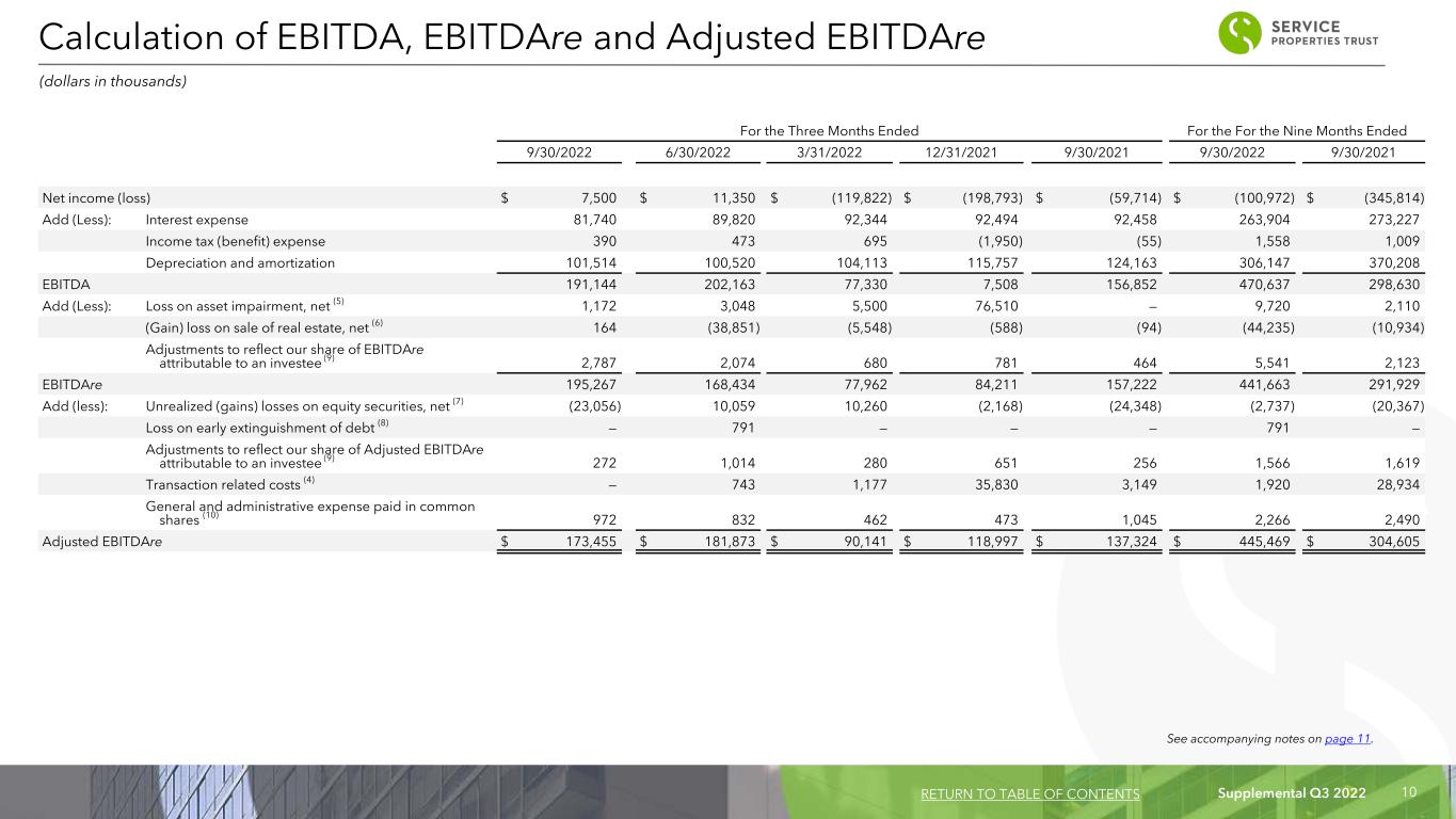 サービスプロパティートラスト、2022年第3四半期の業績を発表