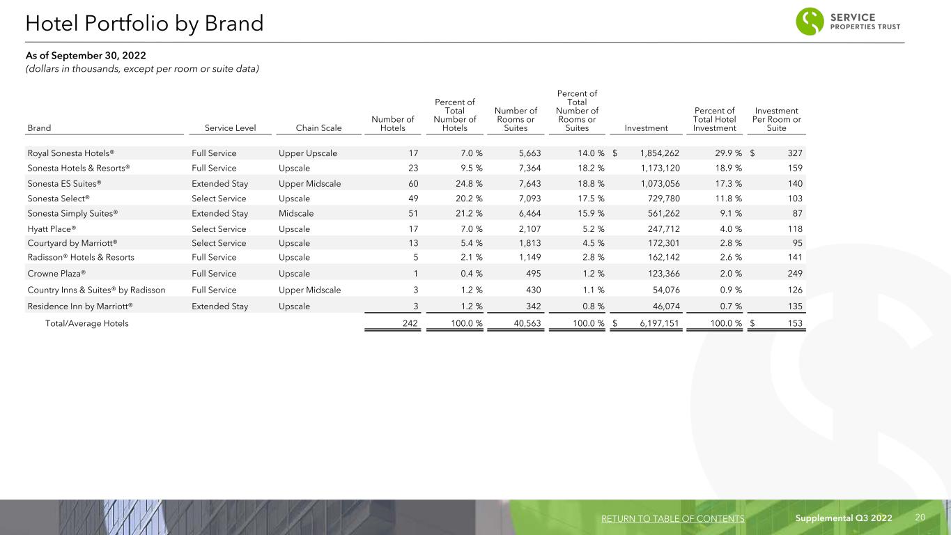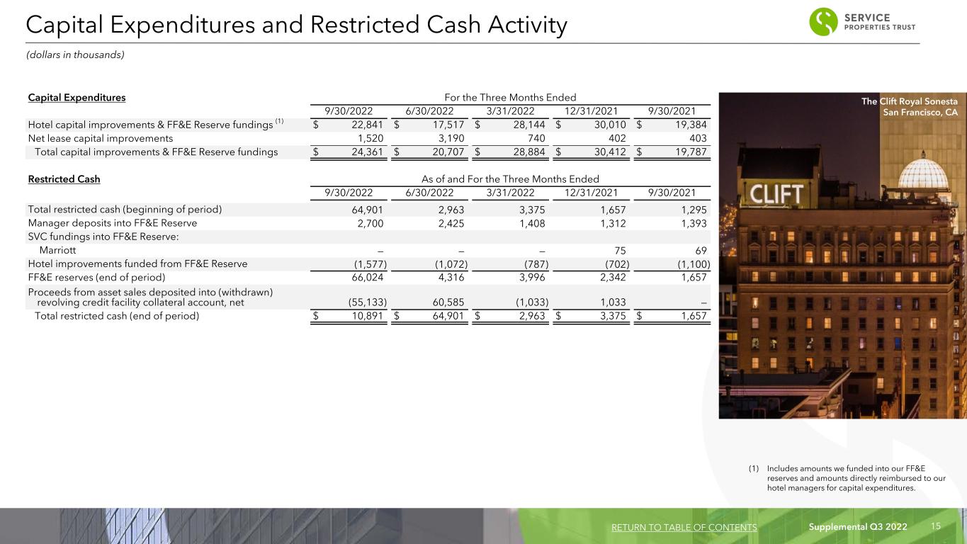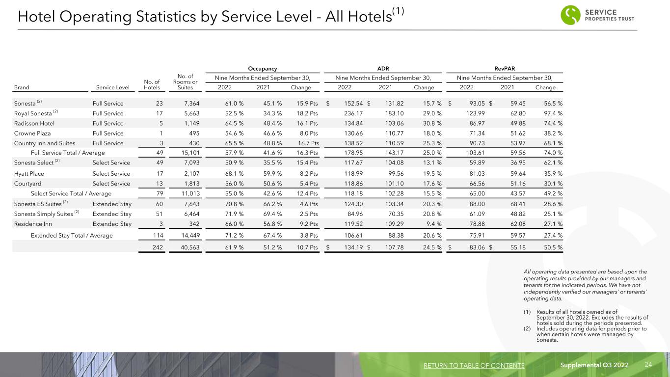 2022 年 9 月 30 日に終了した四半期に、SVC は 603 鍵のホテル 5 件をクロージングコスト控除後の総販売価格 2970 万ドルで売却し、総 賃借可能面積 14,056 平方フィートのネットリース物件 6 件をクロージングコスト控除後の総販売価格 110 万ドル で売却しました。2022 年 10 月 1 日から 2022 年 11 月 3 日にかけて、SVC は 120 鍵のホテル 1 件を売却し、売却価格合計はクロージング・コストを除き 600 万ドルとなりました。