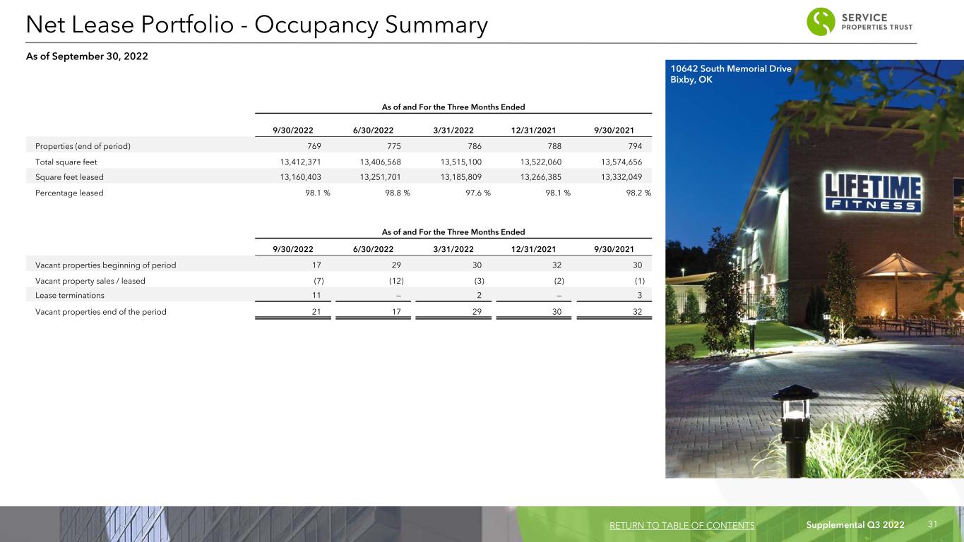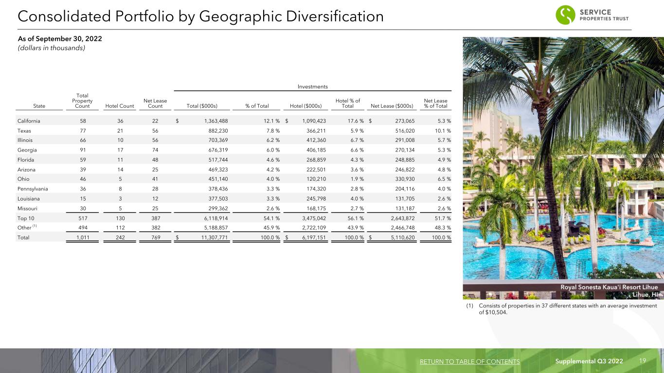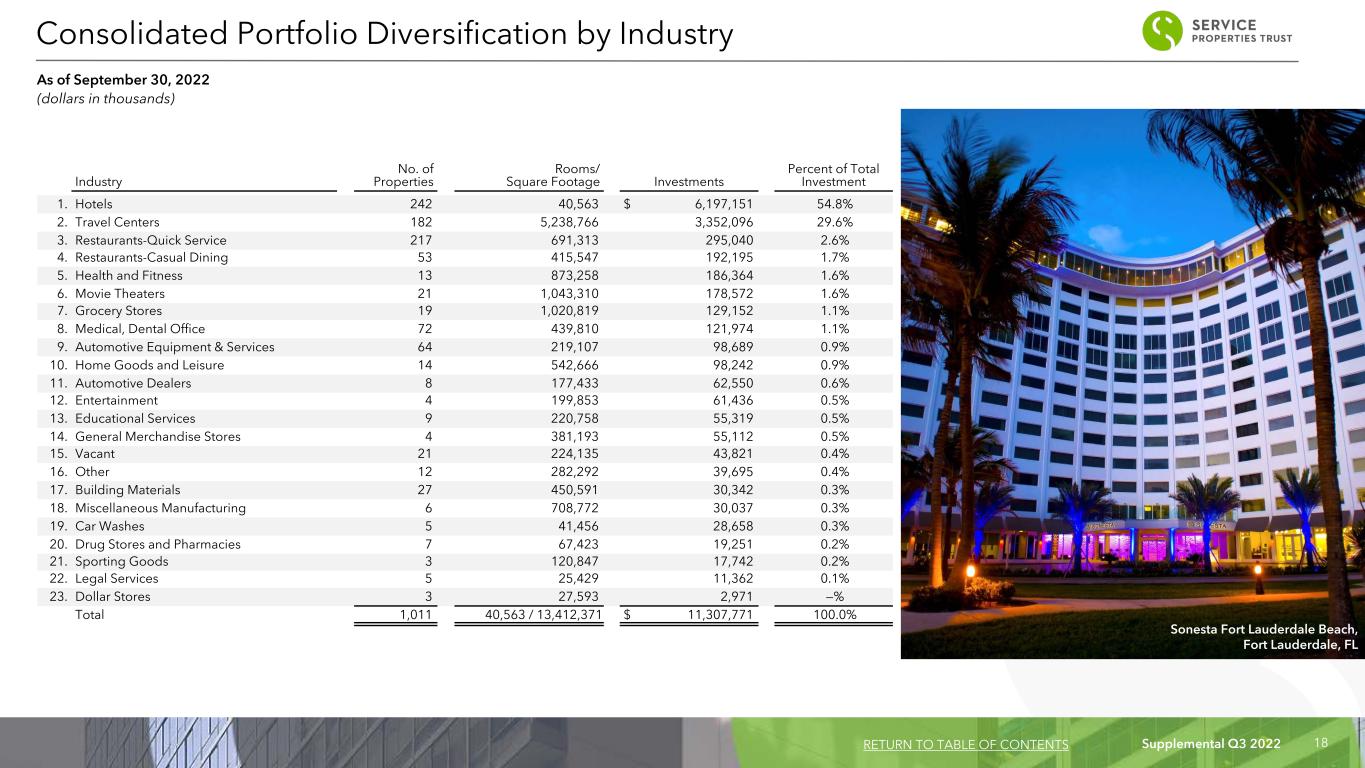 2022 年 9 月 30 日に終了した四半期に、SVC は 603 鍵のホテル 5 件をクロージングコスト控除後の総販売価格 2970 万ドルで売却し、総 賃借可能面積 14,056 平方フィートのネットリース物件 6 件をクロージングコスト控除後の総販売価格 110 万ドル で売却しました。2022 年 10 月 1 日から 2022 年 11 月 3 日にかけて、SVC は 120 鍵のホテル 1 件を売却し、売却価格合計はクロージング・コストを除き 600 万ドルとなりました。