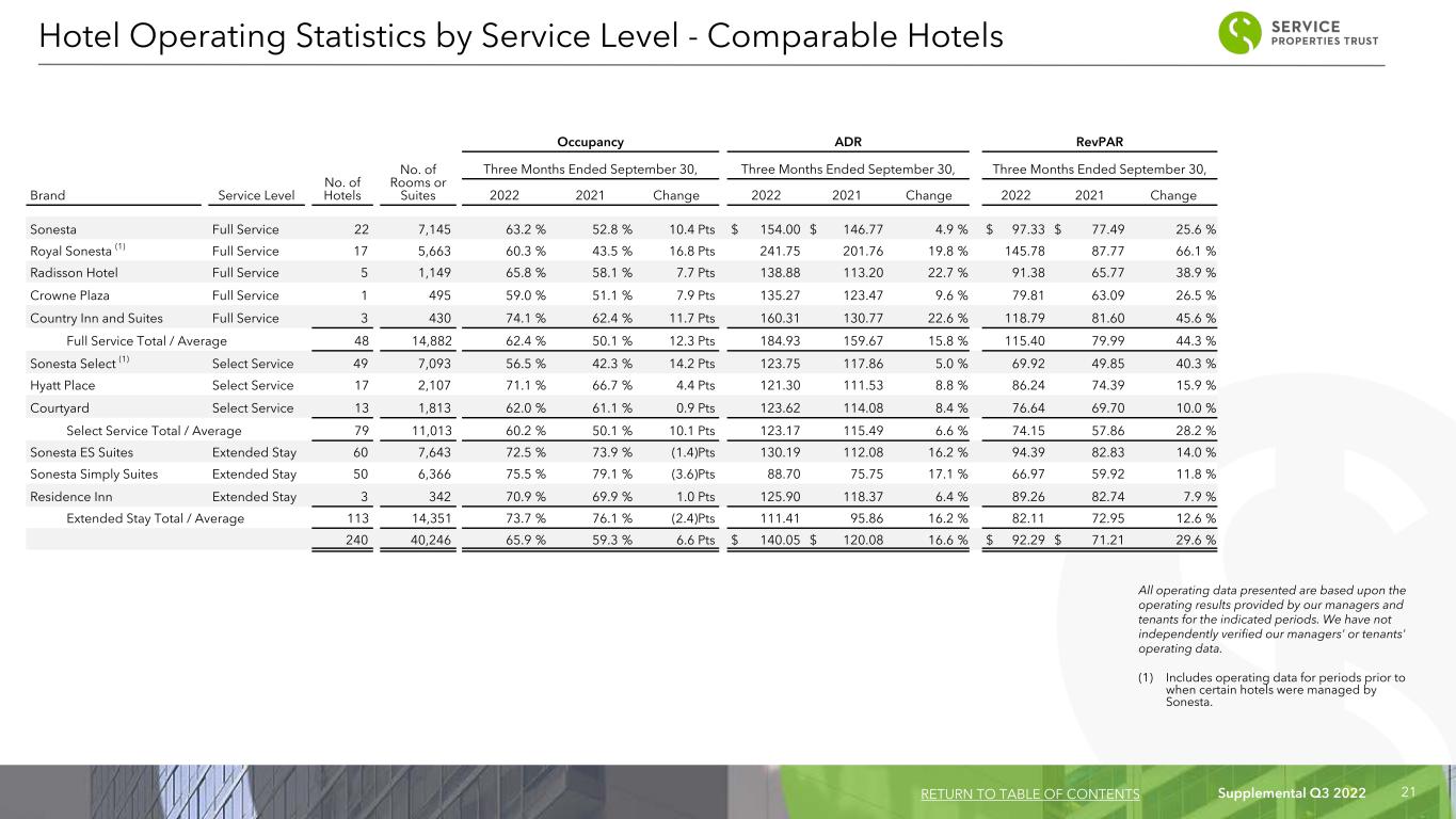 比較可能なホテルのデータ。SVC は、各期間の比較を容易にするため、RevPAR、ADR、客室稼働率を比較可能な基準で表示しています。SVCは、2022年9月30日時点で自社が所有し、比較対象期間の全期間において営業しているホテルを比較可能ホテルと定義しています。2022 年及び 2021 年 9 月 30 日に終了した第 3 四半期及び第 9 四半期については、比較対象期間の一部で営業停止となったホテル 3 軒を除外しています。