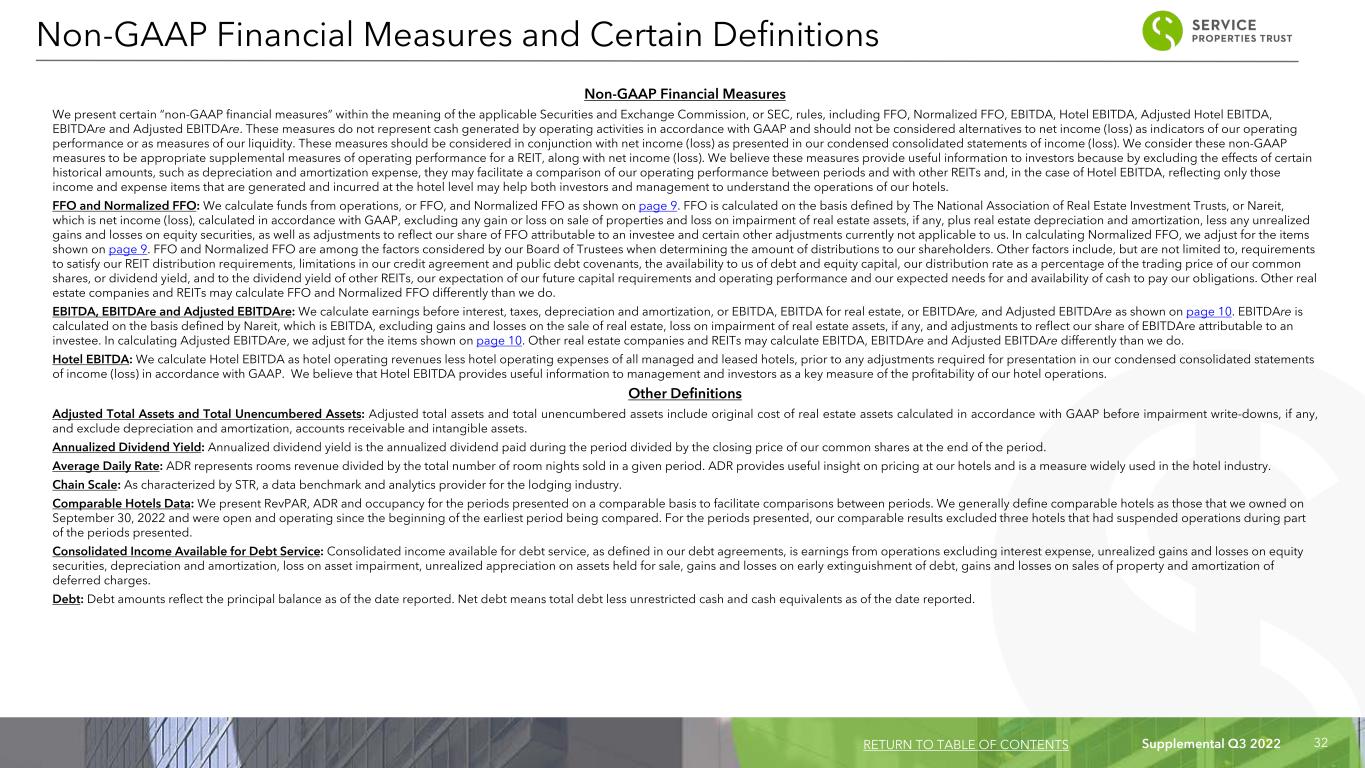 SVCは、営業利益(FFO)、正規化FFO、金利・税金・減価償却前利益(EBITDA)、ホテルEBITDA、不動産EBITDA、調整後EBITDAreなど、SECの規則で定められた特定の「非GAAP財務指標」を提示しています。これらの指標は、GAAPに基づく営業活動から生じたキャッシュを表すものではなく、SVCの営業成績や流動性の指標として当期純利益(損失)の代替指標として考慮されるべきものではありません。これらの指標は、SVC の要約連結損益計算書に記載されている当期純利益(損失)と併せて考慮される べきものです。SVC は、これらの Non-GAAP 方式を、当期純利益(損失)と共に、REIT の営業成績を表す適切な補足的指標であると考 えています。これらの指標は、減価償却費等の過去の実績の影響を除外することにより、SVC の営業成績を期 間比較や他の REIT との比較を容易にし、ホテル EBITDA については、ホテルレベルで発生する収益及び費用項目のみを反映することにより、 SVC のホテルの運営を投資家と経営者が理解する上で有用であると考えています。SVCは、ホテルEBITDAが、ホテル事業の収益性を測る重要な指標として、経営陣及び投資家に有用な情報を提供するものと考えています。