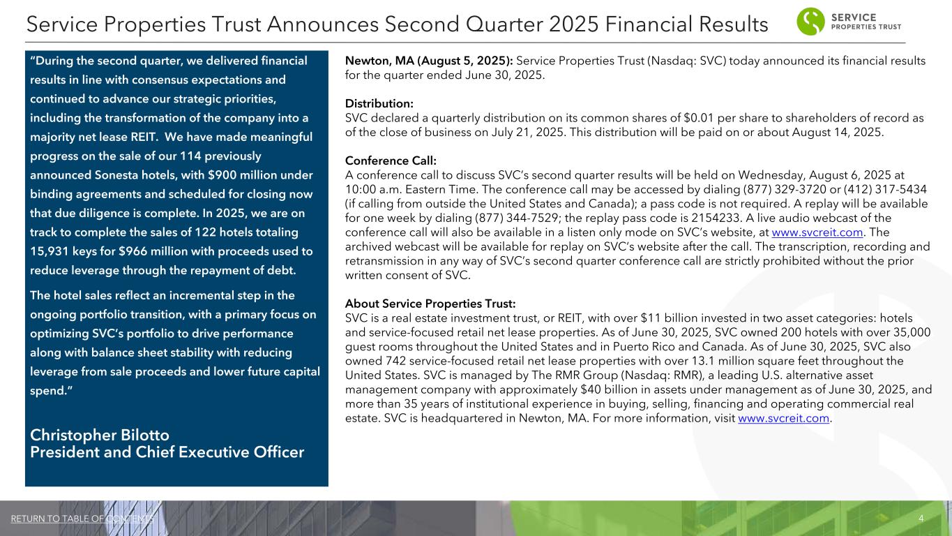 4RETURN TO TABLE OF CONTENTS Newton, MA (August 5, 2025): Service Properties Trust (Nasdaq: SVC) today announced its financial results for the quarter ended June 30, 2025. Distribution: SVC declared a quarterly distribution on its common shares of $0.01 per share to shareholders of record as of the close of business on July 21, 2025. This distribution will be paid on or about August 14, 2025. Conference Call: A conference call to discuss SVC’s second quarter results will be held on Wednesday, August 6, 2025 at 10:00 a.m. Eastern Time. The conference call may be accessed by dialing (877) 329-3720 or (412) 317-5434 (if calling from outside the United States and Canada); a pass code is not required. A replay will be available for one week by dialing (877) 344-7529; the replay pass code is 2154233. A live audio webcast of the conference call will also be available in a listen only mode on SVC’s website, at www.svcreit.com. The archived webcast will be available for replay on SVC’s website after the call. The transcription, recording and retransmission in any way of SVC’s second quarter conference call are strictly prohibited without the prior written consent of SVC. About Service Properties Trust: SVC is a real estate investment trust, or REIT, with over $11 billion invested in two asset categories: hotels and service-focused retail net lease properties. As of June 30, 2025, SVC owned 200 hotels with over 35,000 guest rooms throughout the United States and in Puerto Rico and Canada. As of June 30, 2025, SVC also owned 742 service-focused retail net lease properties with over 13.1 million square feet throughout the United States. SVC is managed by The RMR Group (Nasdaq: RMR), a leading U.S. alternative asset management company with approximately $40 billion in assets under management as of June 30, 2025, and more than 35 years of institutional experience in buying, selling, financing and operating commercial real estate. SVC is headquartered in Newton, MA. For more information, visit www.svcreit.com. Service Properties Trust Announces Second Quarter 2025 Financial Results “During the second quarter, we delivered financial results in line with consensus expectations and continued to advance our strategic priorities, including the transformation of the company into a majority net lease REIT. We have made meaningful progress on the sale of our 114 previously announced Sonesta hotels, with $900 million under binding agreements and scheduled for closing now that due diligence is complete. In 2025, we are on track to complete the sales of 122 hotels totaling 15,931 keys for $966 million with proceeds used to reduce leverage through the repayment of debt. The hotel sales reflect an incremental step in the ongoing portfolio transition, with a primary focus on optimizing SVC’s portfolio to drive performance along with balance sheet stability with reducing leverage from sale proceeds and lower future capital spend.” Christopher Bilotto President and Chief Executive Officer