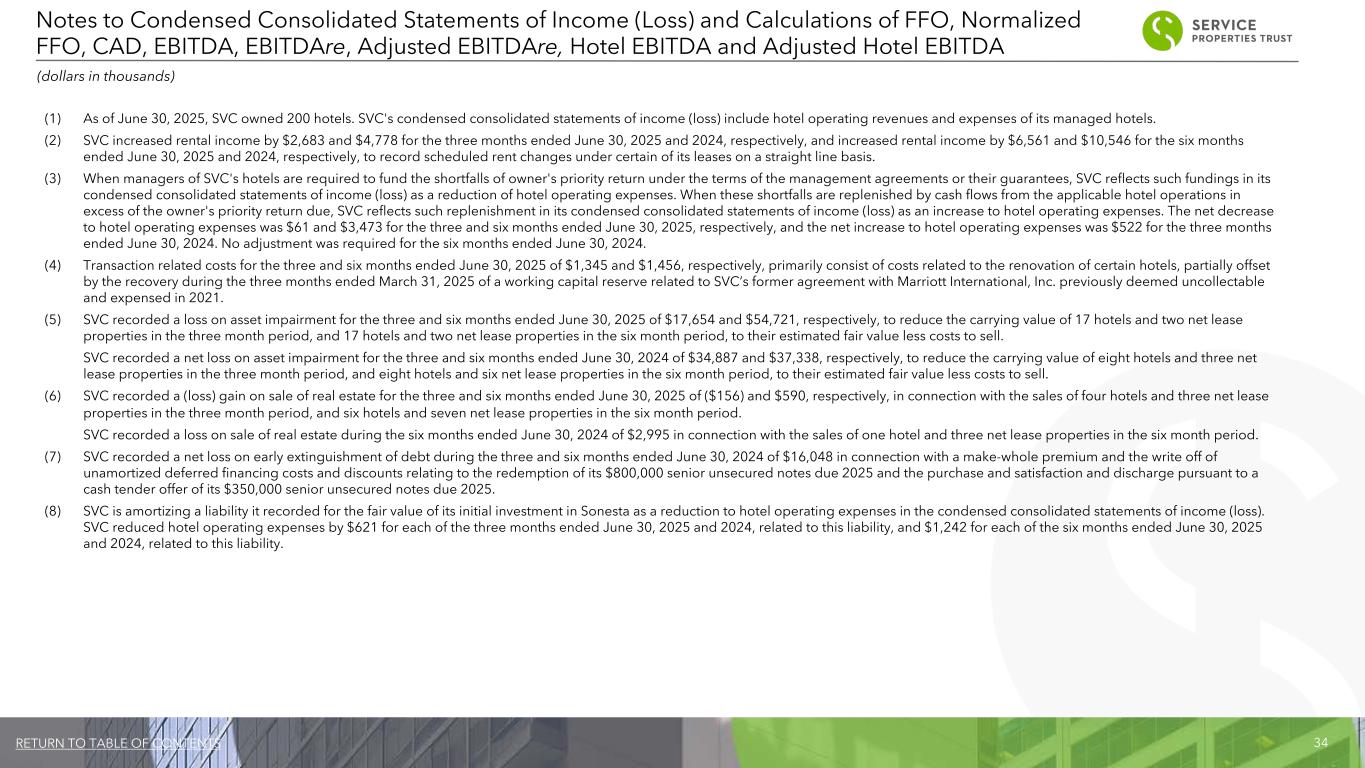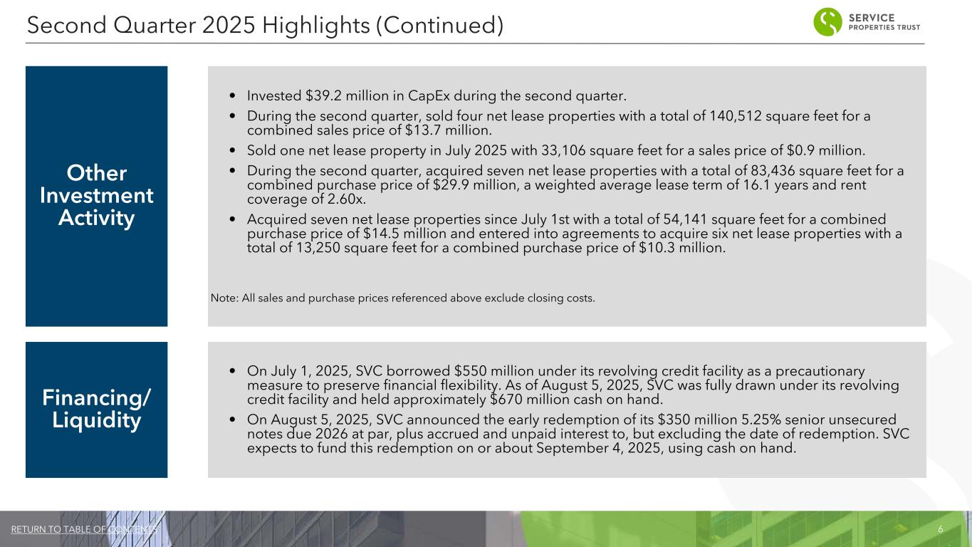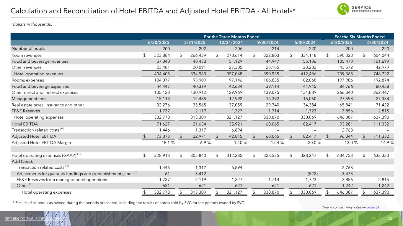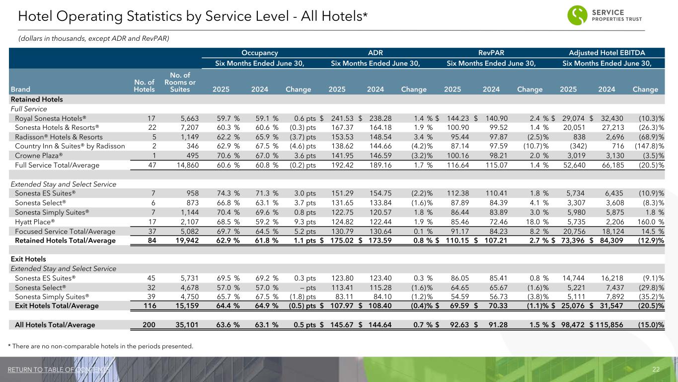 5RETURN TO TABLE OF CONTENTS Second Quarter 2025 Highlights Financial Results • Net loss of $38.2 million, or $0.23 per common share. • Normalized FFO of $57.6 million, or $0.35 per common share. • Adjusted EBITDAre of $163.8 million. Portfolio Update • Hotel RevPAR of $101.27. • Adjusted Hotel EBITDA of $73.1 million. • Net Lease occupancy of 97.3% as of June 30, 2025. • Net Lease rent coverage of 2.04x. Update on Hotel Sales • Entered into purchase and sale agreements for 114 hotels with a total of 14,925 keys for a combined sales price of $920 million.(1) ◦ Closings expected to occur late Q3 and Q4 2025. ◦ Proceeds expected to be used to repay debt, including amounts maturing in 2026 and amounts outstanding under the revolving credit facility. • SVC is no longer marketing for sale one full service hotel in Atlanta, GA. • During the second quarter, sold two hotels with a total of 258 keys for a combined sales price of $12.9 million. • Sold two hotels in July 2025 with a total of 234 keys for a combined sales price of $13.1 million. • Hotel sales proceeds expected to total $966 million in 2025. Note: All sales prices referenced above exclude closing costs. (1) Buyers waived all due diligence and provided non-refundable deposits without a financing contingency for 111 hotels ($900 million).