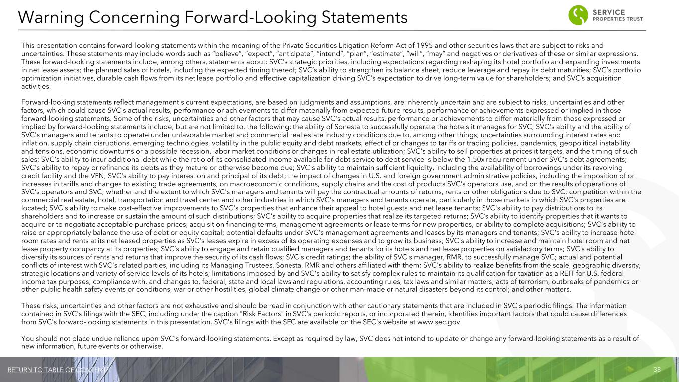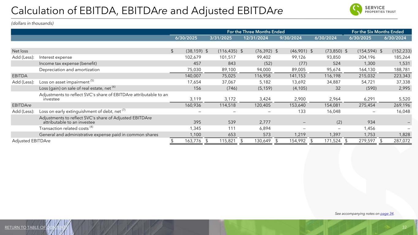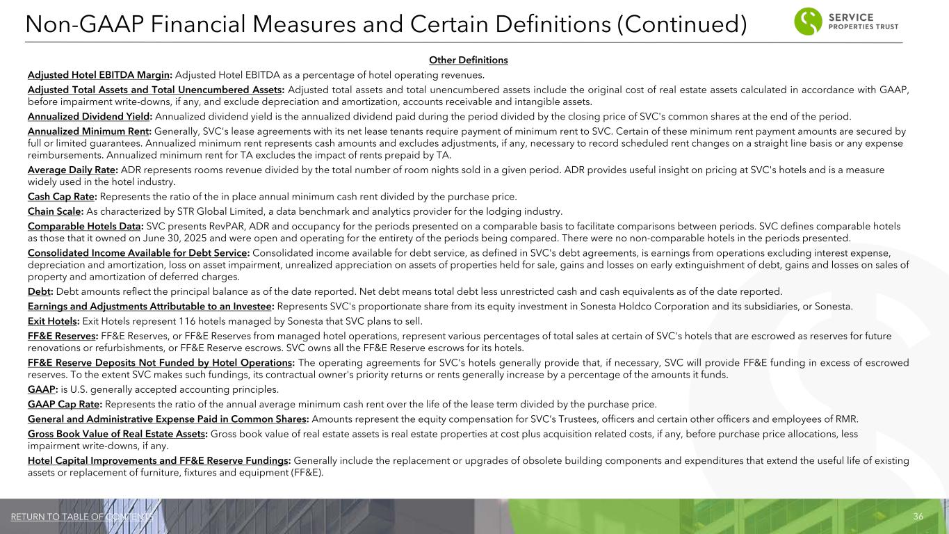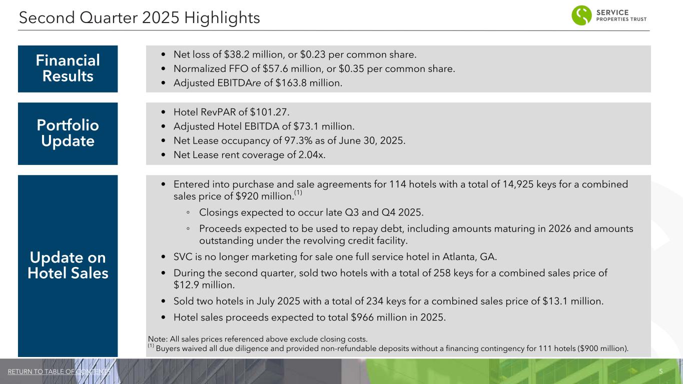 5RETURN TO TABLE OF CONTENTS Second Quarter 2025 Highlights Financial Results • Net loss of $38.2 million, or $0.23 per common share. • Normalized FFO of $57.6 million, or $0.35 per common share. • Adjusted EBITDAre of $163.8 million. Portfolio Update • Hotel RevPAR of $101.27. • Adjusted Hotel EBITDA of $73.1 million. • Net Lease occupancy of 97.3% as of June 30, 2025. • Net Lease rent coverage of 2.04x. Update on Hotel Sales • Entered into purchase and sale agreements for 114 hotels with a total of 14,925 keys for a combined sales price of $920 million.(1) ◦ Closings expected to occur late Q3 and Q4 2025. ◦ Proceeds expected to be used to repay debt, including amounts maturing in 2026 and amounts outstanding under the revolving credit facility. • SVC is no longer marketing for sale one full service hotel in Atlanta, GA. • During the second quarter, sold two hotels with a total of 258 keys for a combined sales price of $12.9 million. • Sold two hotels in July 2025 with a total of 234 keys for a combined sales price of $13.1 million. • Hotel sales proceeds expected to total $966 million in 2025. Note: All sales prices referenced above exclude closing costs. (1) Buyers waived all due diligence and provided non-refundable deposits without a financing contingency for 111 hotels ($900 million).