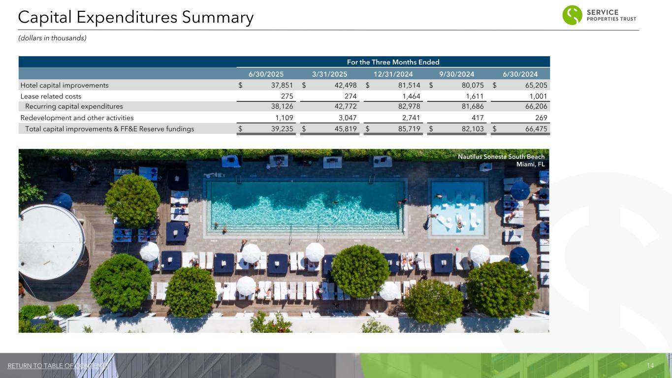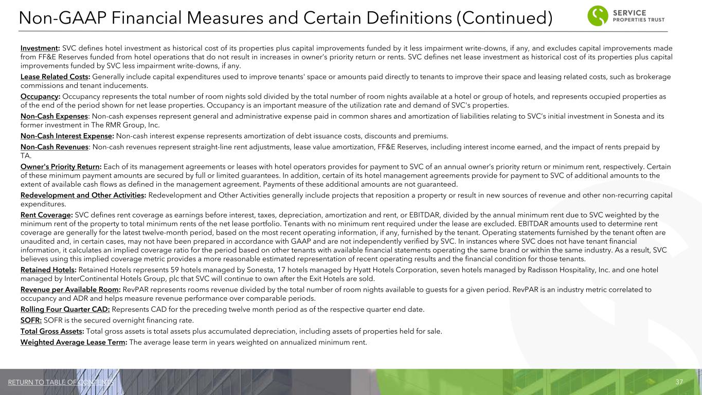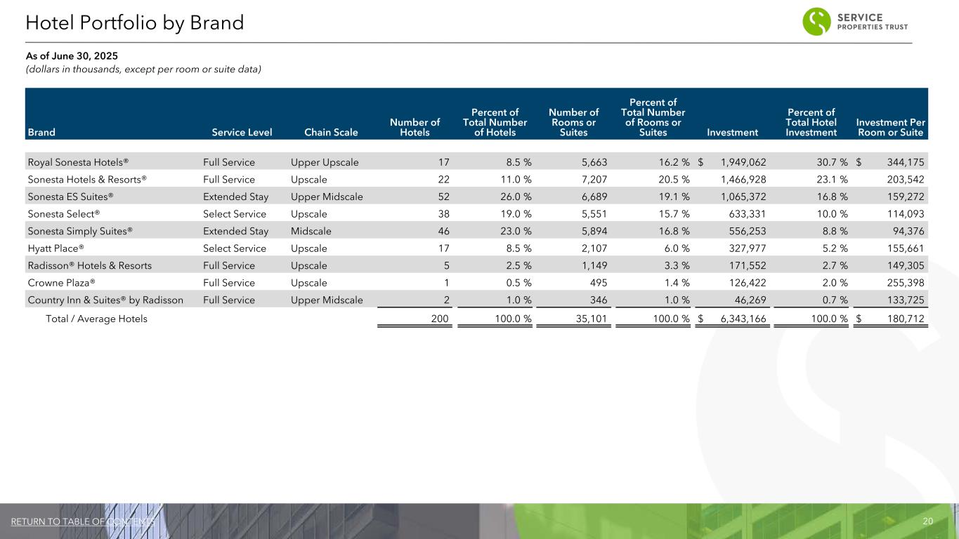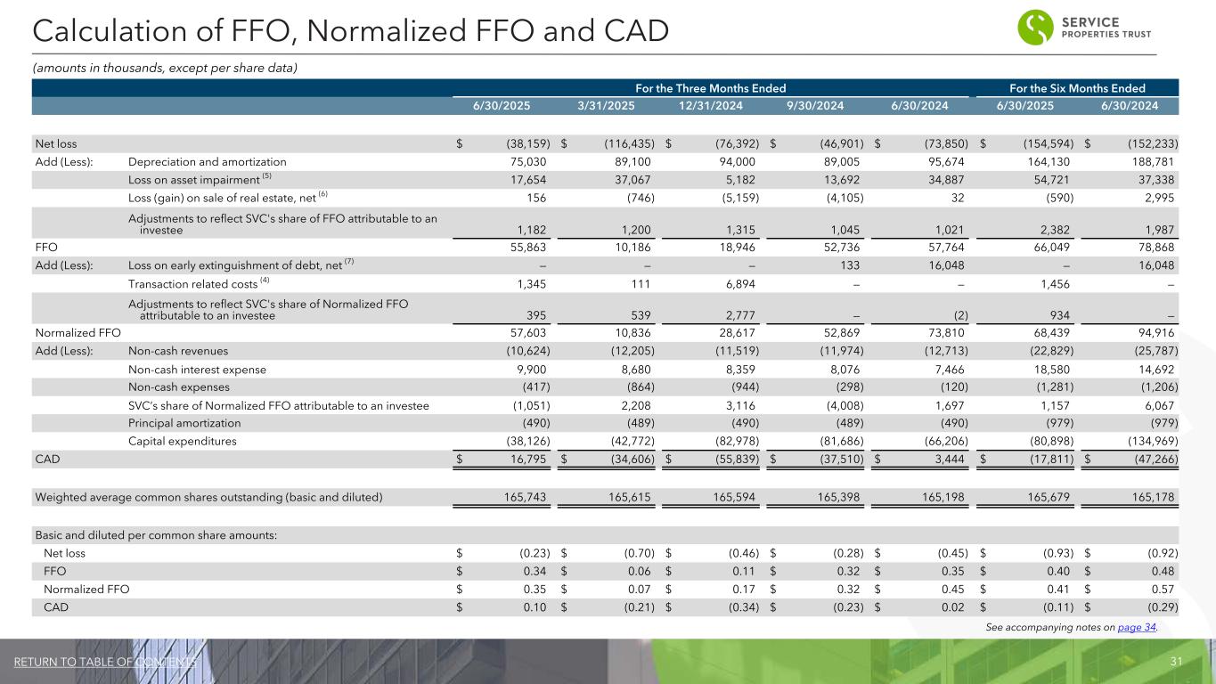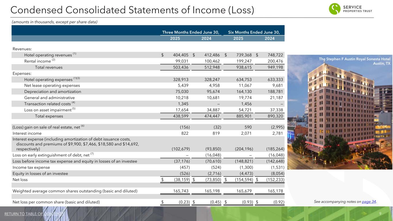 8RETURN TO TABLE OF CONTENTS As of and for the Three Months Ended 6/30/2025 3/31/2025 12/31/2024 9/30/2024 6/30/2024 Selected Income Statement Data: Total revenues $ 503,436 $ 435,179 $ 456,559 $ 491,171 $ 512,948 Net loss $ (38,159) $ (116,435) $ (76,392) $ (46,901) $ (73,850) FFO $ 55,863 $ 10,186 $ 18,946 $ 52,736 $ 57,764 Normalized FFO $ 57,603 $ 10,836 $ 28,617 $ 52,869 $ 73,810 CAD $ 16,795 $ (34,606) $ (55,839) $ (37,510) $ 3,444 Rolling four quarter CAD $ (111,160) $ (124,511) $ (140,615) $ (148,057) $ (95,378) Adjusted EBITDAre $ 163,776 $ 115,821 $ 130,649 $ 154,992 $ 171,524 Per Common Share Data (basic and diluted): Net loss $ (0.23) $ (0.70) $ (0.46) $ (0.28) $ (0.45) FFO $ 0.34 $ 0.06 $ 0.11 $ 0.32 $ 0.35 Normalized FFO $ 0.35 $ 0.07 $ 0.17 $ 0.32 $ 0.45 CAD $ 0.10 $ (0.21) $ (0.34) $ (0.23) $ 0.02 Rolling four quarter CAD $ (0.67) $ (0.75) $ (0.85) $ (0.90) $ (0.58) Dividend Data: Annualized dividends paid per share during the period $ 0.04 $ 0.04 $ 0.04 $ 0.80 $ 0.80 Annualized dividend yield (at end of period) 1.7 % 1.5 % 1.6 % 17.5 % 15.6 % Annualized Normalized FFO payout ratio 2.9 % 14.3 % 5.9 % 62.5 % 44.4 % Rolling four quarter CAD payout ratio (1) (5.9) % (5.3) % (4.7) % (88.9) % (137.9) % Selected Balance Sheet Data: Total gross assets $ 10,198,221 $ 10,244,066 $ 10,358,194 $ 10,278,496 $ 10,286,546 Total assets $ 6,932,512 $ 6,976,079 $ 7,119,558 $ 7,086,792 $ 7,121,661 Total liabilities $ 6,236,568 $ 6,241,506 $ 6,267,685 $ 6,157,773 $ 6,112,855 Total shareholders’ equity $ 695,944 $ 734,573 $ 851,873 $ 929,019 $ 1,008,806 (dollars in thousands, except per share data) Key Financial Data Sonesta ES Suites Fort Lauderdale, FL As of 6/30/2025 Capitalization: Total common shares (at end of period) 166,860,830 Closing price (at end of period) $ 2.39 Equity market capitalization (at end of period) $ 398,797 Debt (principal balance) 5,825,632 Total market capitalization $ 6,224,429 Liquidity: Cash and cash equivalents $ 63,176 Available borrowings under secured revolving credit facility (2) (3) 550,000 Available borrowings under secured variable funding note(4) — Total liquidity $ 613,176 (1) Reflects the annualized dividends paid per common share during the period as a percentage of rolling four quarter CAD per common share. (2) Availability under SVC's revolving credit facility is subject to meeting ongoing minimum performance and market values of the collateral properties, satisfying certain financial covenants and other credit facility conditions. (3) On July 1, 2025, SVC borrowed $550,000 under its revolving credit facility as a precautionary measure to preserve financial flexibility. As of August 5, 2025, SVC was fully drawn under its revolving credit facility. (4) As of June 30, 2025, SVC was fully drawn on its $45,000 variable funding note, or the VFN.