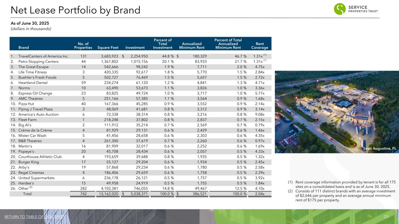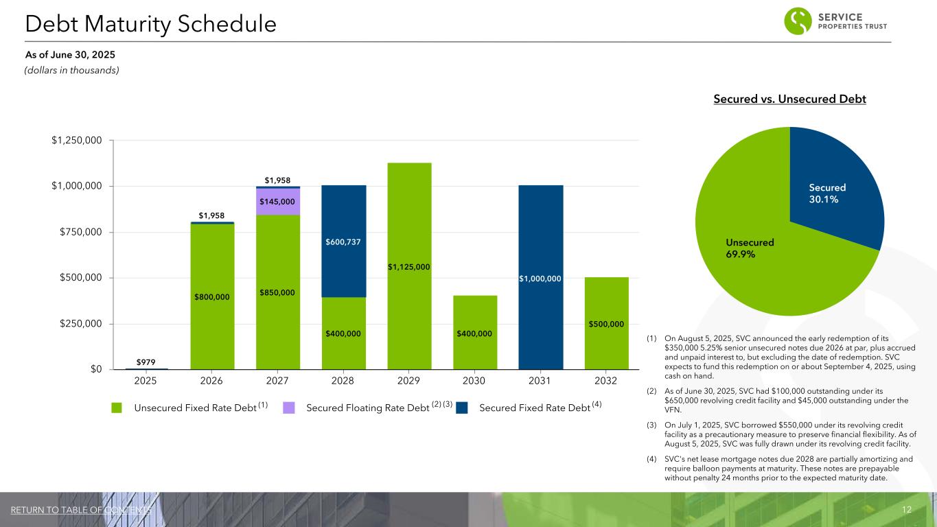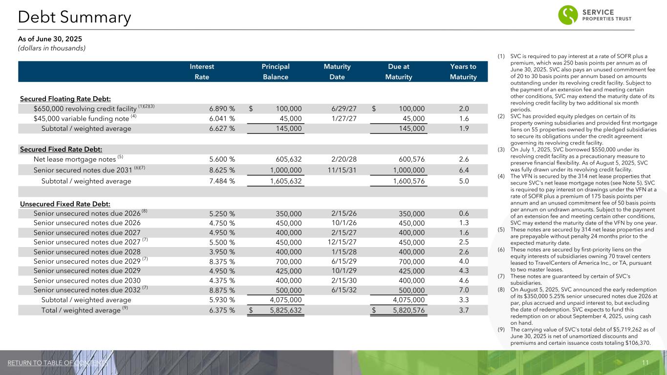 6RETURN TO TABLE OF CONTENTS Second Quarter 2025 Highlights (Continued) Other Investment Activity • Invested $39.2 million in CapEx during the second quarter. • During the second quarter, sold four net lease properties with a total of 140,512 square feet for a combined sales price of $13.7 million. • Sold one net lease property in July 2025 with 33,106 square feet for a sales price of $0.9 million. • During the second quarter, acquired seven net lease properties with a total of 83,436 square feet for a combined purchase price of $29.9 million, a weighted average lease term of 16.1 years and rent coverage of 2.60x. • Acquired seven net lease properties since July 1st with a total of 54,141 square feet for a combined purchase price of $14.5 million and entered into agreements to acquire six net lease properties with a total of 13,250 square feet for a combined purchase price of $10.3 million. Note: All sales and purchase prices referenced above exclude closing costs. Financing/ Liquidity • On July 1, 2025, SVC borrowed $550 million under its revolving credit facility as a precautionary measure to preserve financial flexibility. As of August 5, 2025, SVC was fully drawn under its revolving credit facility and held approximately $670 million cash on hand. • On August 5, 2025, SVC announced the early redemption of its $350 million 5.25% senior unsecured notes due 2026 at par, plus accrued and unpaid interest to, but excluding the date of redemption. SVC expects to fund this redemption on or about September 4, 2025, using cash on hand.
