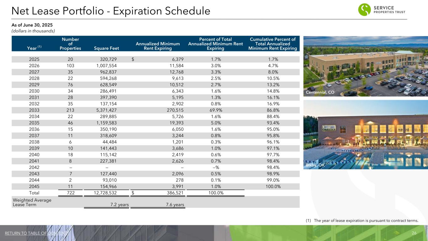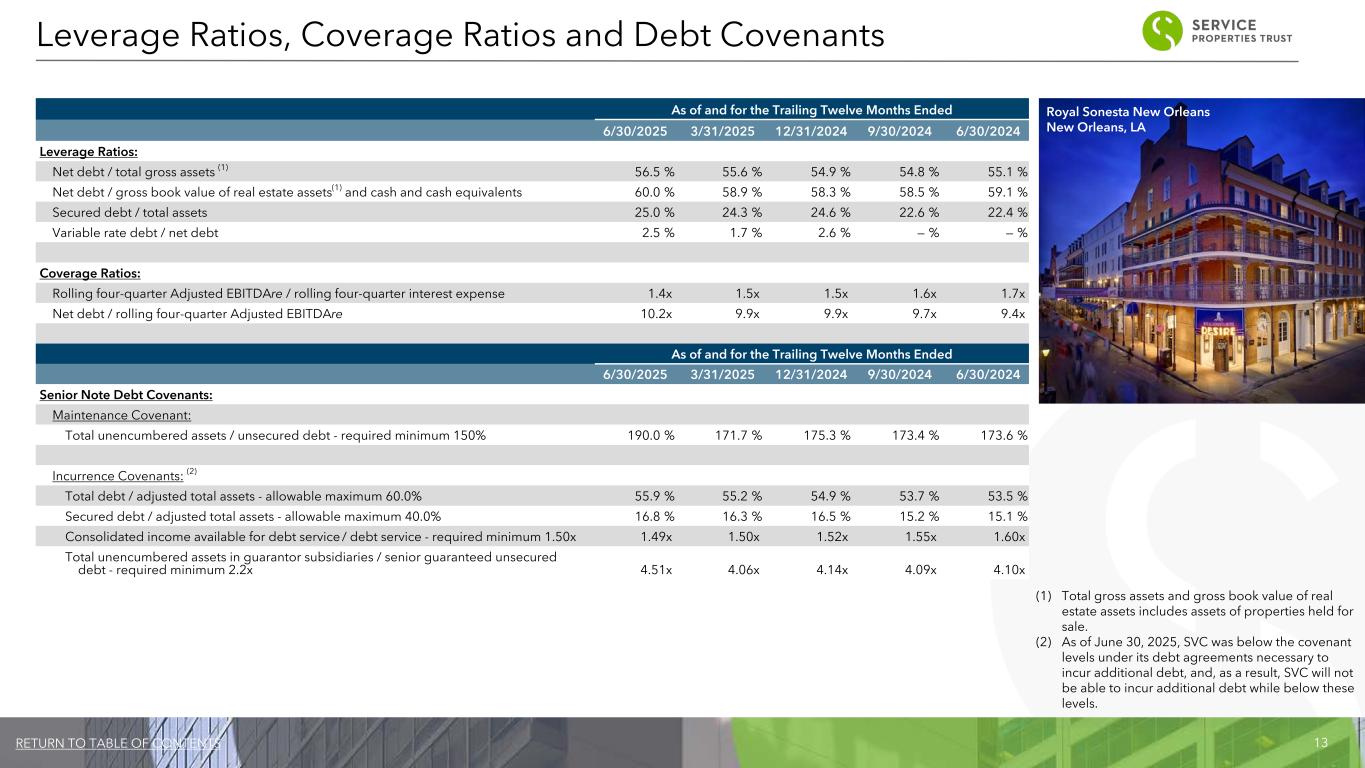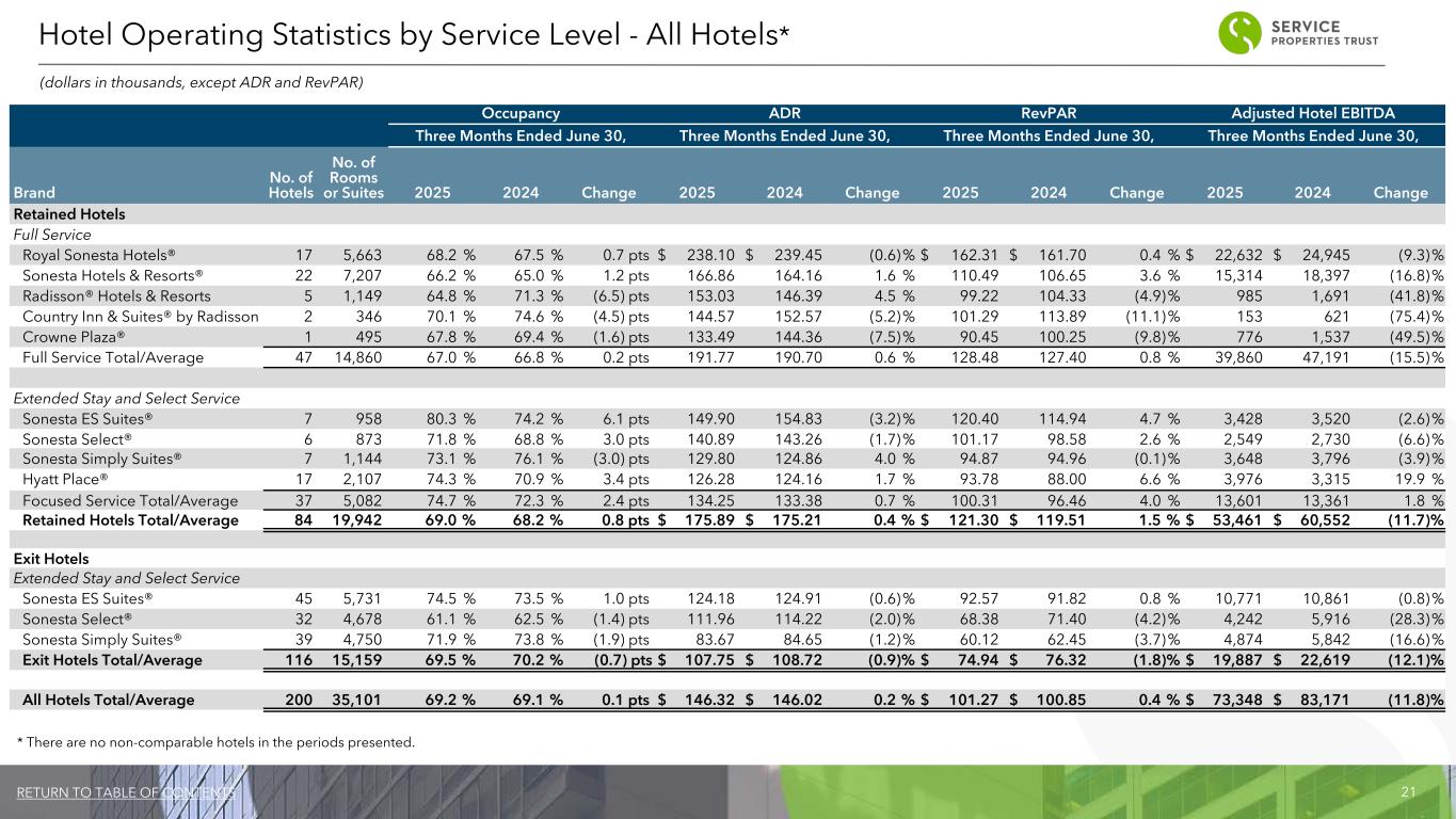 2 Table of Contents QUARTERLY RESULTS Service Properties Trust Announces Second Quarter 2025 Financial Results ..................................................................................................................... 4 Second Quarter 2025 Highlights .................................................................................................................................................................................................. 5 FINANCIALS Key Financial Data ............................................................................................................................................................................................................................ 8 Condensed Consolidated Statements of Income (Loss) .......................................................................................................................................................... 9 Condensed Consolidated Balance Sheets .................................................................................................................................................................................. 10 Debt Summary .................................................................................................................................................................................................................................. 11 Debt Maturity Schedule .................................................................................................................................................................................................................. 12 Leverage Ratios, Coverage Ratios and Debt Covenants .......................................................................................................................................................... 13 Capital Expenditures Summary ..................................................................................................................................................................................................... 14 Property Acquisitions and Dispositions ....................................................................................................................................................................................... 15 PORTFOLIO INFORMATION Portfolio Summary ............................................................................................................................................................................................................................ 17 Consolidated Portfolio Diversification by Industry .................................................................................................................................................................... 18 Consolidated Portfolio by Geographical Diversification .......................................................................................................................................................... 19 Hotel Portfolio by Brand .................................................................................................................................................................................................................. 20 Hotel Operating Statistics by Service Level - All Hotels - Three Months Ended June 30, 2025 ........................................................................................ 21 Hotel Operating Statistics by Service Level - All Hotels - Six Months Ended June 30, 2025 ............................................................................................. 22 Net Lease Portfolio by Brand ......................................................................................................................................................................................................... 23 Net Lease Portfolio by Industry ...................................................................................................................................................................................................... 24 Net Lease Portfolio by Tenant (Top 10) ....................................................................................................................................................................................... 25 Net Lease Portfolio - Expiration Schedule ................................................................................................................................................................................... 26 Net Lease Portfolio - Occupancy Summary ................................................................................................................................................................................. 27 APPENDIX Company Profile and Research Coverage .................................................................................................................................................................................. 29 Governance Information ................................................................................................................................................................................................................. 30 Calculation of FFO, Normalized FFO and CAD .......................................................................................................................................................................... 31 Calculation of EBITDA, EBITDAre and Adjusted EBITDAre ..................................................................................................................................................... 32 Calculation and Reconciliation of Hotel EBITDA and Adjusted Hotel EBITDA - All Hotels ................................................................................................ 33 Notes to Condensed Consolidated Statements of Income (Loss) and Calculations of FFO, Normalized FFO, CAD, EBITDA, EBITDAre, Adjusted EBITDAre, Hotel EBITDA and Adjusted Hotel EBITDA ...........