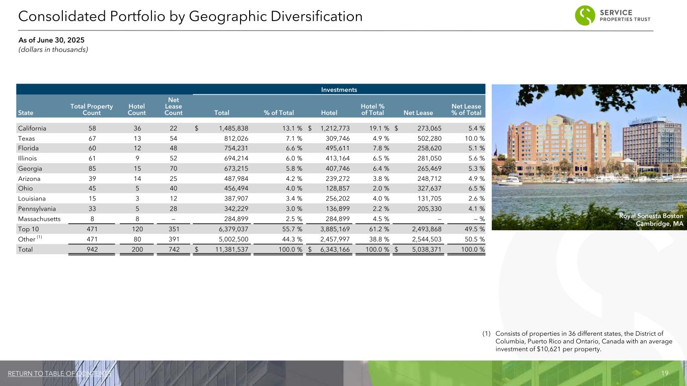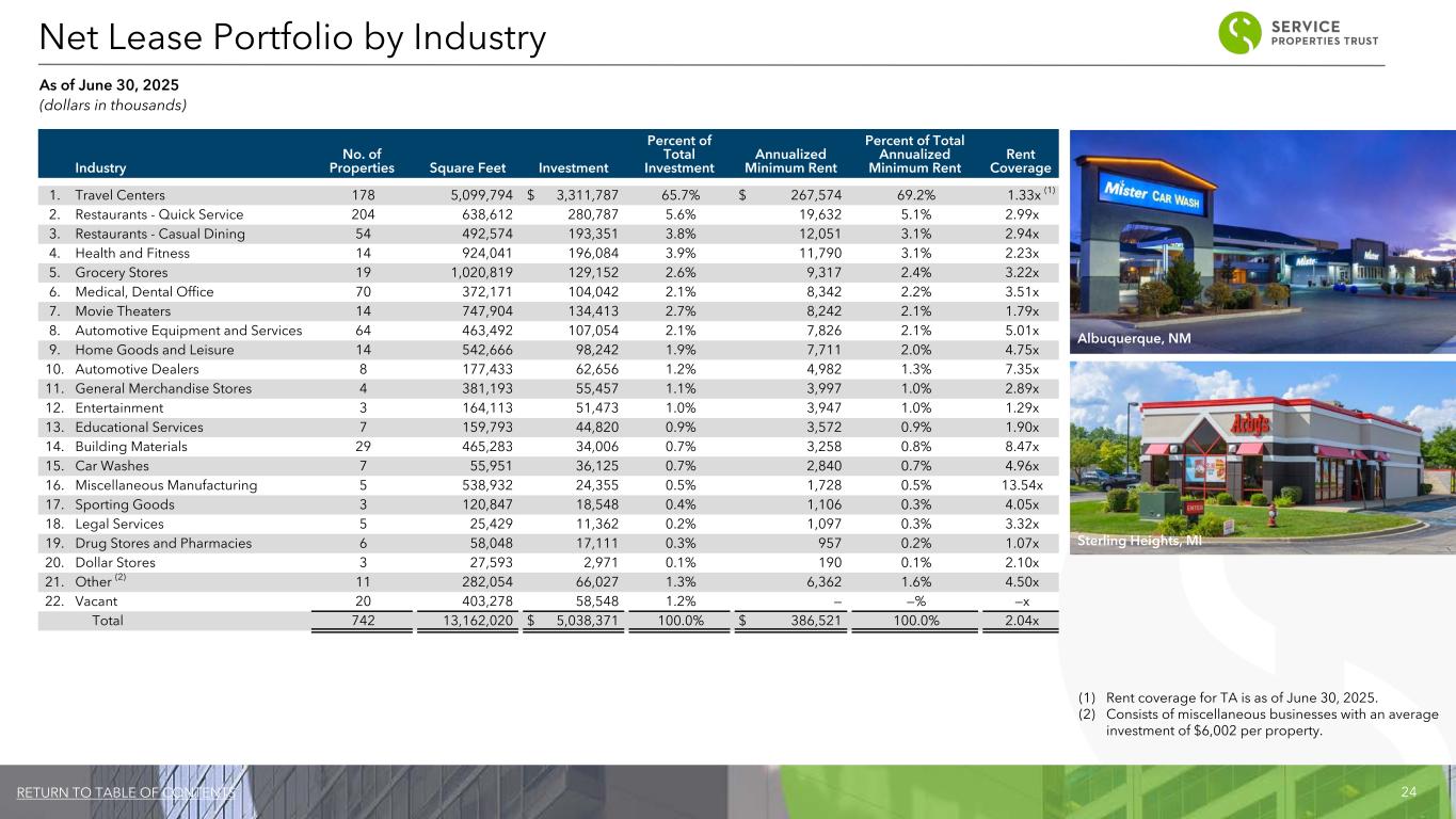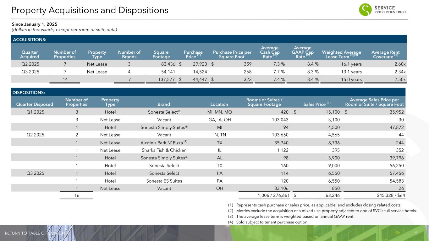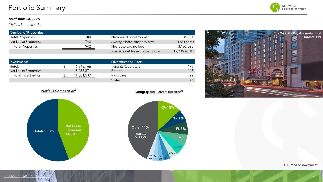 2 Table of Contents QUARTERLY RESULTS Service Properties Trust Announces Second Quarter 2025 Financial Results ..................................................................................................................... 4 Second Quarter 2025 Highlights .................................................................................................................................................................................................. 5 FINANCIALS Key Financial Data ............................................................................................................................................................................................................................ 8 Condensed Consolidated Statements of Income (Loss) .......................................................................................................................................................... 9 Condensed Consolidated Balance Sheets .................................................................................................................................................................................. 10 Debt Summary .................................................................................................................................................................................................................................. 11 Debt Maturity Schedule .................................................................................................................................................................................................................. 12 Leverage Ratios, Coverage Ratios and Debt Covenants .......................................................................................................................................................... 13 Capital Expenditures Summary ..................................................................................................................................................................................................... 14 Property Acquisitions and Dispositions ....................................................................................................................................................................................... 15 PORTFOLIO INFORMATION Portfolio Summary ............................................................................................................................................................................................................................ 17 Consolidated Portfolio Diversification by Industry .................................................................................................................................................................... 18 Consolidated Portfolio by Geographical Diversification .......................................................................................................................................................... 19 Hotel Portfolio by Brand .................................................................................................................................................................................................................. 20 Hotel Operating Statistics by Service Level - All Hotels - Three Months Ended June 30, 2025 ........................................................................................ 21 Hotel Operating Statistics by Service Level - All Hotels - Six Months Ended June 30, 2025 ............................................................................................. 22 Net Lease Portfolio by Brand ......................................................................................................................................................................................................... 23 Net Lease Portfolio by Industry ...................................................................................................................................................................................................... 24 Net Lease Portfolio by Tenant (Top 10) ....................................................................................................................................................................................... 25 Net Lease Portfolio - Expiration Schedule ................................................................................................................................................................................... 26 Net Lease Portfolio - Occupancy Summary ................................................................................................................................................................................. 27 APPENDIX Company Profile and Research Coverage .................................................................................................................................................................................. 29 Governance Information ................................................................................................................................................................................................................. 30 Calculation of FFO, Normalized FFO and CAD .......................................................................................................................................................................... 31 Calculation of EBITDA, EBITDAre and Adjusted EBITDAre ..................................................................................................................................................... 32 Calculation and Reconciliation of Hotel EBITDA and Adjusted Hotel EBITDA - All Hotels ................................................................................................ 33 Notes to Condensed Consolidated Statements of Income (Loss) and Calculations of FFO, Normalized FFO, CAD, EBITDA, EBITDAre, Adjusted EBITDAre, Hotel EBITDA and Adjusted Hotel EBITDA ...........
