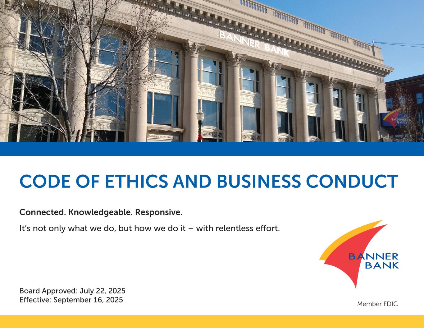 OUR GUIDING PRINCIPLES OUR VISION We want Banner Bank to be the Bank of Choice in the markets we serve. We are committed to being the best provider of financial services in the markets in which we operate. OUR VALUES • Do the Right Thing – Our actions will be guided by ethical principles. If we make a mistake, we’ll own up to it and work with clients to develop a solution. • Honesty and Integrity – We expect nothing less from one another. We commit to an honest relationship with our clients, and we will behave with integrity so as to protect our clients’ money and privacy. • Mutual Respect – We treat our clients, our vendors, and our employees with dignity and respect, always. • Quality – We continuously strive to improve in everything we do. • Trust – We know that earning and keeping the trust of our clients, our regulators, our fellow employees, and our shareholders is critical to our ongoing success. • Teamwork – We recognize that we need one another to meet the needs of our clients. Our teams will strive to work across business units and geographies to make sure our clients get the best possible service and product solutions. • Accountability – We accept accountability for our actions and hold one another to equally high accountability standards. MISSION STATEMENT Across our business, we strive to work as a team to deliver superior products and services to our valued clients. We emphasize strong client relationships and a high level of community involvement. Our culture attracts, empowers, rewards, and provides growth opportunities for our respected colleagues. Our success builds long-term shareholder value. Banner Bank Code of Ethics and Business Conduct | Page 1