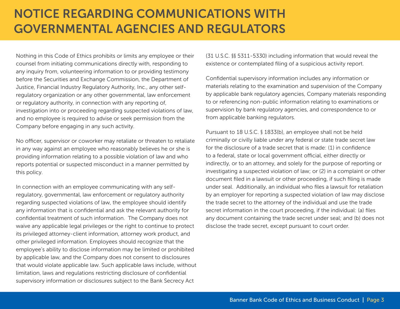 NOTICE REGARDING COMMUNICATIONS WITH GOVERNMENTAL AGENCIES AND REGULATORS Nothing in this Code of Ethics prohibits or limits any employee or their counsel from initiating communications directly with, responding to any inquiry from, volunteering information to or providing testimony before the Securities and Exchange Commission, the Department of Justice, Financial Industry Regulatory Authority, Inc., any other self- regulatory organization or any other governmental, law enforcement or regulatory authority, in connection with any reporting of, investigation into or proceeding regarding suspected violations of law, and no employee is required to advise or seek permission from the Company before engaging in any such activity. No officer, supervisor or coworker may retaliate or threaten to retaliate in any way against an employee who reasonably believes he or she is providing information relating to a possible violation of law and who reports potential or suspected misconduct in a manner permitted by this policy. In connection with an employee communicating with any self- regulatory, governmental, law enforcement or regulatory authority regarding suspected violations of law, the employee should identify any information that is confidential and ask the relevant authority for confidential treatment of such information. The Company does not waive any applicable legal privileges or the right to continue to protect its privileged attorney-client information, attorney work product, and other privileged information. Employees should recognize that the employee’s ability to disclose information may be limited or prohibited by applicable law, and the Company does not consent to disclosures that would violate applicable law. Such applicable laws include, without limitation, laws and regulations restricting disclosure of confidential supervisory information or disclosures subject to the Bank Secrecy Act (31 U.S.C. §§ 5311-5330) including information that would reveal the existence or contemplated filing of a suspicious activity report. Confidential supervisory information includes any information or materials relating to the examination and supervision of the Company by applicable bank regulatory agencies, Company materials responding to or referencing non-public information relating to examinations or supervision by bank regulatory agencies, and correspondence to or from applicable banking regulators. Pursuant to 18 U.S.C. § 1833(b), an employee shall not be held criminally or civilly liable under any federal or state trade secret law for the disclosure of a trade secret that is made: (1) in confidence to a federal, state or local government official, either directly or indirectly, or to an attorney, and solely for the purpose of reporting or investigating a suspected violation of law; or (2) in a complaint or other document filed in a lawsuit or other proceeding, if such filing is made under seal. Additionally, an individual who files a lawsuit for retaliation by an employer for reporting a suspected violation of law may disclose the trade secret to the attorney of the individual and use the trade secret information in the court proceeding, if the individual: (a) files any document containing the trade secret under seal; and (b) does not disclose the trade secret, except pursuant to court order. Banner Bank Code of Ethics and Business Conduct | Page 3
