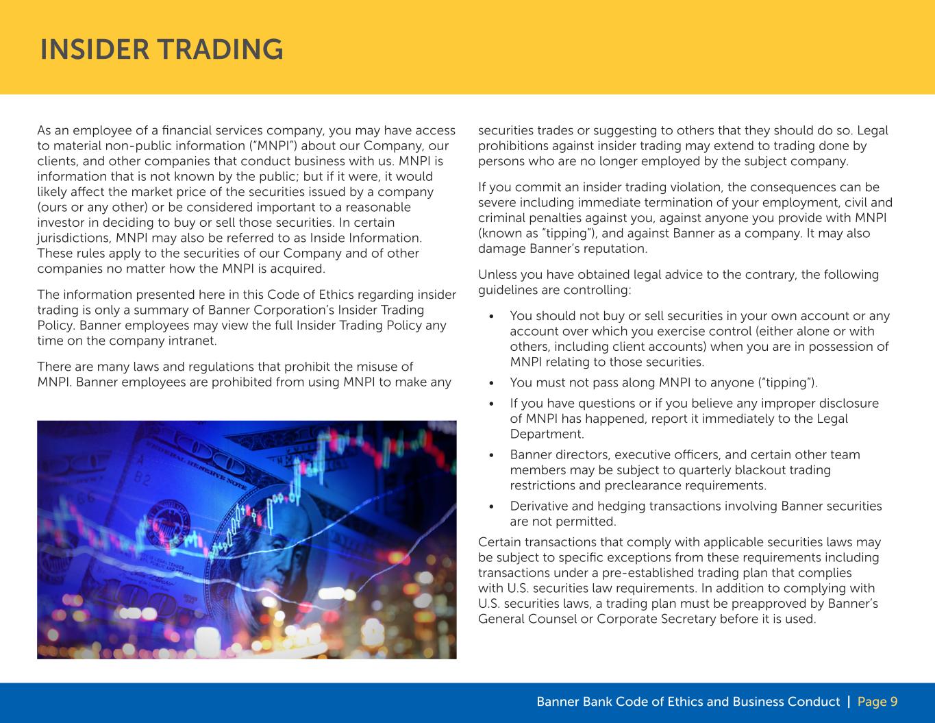 INSIDER TRADING As an employee of a financial services company, you may have access to material non-public information (“MNPI”) about our Company, our clients, and other companies that conduct business with us. MNPI is information that is not known by the public; but if it were, it would likely affect the market price of the securities issued by a company (ours or any other) or be considered important to a reasonable investor in deciding to buy or sell those securities. In certain jurisdictions, MNPI may also be referred to as Inside Information. These rules apply to the securities of our Company and of other companies no matter how the MNPI is acquired. The information presented here in this Code of Ethics regarding insider trading is only a summary of Banner Corporation’s Insider Trading Policy. Banner employees may view the full Insider Trading Policy any time on the company intranet. There are many laws and regulations that prohibit the misuse of MNPI. Banner employees are prohibited from using MNPI to make any securities trades or suggesting to others that they should do so. Legal prohibitions against insider trading may extend to trading done by persons who are no longer employed by the subject company. If you commit an insider trading violation, the consequences can be severe including immediate termination of your employment, civil and criminal penalties against you, against anyone you provide with MNPI (known as “tipping”), and against Banner as a company. It may also damage Banner’s reputation. Unless you have obtained legal advice to the contrary, the following guidelines are controlling: • You should not buy or sell securities in your own account or any account over which you exercise control (either alone or with others, including client accounts) when you are in possession of MNPI relating to those securities. • You must not pass along MNPI to anyone (“tipping”). • If you have questions or if you believe any improper disclosure of MNPI has happened, report it immediately to the Legal Department. • Banner directors, executive officers, and certain other team members may be subject to quarterly blackout trading restrictions and preclearance requirements. • Derivative and hedging transactions involving Banner securities are not permitted. Certain transactions that comply with applicable securities laws may be subject to specific exceptions from these requirements including transactions under a pre-established trading plan that complies with U.S. securities law requirements. In addition to complying with U.S. securities laws, a trading plan must be preapproved by Banner’s General Counsel or Corporate Secretary before it is used. Banner Bank Code of Ethics and Business Conduct | Page 9