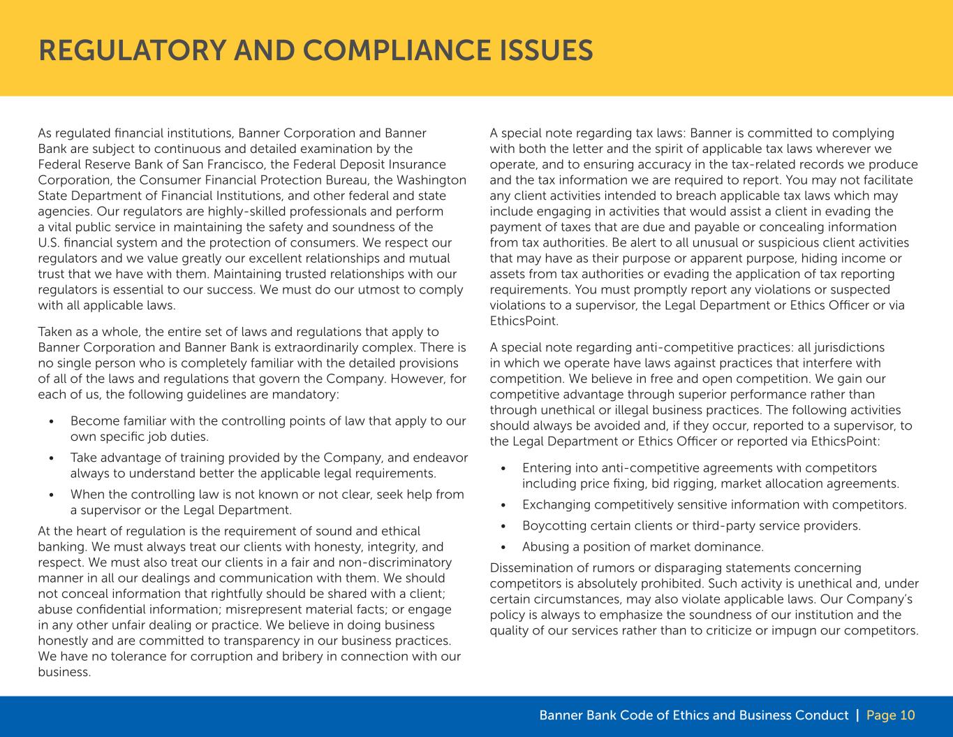 REGULATORY AND COMPLIANCE ISSUES As regulated financial institutions, Banner Corporation and Banner Bank are subject to continuous and detailed examination by the Federal Reserve Bank of San Francisco, the Federal Deposit Insurance Corporation, the Consumer Financial Protection Bureau, the Washington State Department of Financial Institutions, and other federal and state agencies. Our regulators are highly-skilled professionals and perform a vital public service in maintaining the safety and soundness of the U.S. financial system and the protection of consumers. We respect our regulators and we value greatly our excellent relationships and mutual trust that we have with them. Maintaining trusted relationships with our regulators is essential to our success. We must do our utmost to comply with all applicable laws. Taken as a whole, the entire set of laws and regulations that apply to Banner Corporation and Banner Bank is extraordinarily complex. There is no single person who is completely familiar with the detailed provisions of all of the laws and regulations that govern the Company. However, for each of us, the following guidelines are mandatory: • Become familiar with the controlling points of law that apply to our own specific job duties. • Take advantage of training provided by the Company, and endeavor always to understand better the applicable legal requirements. • When the controlling law is not known or not clear, seek help from a supervisor or the Legal Department. At the heart of regulation is the requirement of sound and ethical banking. We must always treat our clients with honesty, integrity, and respect. We must also treat our clients in a fair and non-discriminatory manner in all our dealings and communication with them. We should not conceal information that rightfully should be shared with a client; abuse confidential information; misrepresent material facts; or engage in any other unfair dealing or practice. We believe in doing business honestly and are committed to transparency in our business practices. We have no tolerance for corruption and bribery in connection with our business. A special note regarding tax laws: Banner is committed to complying with both the letter and the spirit of applicable tax laws wherever we operate, and to ensuring accuracy in the tax-related records we produce and the tax information we are required to report. You may not facilitate any client activities intended to breach applicable tax laws which may include engaging in activities that would assist a client in evading the payment of taxes that are due and payable or concealing information from tax authorities. Be alert to all unusual or suspicious client activities that may have as their purpose or apparent purpose, hiding income or assets from tax authorities or evading the application of tax reporting requirements. You must promptly report any violations or suspected violations to a supervisor, the Legal Department or Ethics Officer or via EthicsPoint. A special note regarding anti-competitive practices: all jurisdictions in which we operate have laws against practices that interfere with competition. We believe in free and open competition. We gain our competitive advantage through superior performance rather than through unethical or illegal business practices. The following activities should always be avoided and, if they occur, reported to a supervisor, to the Legal Department or Ethics Officer or reported via EthicsPoint: • Entering into anti-competitive agreements with competitors including price fixing, bid rigging, market allocation agreements. • Exchanging competitively sensitive information with competitors. • Boycotting certain clients or third-party service providers. • Abusing a position of market dominance. Dissemination of rumors or disparaging statements concerning competitors is absolutely prohibited. Such activity is unethical and, under certain circumstances, may also violate applicable laws. Our Company’s policy is always to emphasize the soundness of our institution and the quality of our services rather than to criticize or impugn our competitors. Banner Bank Code of Ethics and Business Conduct | Page 10