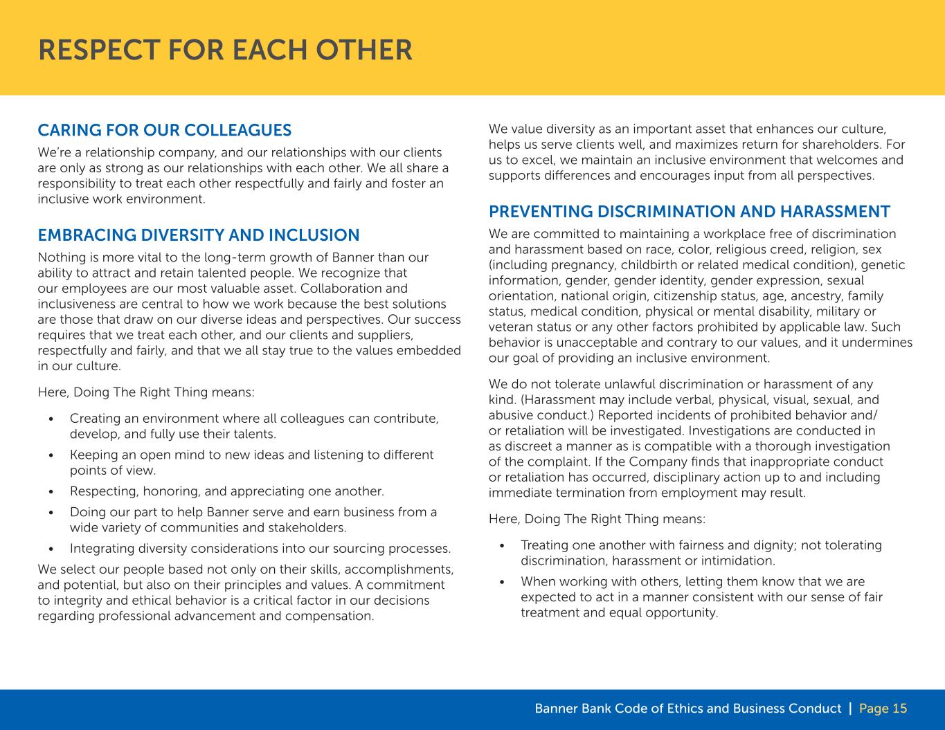 RESPECT FOR EACH OTHER CARING FOR OUR COLLEAGUES We’re a relationship company, and our relationships with our clients are only as strong as our relationships with each other. We all share a responsibility to treat each other respectfully and fairly and foster an inclusive work environment. EMBRACING DIVERSITY AND INCLUSION Nothing is more vital to the long-term growth of Banner than our ability to attract and retain talented people. We recognize that our employees are our most valuable asset. Collaboration and inclusiveness are central to how we work because the best solutions are those that draw on our diverse ideas and perspectives. Our success requires that we treat each other, and our clients and suppliers, respectfully and fairly, and that we all stay true to the values embedded in our culture. Here, Doing The Right Thing means: • Creating an environment where all colleagues can contribute, develop, and fully use their talents. • Keeping an open mind to new ideas and listening to different points of view. • Respecting, honoring, and appreciating one another. • Doing our part to help Banner serve and earn business from a wide variety of communities and stakeholders. • Integrating diversity considerations into our sourcing processes. We select our people based not only on their skills, accomplishments, and potential, but also on their principles and values. A commitment to integrity and ethical behavior is a critical factor in our decisions regarding professional advancement and compensation. We value diversity as an important asset that enhances our culture, helps us serve clients well, and maximizes return for shareholders. For us to excel, we maintain an inclusive environment that welcomes and supports differences and encourages input from all perspectives. PREVENTING DISCRIMINATION AND HARASSMENT We are committed to maintaining a workplace free of discrimination and harassment based on race, color, religious creed, religion, sex (including pregnancy, childbirth or related medical condition), genetic information, gender, gender identity, gender expression, sexual orientation, national origin, citizenship status, age, ancestry, family status, medical condition, physical or mental disability, military or veteran status or any other factors prohibited by applicable law. Such behavior is unacceptable and contrary to our values, and it undermines our goal of providing an inclusive environment. We do not tolerate unlawful discrimination or harassment of any kind. (Harassment may include verbal, physical, visual, sexual, and abusive conduct.) Reported incidents of prohibited behavior and/ or retaliation will be investigated. Investigations are conducted in as discreet a manner as is compatible with a thorough investigation of the complaint. If the Company finds that inappropriate conduct or retaliation has occurred, disciplinary action up to and including immediate termination from employment may result. Here, Doing The Right Thing means: • Treating one another with fairness and dignity; not tolerating discrimination, harassment or intimidation. • When working with others, letting them know that we are expected to act in a manner consistent with our sense of fair treatment and equal opportunity. Banner Bank Code of Ethics and Business Conduct | Page 15