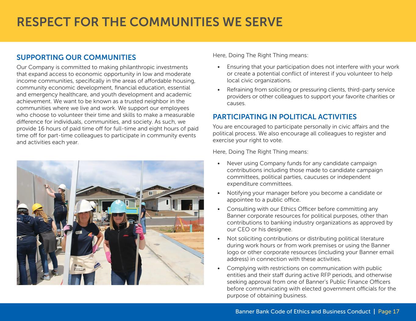 RESPECT FOR THE COMMUNITIES WE SERVE SUPPORTING OUR COMMUNITIES Our Company is committed to making philanthropic investments that expand access to economic opportunity in low and moderate income communities, specifically in the areas of affordable housing, community economic development, financial education, essential and emergency healthcare, and youth development and academic achievement. We want to be known as a trusted neighbor in the communities where we live and work. We support our employees who choose to volunteer their time and skills to make a measurable difference for individuals, communities, and society. As such, we provide 16 hours of paid time off for full-time and eight hours of paid time off for part-time colleagues to participate in community events and activities each year. Here, Doing The Right Thing means: • Ensuring that your participation does not interfere with your work or create a potential conflict of interest if you volunteer to help local civic organizations. • Refraining from soliciting or pressuring clients, third-party service providers or other colleagues to support your favorite charities or causes. PARTICIPATING IN POLITICAL ACTIVITIES You are encouraged to participate personally in civic affairs and the political process. We also encourage all colleagues to register and exercise your right to vote. Here, Doing The Right Thing means: • Never using Company funds for any candidate campaign contributions including those made to candidate campaign committees, political parties, caucuses or independent expenditure committees. • Notifying your manager before you become a candidate or appointee to a public office. • Consulting with our Ethics Officer before committing any Banner corporate resources for political purposes, other than contributions to banking industry organizations as approved by our CEO or his designee. • Not soliciting contributions or distributing political literature during work hours or from work premises or using the Banner logo or other corporate resources (including your Banner email address) in connection with these activities. • Complying with restrictions on communication with public entities and their staff during active RFP periods, and otherwise seeking approval from one of Banner’s Public Finance Officers before communicating with elected government officials for the purpose of obtaining business. Banner Bank Code of Ethics and Business Conduct | Page 17