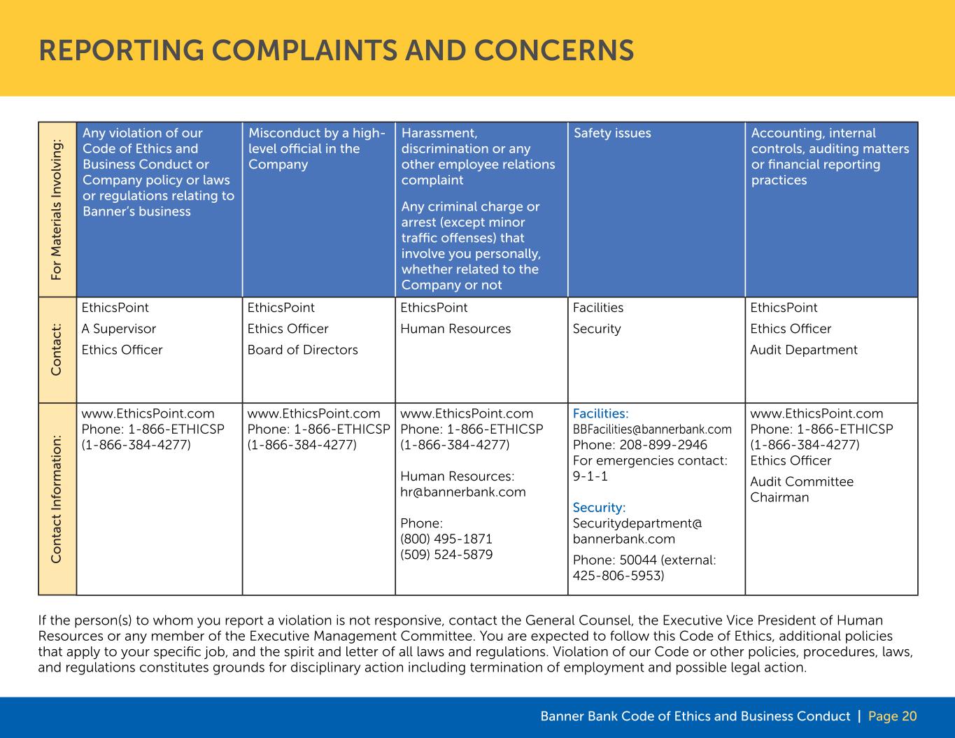 REPORTING COMPLAINTS AND CONCERNS Fo r M at e ri al s In vo lv in g : Any violation of our Code of Ethics and Business Conduct or Company policy or laws or regulations relating to Banner’s business Misconduct by a high- level official in the Company Harassment, discrimination or any other employee relations complaint Any criminal charge or arrest (except minor traffic offenses) that involve you personally, whether related to the Company or not Safety issues Accounting, internal controls, auditing matters or financial reporting practices C o n ta c t: EthicsPoint A Supervisor Ethics Officer EthicsPoint Ethics Officer Board of Directors EthicsPoint Human Resources Facilities Security EthicsPoint Ethics Officer Audit Department C o n ta ct In fo rm at io n : www.EthicsPoint.com Phone: 1-866-ETHICSP (1-866-384-4277) www.EthicsPoint.com Phone: 1-866-ETHICSP (1-866-384-4277) www.EthicsPoint.com Phone: 1-866-ETHICSP (1-866-384-4277) Human Resources: hr@bannerbank.com Phone: (800) 495-1871 (509) 524-5879 Facilities: BBFacilities@bannerbank.com Phone: 208-899-2946 For emergencies contact: 9-1-1 Security: Securitydepartment@ bannerbank.com Phone: 50044 (external: 425-806-5953) www.EthicsPoint.com Phone: 1-866-ETHICSP (1-866-384-4277) Ethics Officer Audit Committee Chairman If the person(s) to whom you report a violation is not responsive, contact the General Counsel, the Executive Vice President of Human Resources or any member of the Executive Management Committee. You are expected to follow this Code of Ethics, additional policies that apply to your specific job, and the spirit and letter of all laws and regulations. Violation of our Code or other policies, procedures, laws, and regulations constitutes grounds for disciplinary action including termination of employment and possible legal action. Banner Bank Code of Ethics and Business Conduct | Page 20
