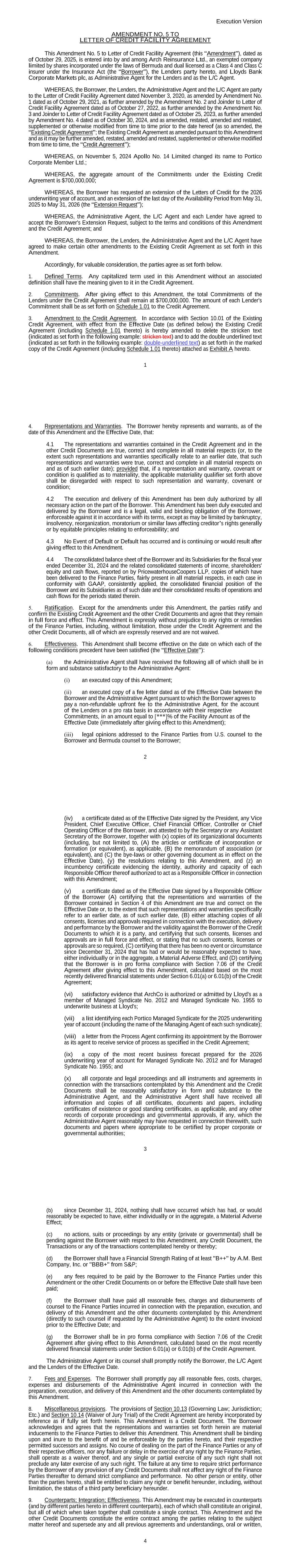 Execution Version 1 AMENDMENT NO. 5 TO LETTER OF CREDIT FACILITY AGREEMENT This Amendment No. 5 to Letter of Credit Facility Agreement (this “Amendment”), dated as of October 29, 2025, is entered into by and among Arch Reinsurance Ltd., an exempted company limited by shares incorporated under the laws of Bermuda and dual licensed as a Class 4 and Class C insurer under the Insurance Act (the “Borrower”), the Lenders party hereto, and Lloyds Bank Corporate Markets plc, as Administrative Agent for the Lenders and as the L/C Agent. WHEREAS, the Borrower, the Lenders, the Administrative Agent and the L/C Agent are party to the Letter of Credit Facility Agreement dated November 3, 2020, as amended by Amendment No. 1 dated as of October 29, 2021, as further amended by the Amendment No. 2 and Joinder to Letter of Credit Facility Agreement dated as of October 27, 2022, as further amended by the Amendment No. 3 and Joinder to Letter of Credit Facility Agreement dated as of October 25, 2023, as further amended by Amendment No. 4 dated as of October 30, 2024, and as amended, restated, amended and restated, supplemented or otherwise modified from time to time prior to the date hereof (as so amended, the “Existing Credit Agreement”; the Existing Credit Agreement as amended pursuant to this Amendment and as it may be further amended, restated, amended and restated, supplemented or otherwise modified from time to time, the “Credit Agreement”); WHEREAS, on November 5, 2024 Apollo No. 14 Limited changed its name to Portico Corporate Member Ltd.; WHEREAS, the aggregate amount of the Commitments under the Existing Credit Agreement is $700,000,000; WHEREAS, the Borrower has requested an extension of the Letters of Credit for the 2026 underwriting year of account, and an extension of the last day of the Availability Period from May 31, 2025 to May 31, 2026 (the “Extension Request”); WHEREAS, the Administrative Agent, the L/C Agent and each Lender have agreed to accept the Borrower's Extension Request, subject to the terms and conditions of this Amendment and the Credit Agreement; and WHEREAS, the Borrower, the Lenders, the Administrative Agent and the L/C Agent have agreed to make certain other amendments to the Existing Credit Agreement as set forth in this Amendment. Accordingly, for valuable consideration, the parties agree as set forth below. 1. Defined Terms. Any capitalized term used in this Amendment without an associated definition shall have the meaning given to it in the Credit Agreement. 2. Commitments. After giving effect to this Amendment, the total Commitments of the Lenders under the Credit Agreement shall remain at $700,000,000. The amount of each Lender's Commitment shall be as set forth on Schedule 1.01 to the Credit Agreement. 3. Amendment to the Credit Agreement. In accordance with Section 10.01 of the Existing Credit Agreement, with effect from the Effective Date (as defined below) the Existing Credit Agreement (including Schedule 1.01 thereto) is hereby amended to delete the stricken text (indicated as set forth in the following example: stricken text) and to add the double underlined text (indicated as set forth in the following example: double-underlined text) as set forth in the marked copy of the Credit Agreement (including Schedule 1.01 thereto) attached as Exhibit A hereto. 2 4. Representations and Warranties. The Borrower hereby represents and warrants, as of the date of this Amendment and the Effective Date, that: 4.1 The representations and warranties contained in the Credit Agreement and in the other Credit Documents are true, correct and complete in all material respects (or, to the extent such representations and warranties specifically relate to an earlier date, that such representations and warranties were true, correct and complete in all material respects on and as of such earlier date); provided that, if a representation and warranty, covenant or condition is qualified as to materiality, the applicable materiality qualifier set forth above shall be disregarded with respect to such representation and warranty, covenant or condition; 4.2 The execution and delivery of this Amendment has been duly authorized by all necessary action on the part of the Borrower. This Amendment has been duly executed and delivered by the Borrower and is a legal, valid and binding obligation of the Borrower, enforceable against it in accordance with its terms, except as may be limited by bankruptcy, insolvency, reorganization, moratorium or similar laws affecting creditor’s rights generally or by equitable principles relating to enforceability; and 4.3 No Event of Default or Default has occurred and is continuing or would result after giving effect to this Amendment. 4.4 The consolidated balance sheet of the Borrower and its Subsidiaries for the fiscal year ended December 31, 2024 and the related consolidated statements of income, shareholders' equity and cash flows, reported on by PricewaterhouseCoopers LLP, copies of which have been delivered to the Finance Parties, fairly present in all material respects, in each case in conformity with GAAP, consistently applied, the consolidated financial position of the Borrower and its Subsidiaries as of such date and their consolidated results of operations and cash flows for the periods stated therein. 5. Ratification. Except for the amendments under this Amendment, the parties ratify and confirm the Existing Credit Agreement and the other Credit Documents and agree that they remain in full force and effect. This Amendment is expressly without prejudice to any rights or remedies of the Finance Parties, including, without limitation, those under the Credit Agreement and the other Credit Documents, all of which are expressly reserved and are not waived. 6. Effectiveness. This Amendment shall become effective on the date on which each of the following conditions precedent have been satisfied (the “Effective Date”): (a) the Adminis