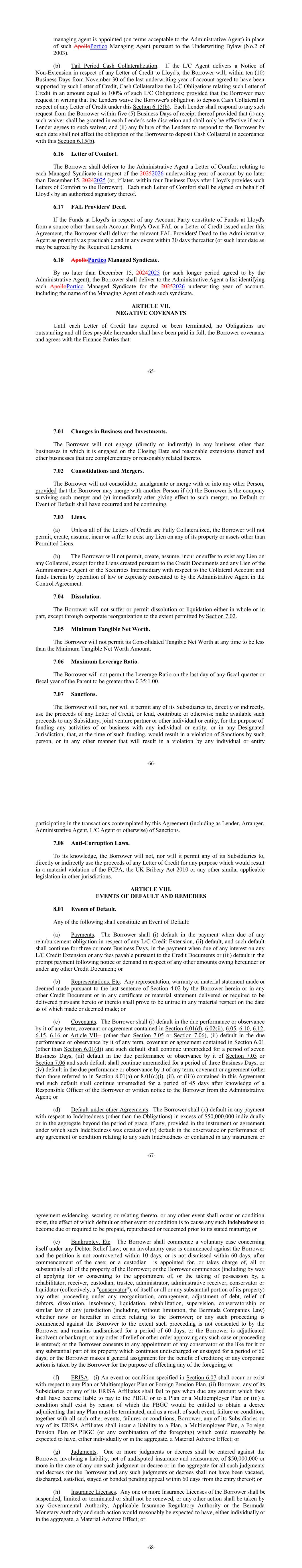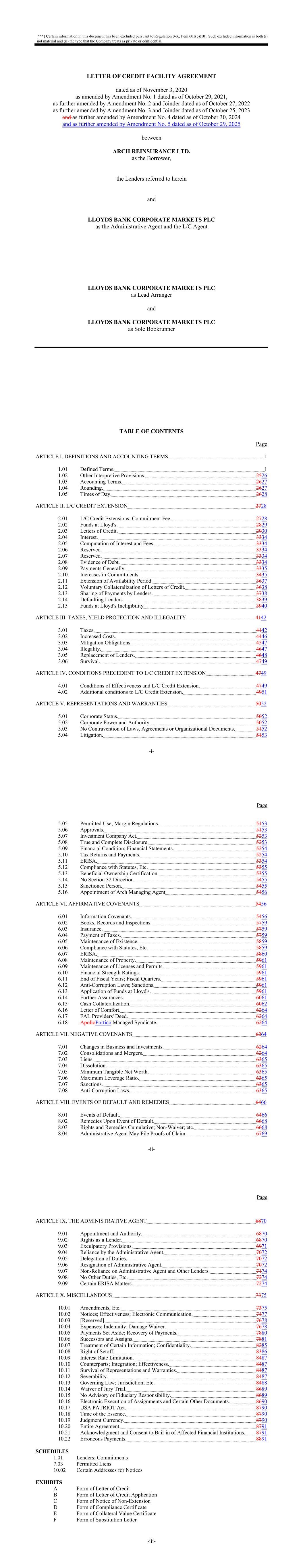 LETTER OF CREDIT FACILITY AGREEMENT dated as of November 3, 2020 as amended by Amendment No. 1 dated as of October 29, 2021, as further amended by Amendment No. 2 and Joinder dated as of October 27, 2022 as further amended by Amendment No. 3 and Joinder dated as of October 25, 2023 and as further amended by Amendment No. 4 dated as of October 30, 2024 and as further amended by Amendment No. 5 dated as of October 29, 2025 between ARCH REINSURANCE LTD. as the Borrower, the Lenders referred to herein and LLOYDS BANK CORPORATE MARKETS PLC as the Administrative Agent and the L/C Agent LLOYDS BANK CORPORATE MARKETS PLC as Lead Arranger and LLOYDS BANK CORPORATE MARKETS PLC as Sole Bookrunner [***] Certain information in this document has been excluded pursuant to Regulation S-K, Item 601(b)(10). Such excluded information is both (i) not material and (ii) the type that the Company treats as private or confidential. TABLE OF CONTENTS Page ARTICLE I. DEFINITIONS AND ACCOUNTING TERMS 1 1.01 Defined Terms. 1 1.02 Other Interpretive Provisions. 2526 1.03 Accounting Terms. 2627 1.04 Rounding. 2627 1.05 Times of Day. 2628 ARTICLE II. L/C CREDIT EXTENSION 2728 2.01 L/C Credit Extensions; Commitment Fee. 2728 2.02 Funds at Lloyd's. 2829 2.03 Letters of Credit. 2930 2.04 Interest. 3334 2.05 Computation of Interest and Fees. 3334 2.06 Reserved. 3334 2.07 Reserved. 3334 2.08 Evidence of Debt. 3334 2.09 Payments Generally. 3335 2.10 Increases in Commitments. 3435 2.11 Extension of Availability Period. 3637 2.12 Voluntary Collateralization of Letters of Credit. 3638 2.13 Sharing of Payments by Lenders. 3738 2.14 Defaulting Lenders. 3839 2.15 Funds at Lloyd's Ineligibility 3940 ARTICLE III. TAXES, YIELD PROTECTION AND ILLEGALITY 4142 3.01 Taxes. 4142 3.02 Increased Costs. 4446 3.03 Mitigation Obligations. 4547 3.04 Illegality. 4647 3.05 Replacement of Lenders. 4648 3.06 Survival. 4749 ARTICLE IV. CONDITIONS PRECEDENT TO L/C CREDIT EXTENSION 4749 4.01 Conditions of Effectiveness and L/C Credit Extension. 4749 4.02 Additional conditions to L/C Credit Extension. 4951 ARTICLE V. REPRESENTATIONS AND WARRANTIES 5052 5.01 Corporate Status. 5052 5.02 Corporate Power and Authority. 5052 5.03 No Contravention of Laws, Agreements or Organizational Documents. 5152 5.04 Litigation. 5153 -i- Page -ii- 5.05 Permitted Use; Margin Regulations. 5153 5.06 Approvals. 5153 5.07 Investment Company Act. 5253 5.08 True and Complete Disclosure. 5253 5.09 Financial Condition; Financial Statements. 5254 5.10 Tax Returns and Payments. 5254 5.11 ERISA. 5354 5.12 Compliance with Statutes, Etc. 5355 5.13 Beneficial Ownership Certification. 5355 5.14 No Section 32 Direction. 5455 5.15 Sanctioned Person. 5455 5.16 Appointment of Arch Managing Agent 5456 ARTICLE VI. AFFIRMATIVE COVENANTS 5456 6.01 Information Covenants. 5456 6.02 Books, Records and Inspections. 5759 6.03 Insurance. 5759 6.04 Payment of Taxes. 5759 6.05 Maintenance of Existence. 5859 6.06 Compliance with Statutes, Etc. 5859 6.07 ERISA. 5860 6.08 Maintenance of Property. 5961 6.09 Maintenance of Licenses and Permits. 5961 6.10 Financial Strength Ratings. 5961 6.11 End of Fiscal Years; Fiscal Quarters. 5961 6.12 Anti-Corruption Laws; Sanctions. 5961 6.13 Application of Funds at Lloyd's. 5961 6.14 Further Assurances. 6061 6.15 Cash Collateralization. 6062 6.16 Letter of Comfort. 6264 6.17 FAL Providers' Deed. 6264 6.18 ApolloPortico Managed Syndicate. 6264 ARTICLE VII. NEGATIVE COVENANTS 6264 7.01 Changes in Business and Investments. 6264 7.02 Consolidations and Mergers. 6264 7.03 Liens. 6365 7.04 Dissolution. 6365 7.05 Minimum Tangible Net Worth. 6365 7.06 Maximum Leverage Ratio. 6365 7.07 Sanctions. 6365 7.08 Anti-Corruption Laws. 6365 ARTICLE VIII. EVENTS OF DEFAULT AND REMEDIES 6466 8.01 Events of Default. 6466 8.02 Remedies Upon Event of Default. 6668 8.03 Rights and Remedies Cumulative; Non-Waiver; etc. 6668 8.04 Administrative Agent May File Proofs of Claim. 6769 Page -iii- ARTICLE IX. THE ADMINISTRATIVE AGENT 6870 9.01 Appointment and Authority. 6870 9.02 Rights as a Lender. 6870 9.03 Exculpatory Provisions. 6971 9.04 Reliance by the Administrative Agent. 7072 9.05 Delegation of Duties. 7072 9.06 Resignation of Administrative Agent. 7072 9.07 Non-Reliance on Administrative Agent and Other Lenders. 7174 9.08 No Other Duties, Etc. 7274 9.09 Certain ERISA Matters. 7274 ARTICLE X. MISCELLANEOUS 7375 10.01 Amendments, Etc. 7375 10.02 Notices; Effectiveness; Electronic Communication. 7477 10.03 [Reserved]. 7678 10.04 Expenses; Indemnity; Damage Waiver. 7678 10.05 Payments Set Aside; Recovery of Payments. 7880 10.06 Successors and Assigns. 7881 10.07 Treatment of Certain Information; Confidentiality. 8285 10.08 Right of Setoff. 8386 10.09 Interest Rate Limitation. 8487 10.10 Counterparts; Integration; Effectiveness. 8487 10.11 Survival of Representations and Warranties. 8487 10.12 Severability. 8487 10.13 Governing Law; Jurisdiction; Etc. 8488 10.14 Waiver of Jury Trial. 8689 10.15 No Advisory or Fiduciary Responsibility. 8689 10.16 Electronic Execution of Assignments and Certain Other Documents. 8690 10.17 USA PATRIOT Act. 8790 10.18 Time of the Essence. 8790 10.19 Judgment Currency. 8790 10.20 Entire Agreement. 8791 10.21 Acknowledgment and Consent to Bail-in of Affected Financial Institutions. 8791 10.22 Erroneous Payments. 8891 SCHEDULES 1.01 Lenders; Commitments 7.03 Permitted Liens 10.02 Certain Addresses for Notices EXHIBITS A Form of Letter of Credit B Form of Letter of Credit Application C Form of Notice of Non-Extension D Form of Compliance Certificate E Form of Collateral Value Certificate F Form of Substitution Letter