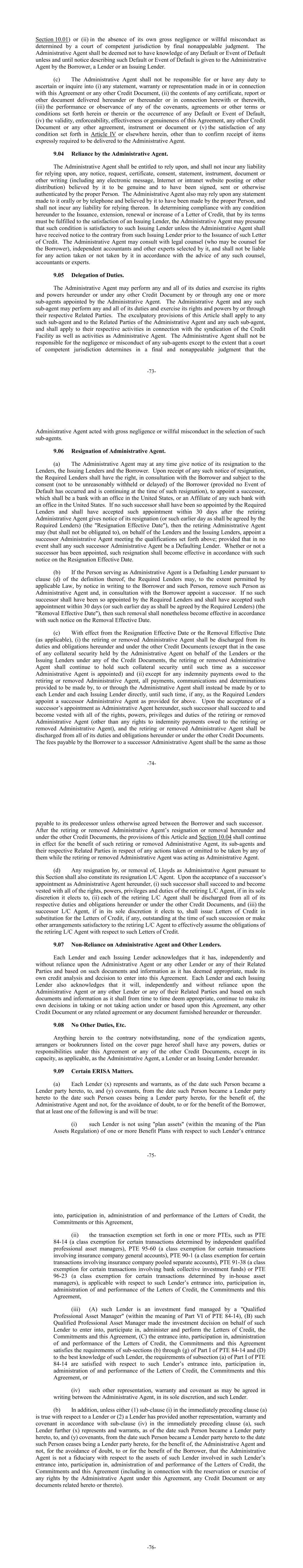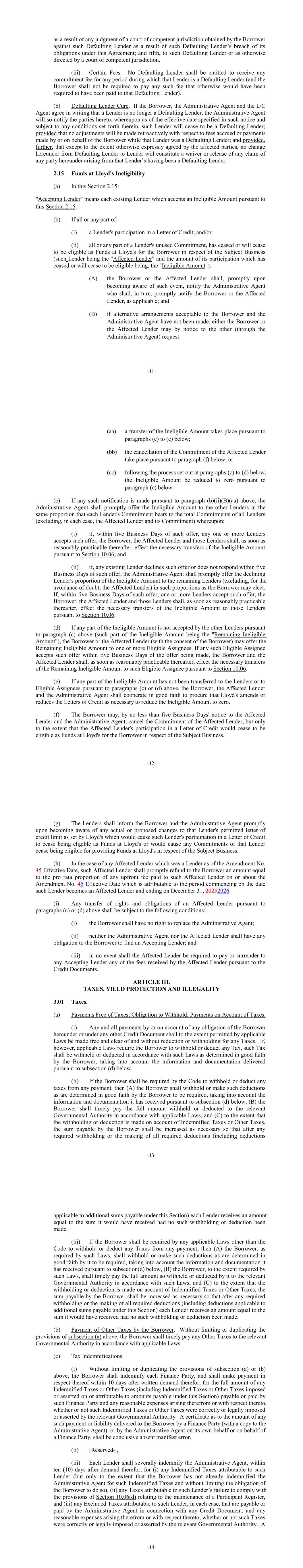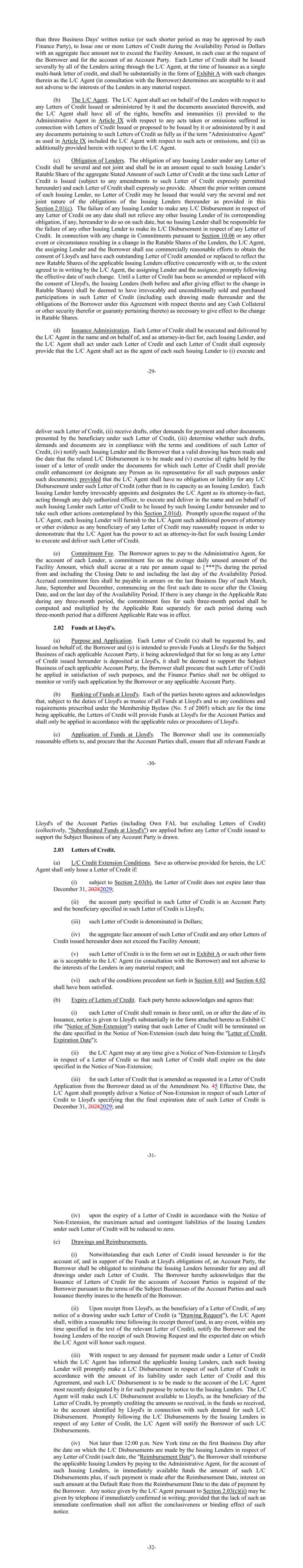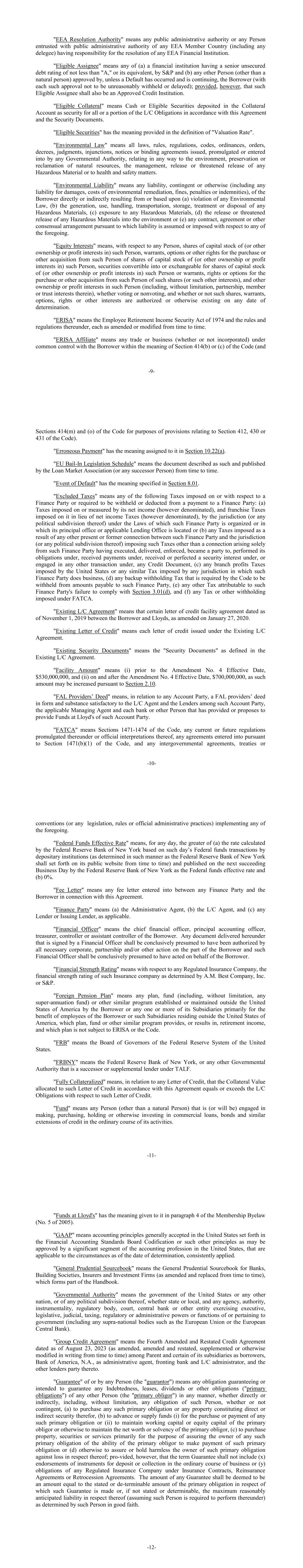 "EEA Resolution Authority" means any public administrative authority or any Person entrusted with public administrative authority of any EEA Member Country (including any delegee) having responsibility for the resolution of any EEA Financial Institution. "Eligible Assignee" means any of (a) a financial institution having a senior unsecured debt rating of not less than "A," or its equivalent, by S&P and (b) any other Person (other than a natural person) approved by, unless a Default has occurred and is continuing, the Borrower (with each such approval not to be unreasonably withheld or delayed); provided, however, that such Eligible Assignee shall also be an Approved Credit Institution. "Eligible Collateral" means Cash or Eligible Securities deposited in the Collateral Account as security for all or a portion of the L/C Obligations in accordance with this Agreement and the Security Documents. "Eligible Securities" has the meaning provided in the definition of "Valuation Rate". "Environmental Law" means all laws, rules, regulations, codes, ordinances, orders, decrees, judgments, injunctions, notices or binding agreements issued, promulgated or entered into by any Governmental Authority, relating in any way to the environment, preservation or reclamation of natural resources, the management, release or threatened release of any Hazardous Material or to health and safety matters. "Environmental Liability" means any liability, contingent or otherwise (including any liability for damages, costs of environmental remediation, fines, penalties or indemnities), of the Borrower directly or indirectly resulting from or based upon (a) violation of any Environmental Law, (b) the generation, use, handling, transportation, storage, treatment or disposal of any Hazardous Materials, (c) exposure to any Hazardous Materials, (d) the release or threatened release of any Hazardous Materials into the environment or (e) any contract, agreement or other consensual arrangement pursuant to which liability is assumed or imposed with respect to any of the foregoing. "Equity Interests" means, with respect to any Person, shares of capital stock of (or other ownership or profit interests in) such Person, warrants, options or other rights for the purchase or other acquisition from such Person of shares of capital stock of (or other ownership or profit interests in) such Person, securities convertible into or exchangeable for shares of capital stock of (or other ownership or profit interests in) such Person or warrants, rights or options for the purchase or other acquisition from such Person of such shares (or such other interests), and other ownership or profit interests in such Person (including, without limitation, partnership, member or trust interests therein), whether voting or nonvoting, and whether or not such shares, warrants, options, rights or other interests are authorized or otherwise existing on any date of determination. "ERISA" means the Employee Retirement Income Security Act of 1974 and the rules and regulations thereunder, each as amended or modified from time to time. "ERISA Affiliate" means any trade or business (whether or not incorporated) under common control with the Borrower within the meaning of Section 414(b) or (c) of the Code (and -9- Sections 414(m) and (o) of the Code for purposes of provisions relating to Section 412, 430 or 431 of the Code). "Erroneous Payment" has the meaning assigned to it in Section 10.22(a). "EU Bail-In Legislation Schedule" means the document described as such and published by the Loan Market Association (or any successor Person) from time to time. "Event of Default" has the meaning specified in Section 8.01. "Excluded Taxes" means any of the following Taxes imposed on or with respect to a Finance Party or required to be withheld or deducted from a payment to a Finance Party: (a) Taxes imposed on or measured by its net income (however denominated), and franchise Taxes imposed on it in lieu of net income Taxes (however denominated), by the jurisdiction (or any political subdivision thereof) under the Laws of which such Finance Party is organized or in which its principal office or applicable Lending Office is located or (b) any Taxes imposed as a result of any other present or former connection between such Finance Party and the jurisdiction (or any political subdivision thereof) imposing such Taxes other than a connection arising solely from such Finance Party having executed, delivered, enforced, became a party to, performed its obligations under, received payments under, received or perfected a security interest under, or engaged in any other transaction under, any Credit Document, (c) any branch profits Taxes imposed by the United States or any similar Tax imposed by any jurisdiction in which such Finance Party does business, (d) any backup withholding Tax that is required by the Code to be withheld from amounts payable to such Finance Party, (e) any other Tax attributable to such Finance Party's failure to comply with Section 3.01(d), and (f) any Tax or other withholding imposed under FATCA. "Existing L/C Agreement" means that certain letter of credit facility agreement dated as of November 1, 2019 between the Borrower and Lloyds, as amended on January 27, 2020. "Existing Letter of Credit" means each letter of credit issued under the Existing L/C Agreement. "Existing Security Documents" means the "Security Documents" as defined in the Existing L/C Agreement. "Facility Amount" means (i) prior to the Amendment No. 4 Effective Date, $530,000,000, and (ii) on and after the Amendment No. 4 Effective Date, $700,000,000, as such amount may be increased pursuant to Section 2.10. "FAL Providers’ Deed" means, in relation to any Account Party, a FAL providers’ deed in form and substance satisfactory to the L/C Agent and the Lenders among such Account Party, the applicable Managing Agent and each bank or other Person that has provided or proposes to provide Funds at Llo