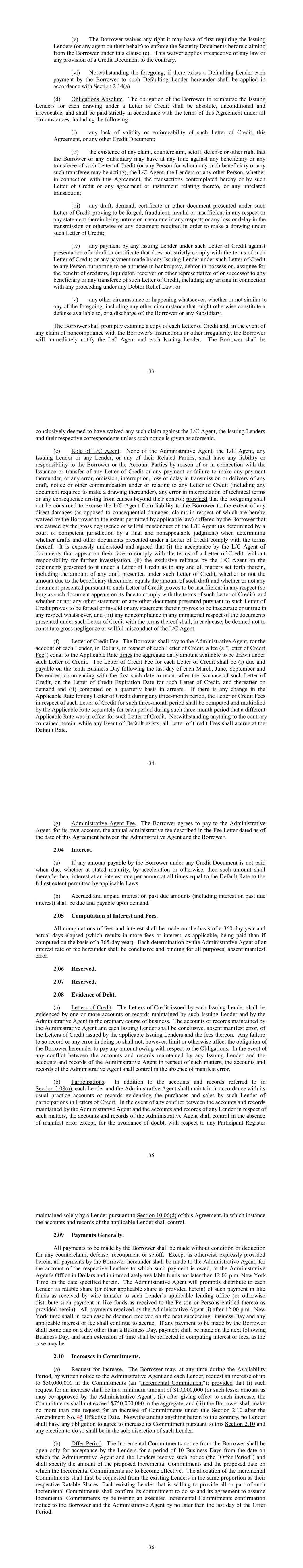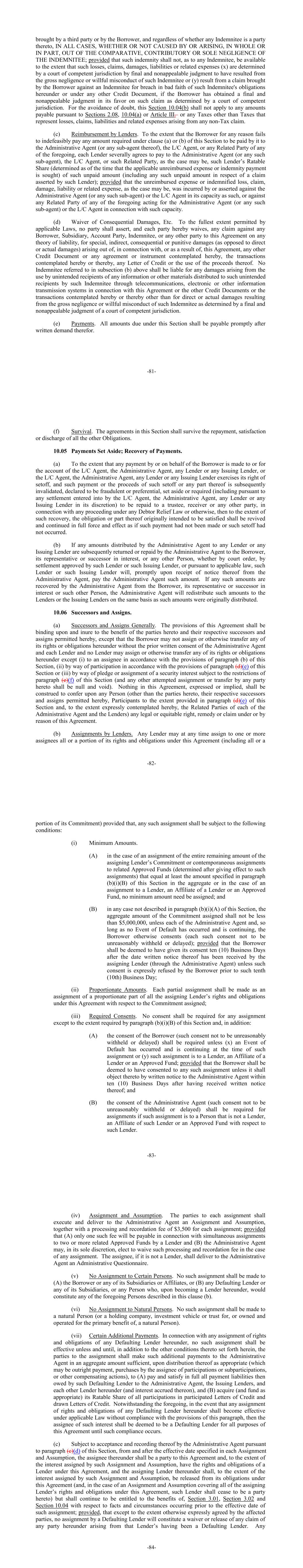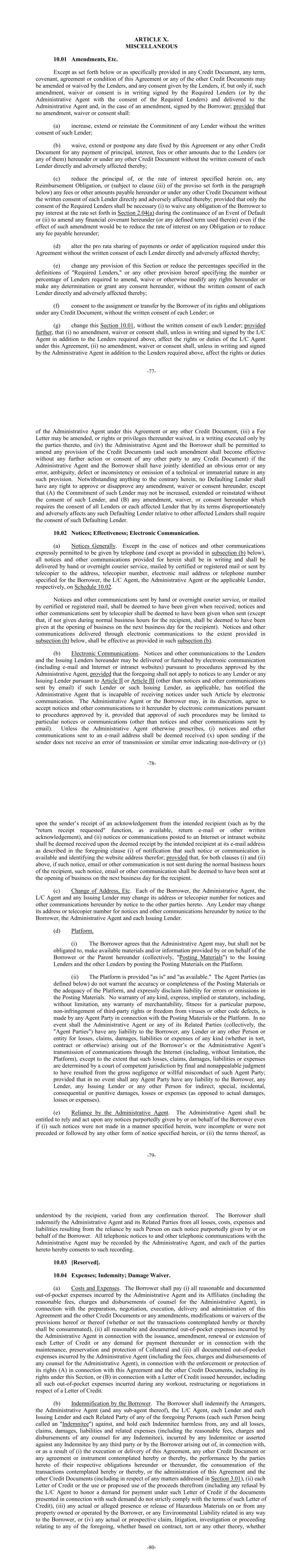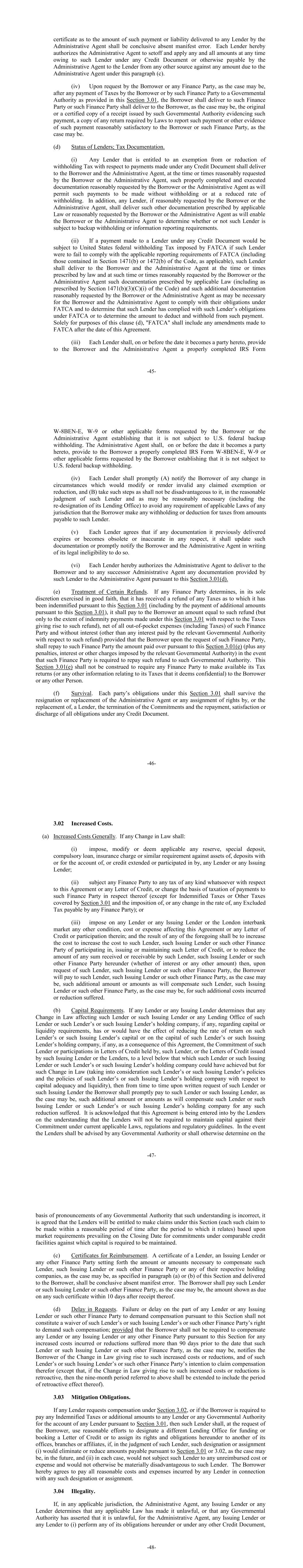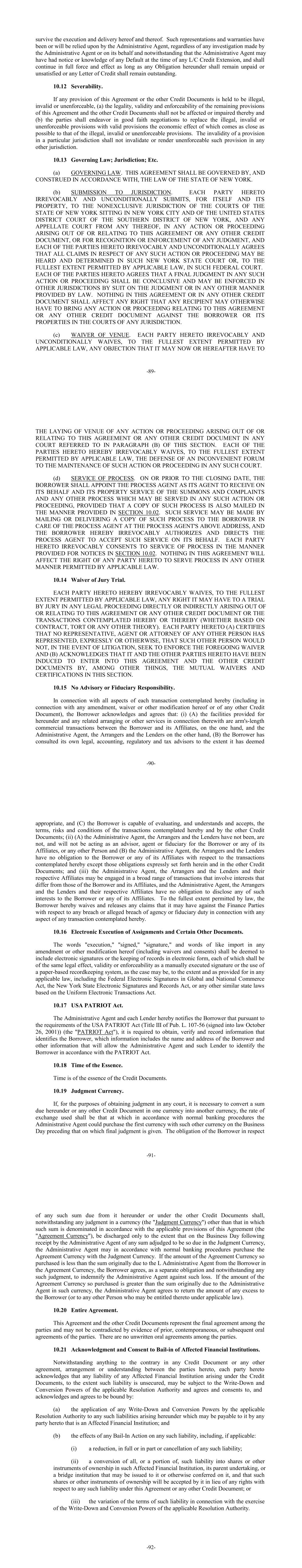 "EEA Resolution Authority" means any public administrative authority or any Person entrusted with public administrative authority of any EEA Member Country (including any delegee) having responsibility for the resolution of any EEA Financial Institution. "Eligible Assignee" means any of (a) a financial institution having a senior unsecured debt rating of not less than "A," or its equivalent, by S&P and (b) any other Person (other than a natural person) approved by, unless a Default has occurred and is continuing, the Borrower (with each such approval not to be unreasonably withheld or delayed); provided, however, that such Eligible Assignee shall also be an Approved Credit Institution. "Eligible Collateral" means Cash or Eligible Securities deposited in the Collateral Account as security for all or a portion of the L/C Obligations in accordance with this Agreement and the Security Documents. "Eligible Securities" has the meaning provided in the definition of "Valuation Rate". "Environmental Law" means all laws, rules, regulations, codes, ordinances, orders, decrees, judgments, injunctions, notices or binding agreements issued, promulgated or entered into by any Governmental Authority, relating in any way to the environment, preservation or reclamation of natural resources, the management, release or threatened release of any Hazardous Material or to health and safety matters. "Environmental Liability" means any liability, contingent or otherwise (including any liability for damages, costs of environmental remediation, fines, penalties or indemnities), of the Borrower directly or indirectly resulting from or based upon (a) violation of any Environmental Law, (b) the generation, use, handling, transportation, storage, treatment or disposal of any Hazardous Materials, (c) exposure to any Hazardous Materials, (d) the release or threatened release of any Hazardous Materials into the environment or (e) any contract, agreement or other consensual arrangement pursuant to which liability is assumed or imposed with respect to any of the foregoing. "Equity Interests" means, with respect to any Person, shares of capital stock of (or other ownership or profit interests in) such Person, warrants, options or other rights for the purchase or other acquisition from such Person of shares of capital stock of (or other ownership or profit interests in) such Person, securities convertible into or exchangeable for shares of capital stock of (or other ownership or profit interests in) such Person or warrants, rights or options for the purchase or other acquisition from such Person of such shares (or such other interests), and other ownership or profit interests in such Person (including, without limitation, partnership, member or trust interests therein), whether voting or nonvoting, and whether or not such shares, warrants, options, rights or other interests are authorized or otherwise existing on any date of determination. "ERISA" means the Employee Retirement Income Security Act of 1974 and the rules and regulations thereunder, each as amended or modified from time to time. "ERISA Affiliate" means any trade or business (whether or not incorporated) under common control with the Borrower within the meaning of Section 414(b) or (c) of the Code (and -9- Sections 414(m) and (o) of the Code for purposes of provisions relating to Section 412, 430 or 431 of the Code). "Erroneous Payment" has the meaning assigned to it in Section 10.22(a). "EU Bail-In Legislation Schedule" means the document described as such and published by the Loan Market Association (or any successor Person) from time to time. "Event of Default" has the meaning specified in Section 8.01. "Excluded Taxes" means any of the following Taxes imposed on or with respect to a Finance Party or required to be withheld or deducted from a payment to a Finance Party: (a) Taxes imposed on or measured by its net income (however denominated), and franchise Taxes imposed on it in lieu of net income Taxes (however denominated), by the jurisdiction (or any political subdivision thereof) under the Laws of which such Finance Party is organized or in which its principal office or applicable Lending Office is located or (b) any Taxes imposed as a result of any other present or former connection between such Finance Party and the jurisdiction (or any political subdivision thereof) imposing such Taxes other than a connection arising solely from such Finance Party having executed, delivered, enforced, became a party to, performed its obligations under, received payments under, received or perfected a security interest under, or engaged in any other transaction under, any Credit Document, (c) any branch profits Taxes imposed by the United States or any similar Tax imposed by any jurisdiction in which such Finance Party does business, (d) any backup withholding Tax that is required by the Code to be withheld from amounts payable to such Finance Party, (e) any other Tax attributable to such Finance Party's failure to comply with Section 3.01(d), and (f) any Tax or other withholding imposed under FATCA. "Existing L/C Agreement" means that certain letter of credit facility agreement dated as of November 1, 2019 between the Borrower and Lloyds, as amended on January 27, 2020. "Existing Letter of Credit" means each letter of credit issued under the Existing L/C Agreement. "Existing Security Documents" means the "Security Documents" as defined in the Existing L/C Agreement. "Facility Amount" means (i) prior to the Amendment No. 4 Effective Date, $530,000,000, and (ii) on and after the Amendment No. 4 Effective Date, $700,000,000, as such amount may be increased pursuant to Section 2.10. "FAL Providers’ Deed" means, in relation to any Account Party, a FAL providers’ deed in form and substance satisfactory to the L/C Agent and the Lenders among such Account Party, the applicable Managing Agent and each bank or other Person that has provided or proposes to provide Funds at Llo
