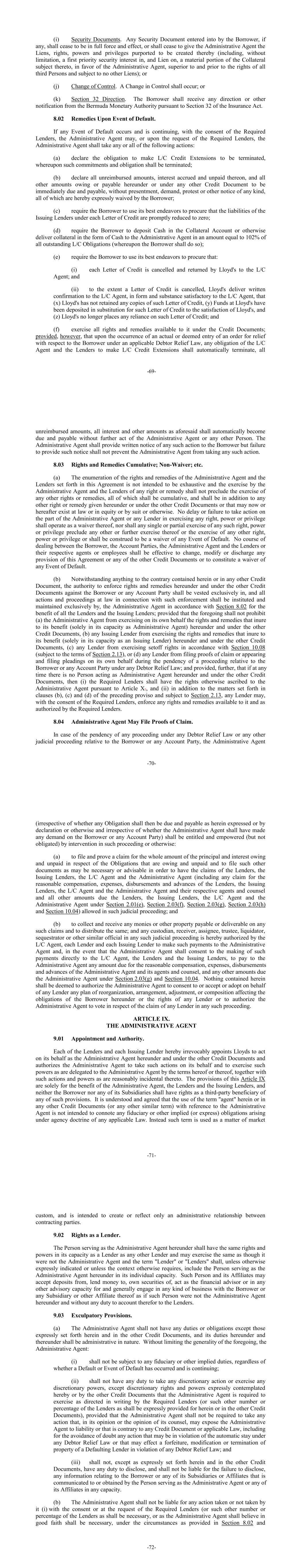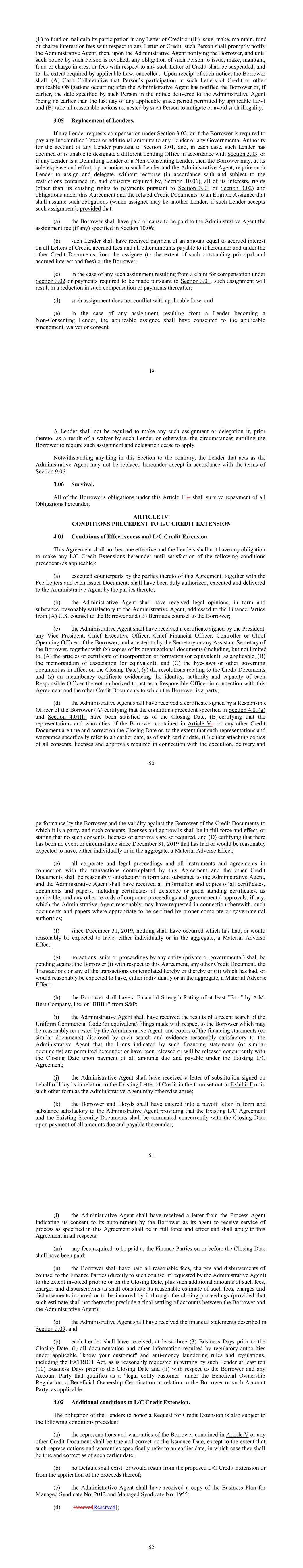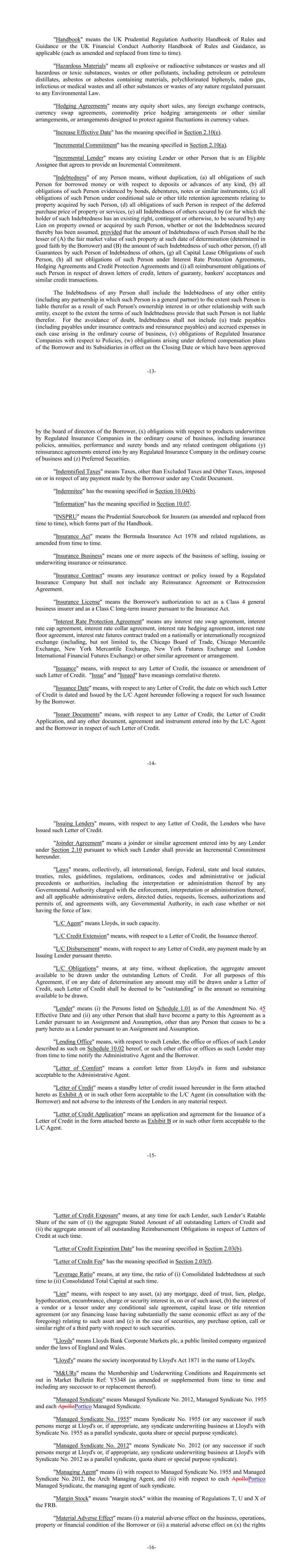 "Handbook" means the UK Prudential Regulation Authority Handbook of Rules and Guidance or the UK Financial Conduct Authority Handbook of Rules and Guidance, as applicable (each as amended and replaced from time to time). "Hazardous Materials" means all explosive or radioactive substances or wastes and all hazardous or toxic substances, wastes or other pollutants, including petroleum or petroleum distillates, asbestos or asbestos containing materials, polychlorinated biphenyls, radon gas, infectious or medical wastes and all other substances or wastes of any nature regulated pursuant to any Environmental Law. "Hedging Agreements" means any equity short sales, any foreign exchange contracts, currency swap agreements, commodity price hedging arrangements or other similar arrangements, or arrangements designed to protect against fluctuations in currency values. "Increase Effective Date" has the meaning specified in Section 2.10(e). "Incremental Commitment" has the meaning specified in Section 2.10(a). "Incremental Lender" means any existing Lender or other Person that is an Eligible Assignee that agrees to provide an Incremental Commitment. "Indebtedness" of any Person means, without duplication, (a) all obligations of such Person for borrowed money or with respect to deposits or advances of any kind, (b) all obligations of such Person evidenced by bonds, debentures, notes or similar instruments, (c) all obligations of such Person under conditional sale or other title retention agreements relating to property acquired by such Person, (d) all obligations of such Person in respect of the deferred purchase price of property or services, (e) all Indebtedness of others secured by (or for which the holder of such Indebtedness has an existing right, contingent or otherwise, to be secured by) any Lien on property owned or acquired by such Person, whether or not the Indebtedness secured thereby has been assumed, provided that the amount of Indebtedness of such Person shall be the lesser of (A) the fair market value of such property at such date of determination (determined in good faith by the Borrower) and (B) the amount of such Indebtedness of such other person, (f) all Guarantees by such Person of Indebtedness of others, (g) all Capital Lease Obligations of such Person, (h) all net obligations of such Person under Interest Rate Protection Agreements, Hedging Agreements and Credit Protection Agreements and (i) all reimbursement obligations of such Person in respect of drawn letters of credit, letters of guaranty, bankers' acceptances and similar credit transactions. The Indebtedness of any Person shall include the Indebtedness of any other entity (including any partnership in which such Person is a general partner) to the extent such Person is liable therefor as a result of such Person's ownership interest in or other relationship with such entity, except to the extent the terms of such Indebtedness provide that such Person is not liable therefor. For the avoidance of doubt, Indebtedness shall not include (u) trade payables (including payables under insurance contracts and reinsurance payables) and accrued expenses in each case arising in the ordinary course of business, (v) obligations of Regulated Insurance Companies with respect to Policies, (w) obligations arising under deferred compensation plans of the Borrower and its Subsidiaries in effect on the Closing Date or which have been approved -13- by the board of directors of the Borrower, (x) obligations with respect to products underwritten by Regulated Insurance Companies in the ordinary course of business, including insurance policies, annuities, performance and surety bonds and any related contingent obligations (y) reinsurance agreements entered into by any Regulated Insurance Company in the ordinary course of business and (z) Preferred Securities. "Indemnified Taxes" means Taxes, other than Excluded Taxes and Other Taxes, imposed on or in respect of any payment made by the Borrower under any Credit Document. "Indemnitee" has the meaning specified in Section 10.04(b). "Information" has the meaning specified in Section 10.07. "INSPRU" means the Prudential Sourcebook for Insurers (as amended and replaced from time to time), which forms part of the Handbook. "Insurance Act" means the Bermuda Insurance Act 1978 and related regulations, as amended from time to time. "Insurance Business" means one or more aspects of the business of selling, issuing or underwriting insurance or reinsurance. "Insurance Contract" means any insurance contract or policy issued by a Regulated Insurance Company but shall not include any Reinsurance Agreement or Retrocession Agreement. "Insurance License" means the Borrower's authorization to act as a Class 4 general business insurer and as a Class C long-term insurer pursuant to the Insurance Act. "Interest Rate Protection Agreement" means any interest rate swap agreement, interest rate cap agreement, interest rate collar agreement, interest rate hedging agreement, interest rate floor agreement, interest rate futures contract traded on a nationally or internationally recognized exchange (including, but not limited to, the Chicago Board of Trade, Chicago Mercantile Exchange, New York Mercantile Exchange, New York Futures Exchange and London International Financial Futures Exchange) or other similar agreement or arrangement. "Issuance" means, with respect to any Letter of Credit, the issuance or amendment of such Letter of Credit. "Issue" and "Issued" have meanings correlative thereto. "Issuance Date" means, with respect to any Letter of Credit, the date on which such Letter of Credit is dated and Issued by the L/C Agent hereunder following a request for such Issuance by the Borrower. "Issuer Documents" means, with respect to any Letter of Credit, the Letter of Credit Application, and any other document, agreement and instrument entered into by the L/C Agent and the Borrower in respect of such Letter of Credit. -14- "Issu
