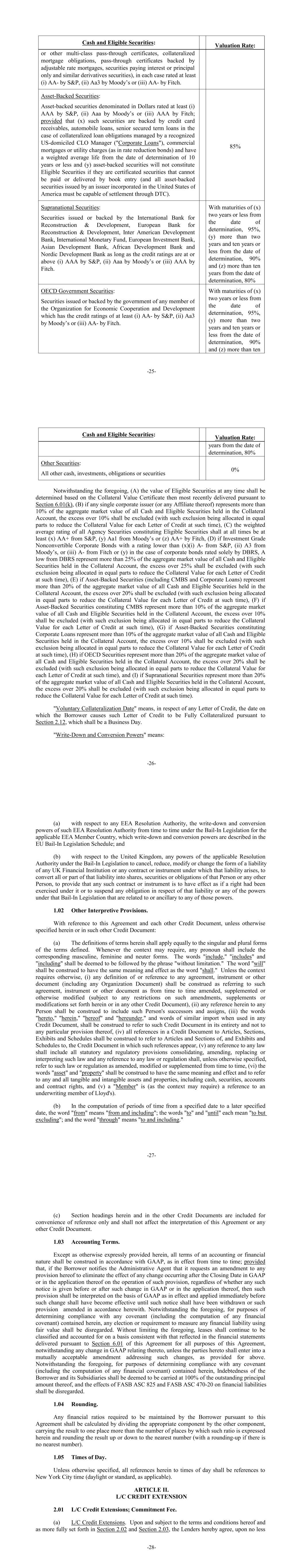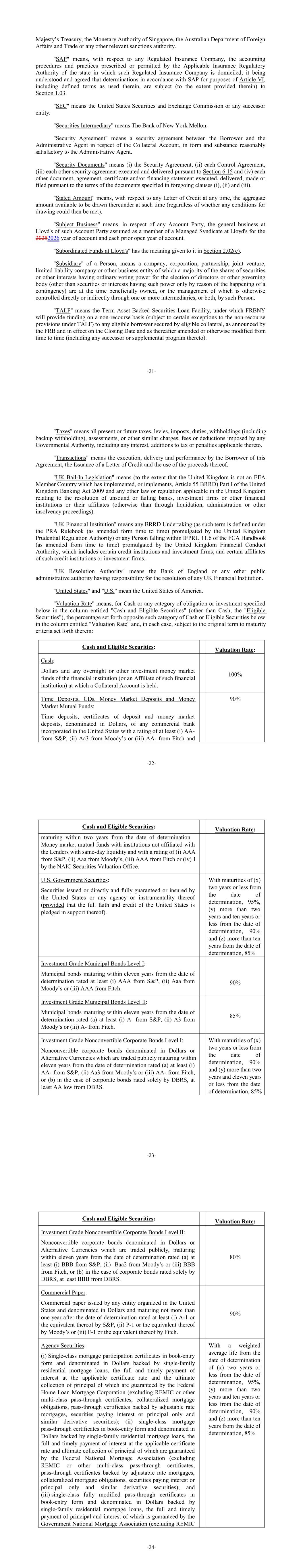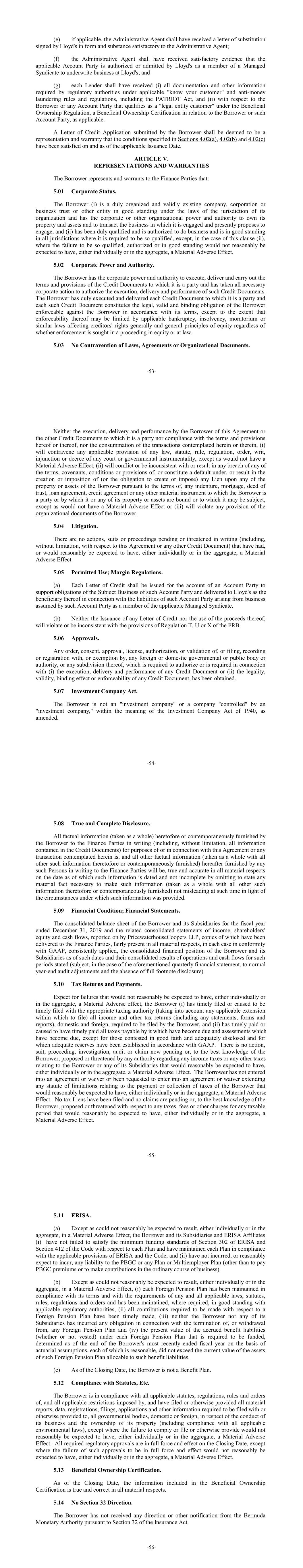 "Business Day" means any day (other than a Saturday or Sunday) on which commercial banks are open for general business in London, New York and Toronto. "Business Plan" means, in respect of each Managed Syndicate, (i) prior to the Amendment No. 45 Effective Date, the most recent business forecast prepared for the 2021, 2022, 2023 or, 2024 or 2025 underwriting year of account in relation to such Managed Syndicate, as applicable, and (ii) on and after the Amendment No. 45 Effective Date, the most recent business forecast prepared for the 20252026 underwriting year of account in relation to such Managed Syndicate. "Capital Lease Obligations" of any Person means the obligations of such Person to pay rent or other amounts under any lease of (or other arrangement conveying the right to use) real or personal property, or a combination thereof, which obligations are required to be classified and accounted for as capital leases on a balance sheet of such Person under GAAP, and the amount of such obligations shall be the capitalized amount thereof determined in accordance with GAAP. "Cash" means Dollars and any overnight or other investment money market funds of the financial institution (or an Affiliate of such financial institution) at which the Collateral Account is held. "Cash Collateralize" means to (i) enter into a Security Agreement and Control Agreement and such other Security Documents as the Administrative Agent may reasonably request to grant a first priority perfected security interest in, and Lien on, the Collateral Account in favor of the Administrative Agent and (ii) deposit Cash into the Collateral Account as collateral for the L/C Obligations. "Cash Collateral" shall have a meaning correlative to the foregoing and shall include the proceeds of such cash collateral and other credit support. "Change in Control" means (a) any Person or group of Persons (as used in Sections 13 and 14 of the Securities Exchange Act of 1934 and the rules and regulations thereunder) shall have become the beneficial owner (as defined in rules promulgated by the SEC) of more than 50% of the voting securities of the Parent or (b) the Parent shall cease to own, directly or indirectly, 100% of the Equity Interests of the Borrower (other than directors’ or similar nominal shares). "Change in Law" means the occurrence, after the date of this Agreement, of any of the following: (a) the adoption or taking effect of any law, rule, regulation or treaty, (b) any change in any law, rule, regulation or treaty or in the administration, interpretation, implementation or application thereof by any Governmental Authority or (c) the making or issuance of any request, rule, guideline or directive (whether or not having the force of law) by any Governmental Authority; provided that notwithstanding anything herein to the contrary, (x) the Dodd-Frank Wall Street Reform and Consumer Protection Act and all requests, rules, guidelines or directives thereunder or issued in connection therewith and (y) all requests, rules, guidelines or directives promulgated by the Bank for International Settlements, the Basel Committee on Banking Supervision (or any successor or similar authority) or the United States regulatory authorities, in -5- each case pursuant to Basel III, shall in each case be deemed to be a "Change in Law," regardless of the date enacted, adopted or issued. "Closing Date" means the first date all the conditions precedent in Section 4.01 are satisfied or waived in accordance with Section 10.01. "Code" means the U.S. Internal Revenue Code of 1986, as amended from time to time. "Collateral" means, with respect to the Borrower, all property and assets with respect to which a security interest is purported to be granted in favor of the Administrative Agent pursuant to the Security Agreement. "Collateral Account" means a securities account maintained by the Borrower at the Securities Intermediary as to which the Securities Intermediary, the Borrower and the Administrative Agent have entered into a Control Agreement. "Collateral Value" means, at any time, and in respect of any Letter of Credit, (a) the aggregate amount of Cash and Eligible Securities held in the Collateral Account at such time and allocated to such Letter of Credit in the Collateral Value Certificate then most recently delivered to the Administrative Agent, multiplied in each case by (b) the respective Valuation Rates for Cash and such Eligible Securities; provided that all Cash and Eligible Securities shall only be included in the Collateral Value to the extent same are subject to a first priority perfected security interest in favor of the Administrative Agent pursuant to the Security Documents; provided further that, at any time, any portion of the Collateral Value that has been allocated to one Letter of Credit may not also be allocated to any other Letter of Credit. "Collateral Value Certificate" means a certificate executed by a Responsible Officer of the Borrower substantially in the form of Exhibit E, with such changes thereto as the Administrative Agent and the Borrower may agree from time to time. "Commitment" means, as to any Lender, the obligation of such Lender to Issue Letters of Credit for the account of the Account Parties in an aggregate principal amount at any time outstanding not to exceed the amount set forth opposite such Lender’s name on the Register, as such amount may be modified at any time or from time to time pursuant to the terms hereof. The Commitment of each Lender as of the Amendment No. 45 Effective Date is set forth opposite the name of such Lender on Schedule 1.01. "Compliance Certificate" means a certificate executed by a Responsible Officer of the Borrower substantially in the form of Exhibit D, with such changes thereto as the Administrative Agent and the Borrower may agree from time to time. "Consolidated Indebtedness" means, as of any date of determination, (i) all Indebtedness of the Parent and its Subsidiaries which 