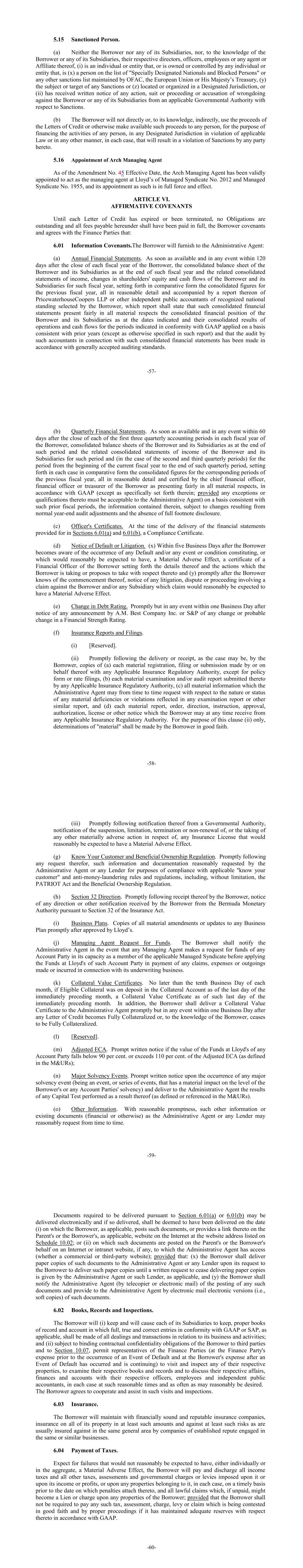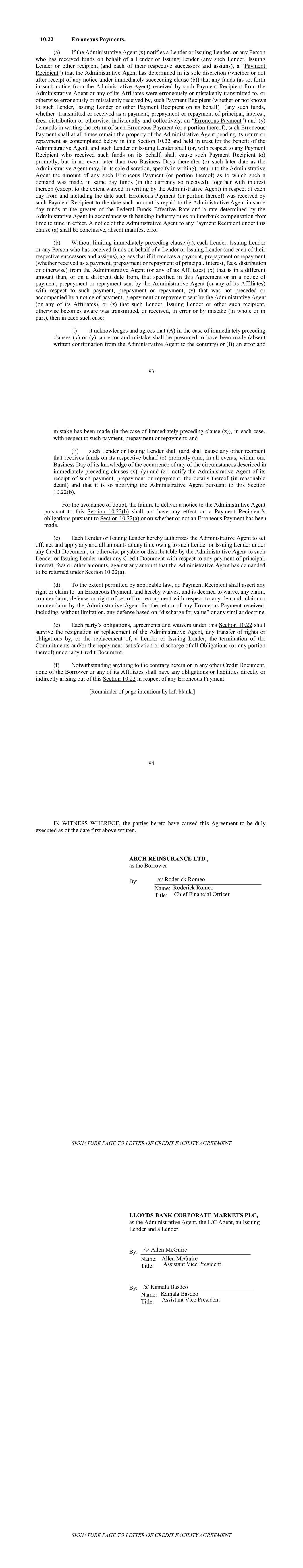 5 relating to the subject matter hereof. Except as provided in Section 6, this Amendment shall become effective when it shall have been executed by the Borrower, each of the Lenders, the Administrative Agent and the L/C Agent and when the Administrative Agent shall have received counterparts hereof that bear the signature of such Persons. Delivery of an executed counterpart of a signature page of this Amendment by telecopy or other electronic imaging means shall be effective as delivery of a manually executed counterpart of this Amendment. 10. Electronic Execution. The words "execution," "signed," "signature," and words of like import in this Amendment or any amendment or other modification hereof (including waivers and consents) shall be deemed to include electronic signatures or the keeping of records in electronic form, each of which shall be of the same legal effect, validity or enforceability as a manually executed signature or the use of a paper-based recordkeeping system, as the case may be, to the extent and as provided for in any applicable law, including the Federal Electronic Signatures in Global and National Commerce Act, the New York State Electronic Signatures and Records Act, or any other similar state laws based on the Uniform Electronic Transactions Act. [Remainder of page intentionally left blank.] Signature Page – Amendment No. 5 The parties have executed and delivered this Amendment as of the date first set forth above. ARCH REINSURANCE LTD., as the Borrower By: ______________________________________ Name: Title: /s/ Jerome Halgan Jerome Halgan Chief Executive Officer Signature Page – Amendment No. 5 LLOYDS BANK CORPORATE MARKETS PLC, as the Administrative Agent, the L/C Agent and a Lender By: ______________________________________ Name: Title: By: ______________________________________ Name: Title: Kamala Basdeo Vice President /s/ Kamala Basdeo /s/ Catherine Lim Catherine Lim Assistant Vice President Signature Page – Amendment No. 5 ROYAL BANK OF CANADA, as a Lender By: ______________________________________ Name: Title: /s/ Kevin Bemben Kevin Bemben Authorized Signatory