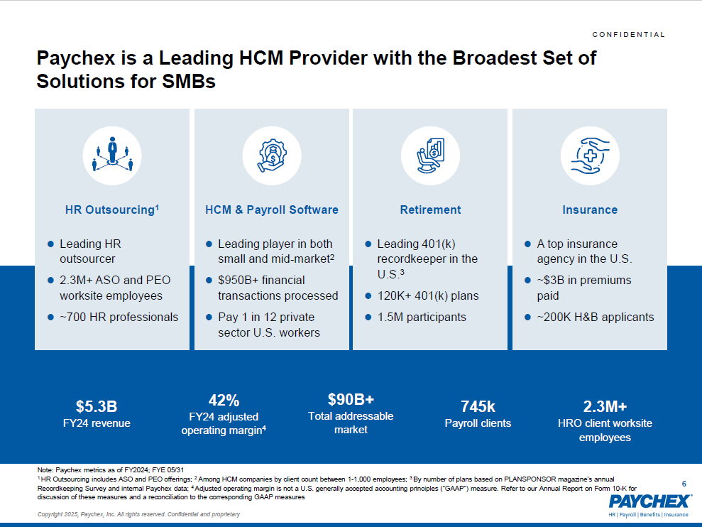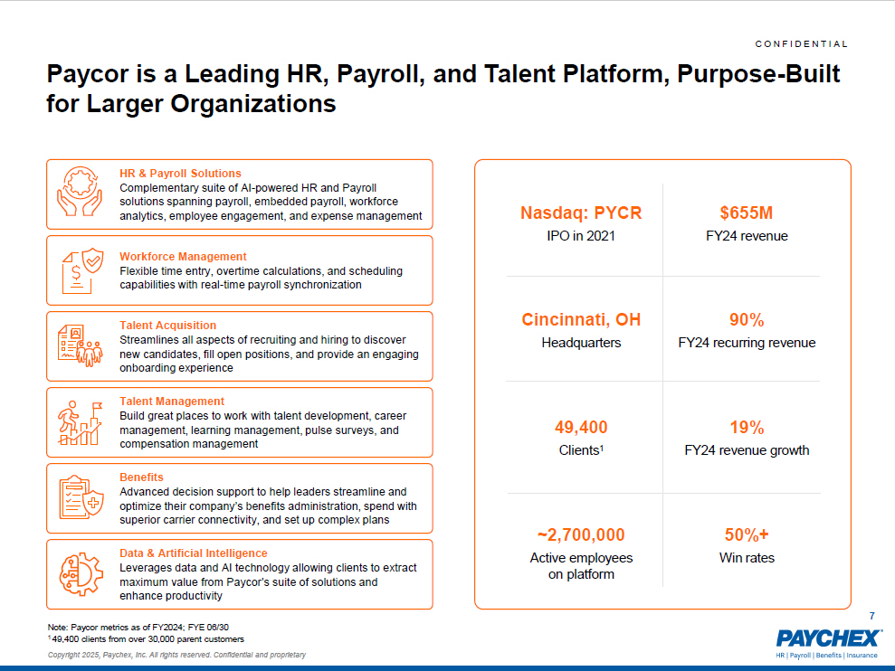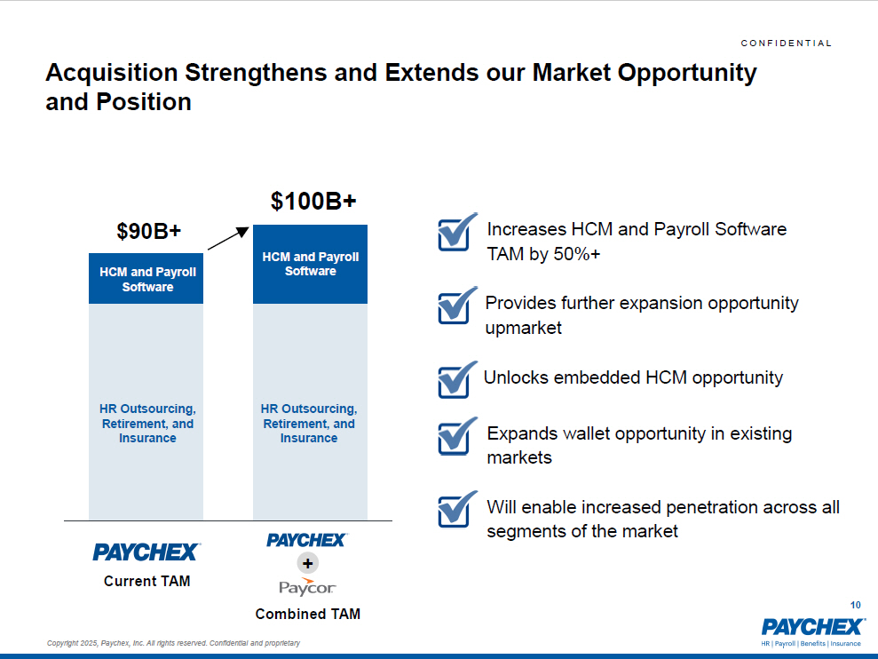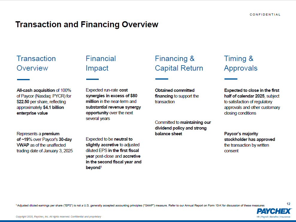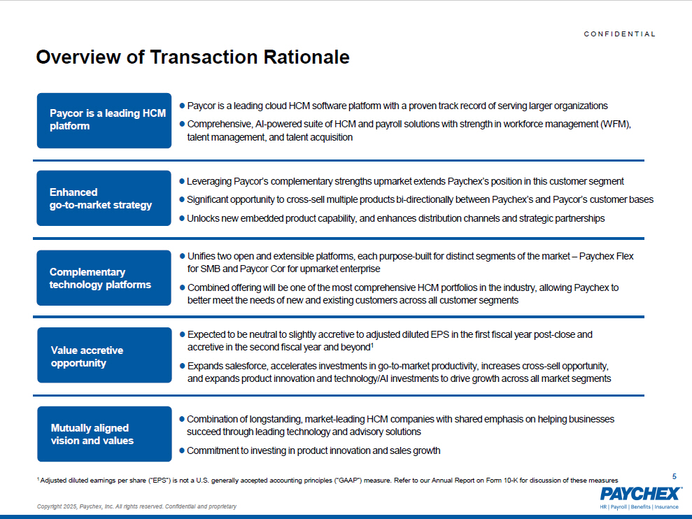2025年1月7日、デラウェア州法人であるPaychex, Inc.(以下「Paychex」)、デラウェア州法人でありPaychexの間接的完全子会社であるSkyline Merger Sub, Inc.(以下「Merger Sub」)、およびデラウェア州法人であるPaycor HCM, Inc.(以下「Paycor」)は、合併契約および合併計画(以下「合併契約」)を締結した。