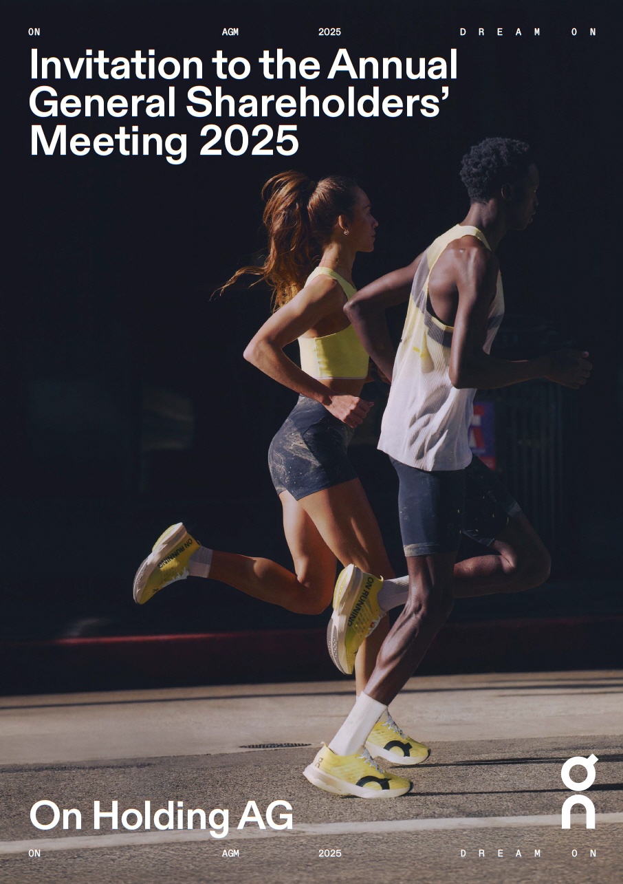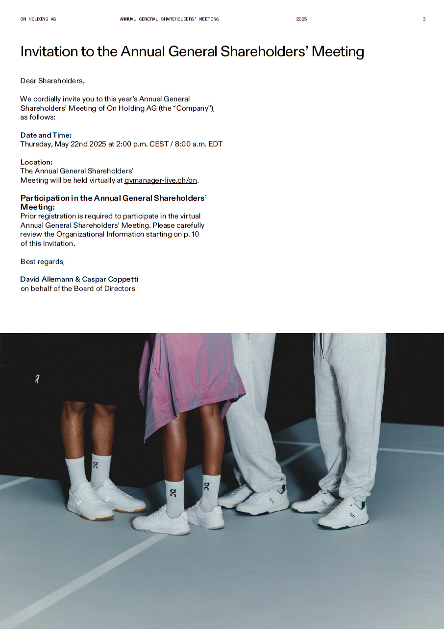 Caspar, David, Olivier, Marc, and Martin The On Partners ON HOLDING AG ANNUAL GENERAL SHAREHOLDERS’ MEETING 3 2 0 25 Place image Invitation to the Annual General Shareholders’ Meeting Dear Shareholders, We cordially invite you to this year’s Annual General Shareholders’ Meeting of On Holding AG (the “Company”), as follows: Date and Time: Thursday, May 22nd 2025 at 2:00 p.m. CEST / 8:00 a.m. EDT Location: The Annual General Shareholders’ Meeting will be held virtually at gvmanager - live.ch/on . Participation in the Annual General Shareholders’ Meeting: Prior registration is required to participate in the virtual Annual General Shareholders’ Meeting. Please carefully review the Organizational Information starting on p. 10 of this Invitation. Best regards, David Allemann & Caspar Coppetti on behalf of the Board of Directors ON HOLDING AG ANNUAL GENERAL SHAREHOLDERS’ MEETING 4 2 0 25 Agenda and Motions of the Board of Directors 1.