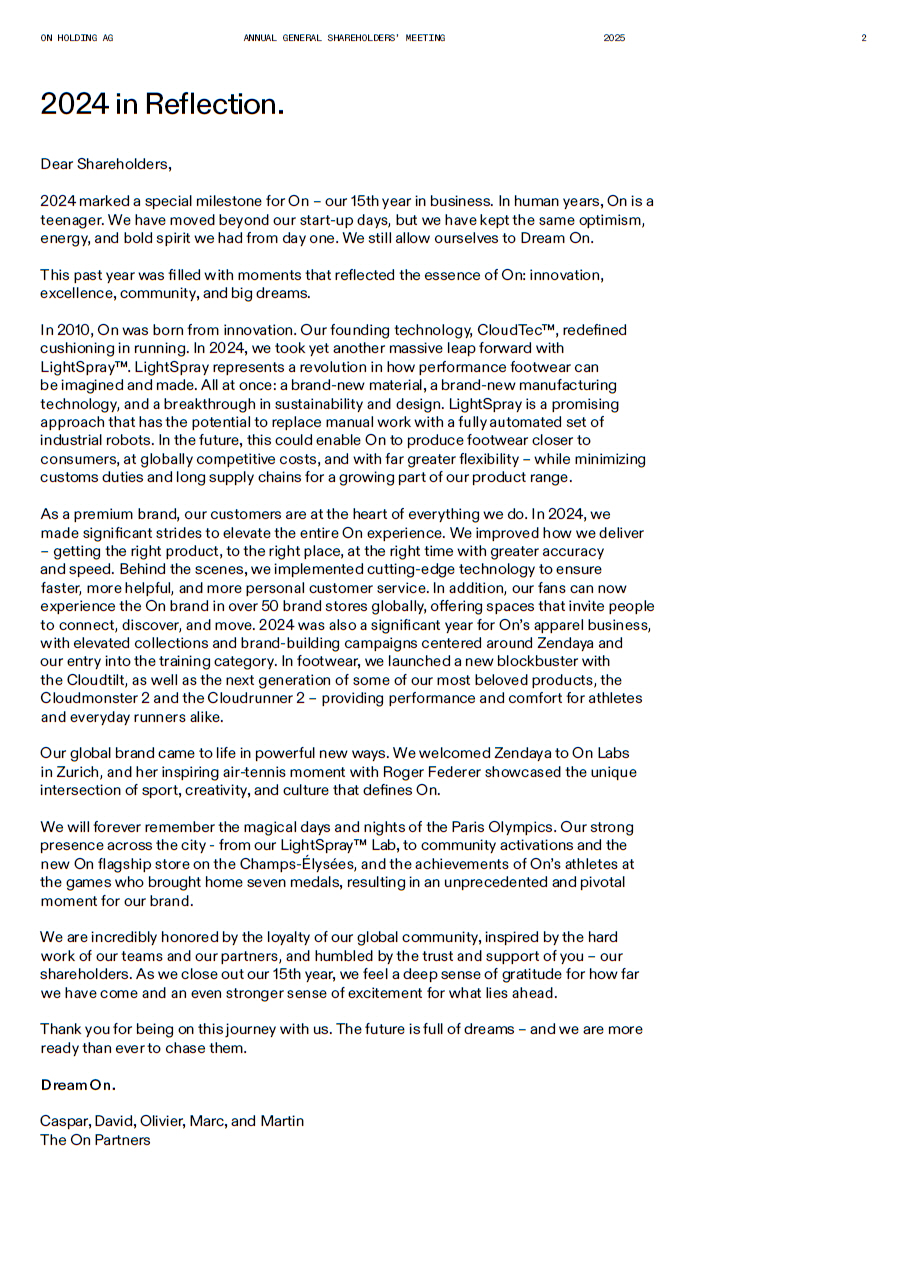 Dear Shareholders, 2024 marked a special milestone for On – our 15th year in business. In human years, On is a teenager. We have moved beyond our start - up days, but we have kept the same optimism, energy, and bold spirit we had from day one. We still allow ourselves to Dream On. This past year was filled with moments that reflected the essence of On: innovation, excellence, community, and big dreams. In 2010, On was born from innovation. Our founding technology, CloudTec , redefined cushioning in running. In 2024, we took yet another massive leap forward with LightSpray . LightSpray represents a revolution in how performance footwear can be imagined and made. All at once: a brand - new material, a brand - new manufacturing technology, and a breakthrough in sustainability and design. LightSpray is a promising approach that has the potential to replace manual work with a fully automated set of industrial robots. In the future, this could enable On to produce footwear closer to consumers, at globally competitive costs, and with far greater flexibility – while minimizing customs duties and long supply chains for a growing part of our product range. As a premium brand, our customers are at the heart of everything we do. In 2024, we made significant strides to elevate the entire On experience. We improved how we deliver – getting the right product, to the right place, at the right time with greater accuracy and speed. Behind the scenes, we implemented cutting - edge technology to ensure faster, more helpful, and more personal customer service. In addition, our fans can now experience the On brand in over 50 brand stores globally, offering spaces that invite people to connect, discover, and move . 2024 was also a significant year for On’s apparel business, with elevated collections and brand - building campaigns centered around Zendaya and our entry into the training category. In footwear, we launched a new blockbuster with the Cloudtilt, as well as the next generation of some of our most beloved products, the Cloudmonster 2 and the Cloudrunner 2 – providing performance and comfort for athletes and everyday runners alike. Our global brand came to life in powerful new ways. We welcomed Zendaya to On Labs in Zurich, and her inspiring air - tennis moment with Roger Federer showcased the unique intersection of sport, creativity, and culture that defines On. We will forever remember the magical days and nights of the Paris Olympics. Our strong presence across the city - from our LightSpray Lab, to community activations and the new On flagship store on the Champs - Élysées, and the achievements of On’s athletes at the games who brought home seven medals, resulting in an unprecedented and pivotal moment for our brand. We are incredibly honored by the loyalty of our global community, inspired by the hard work of our teams and our partners, and humbled by the trust and support of you – our shareholders. As we close out our 15th year, we feel a deep sense of gratitude for how far we have come and an even stronger sense of excitement for what lies ahead. Thank you for being on this journey with us. The future is full of dreams – and we are more ready than ever to chase them. Dream On .