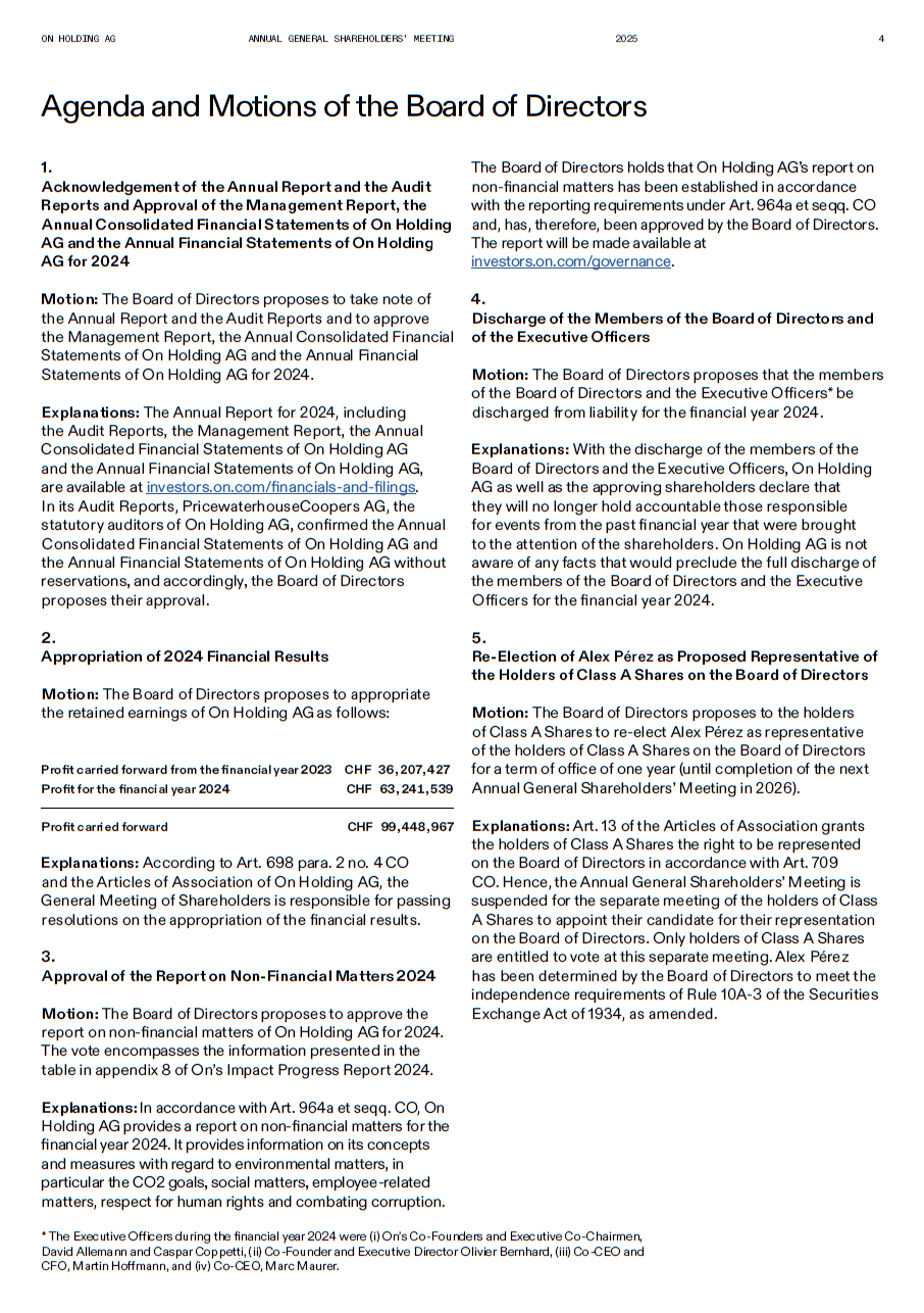 Acknowledgement of the Annual Report and the Audit Reports and Approval of the Management Report, the Annual Consolidated Financial Statements of On Holding AG and the Annual Financial Statements of On Holding AG for 2024 Motion: The Board of Directors proposes to take note of the Annual Report and the Audit Reports and to approve the Management Report, the Annual Consolidated Financial Statements of On Holding AG and the Annual Financial Statements of On Holding AG for 2024. Explanations: The Annual Report for 2024, including the Audit Reports, the Management Report, the Annual Consolidated Financial Statements of On Holding AG and the Annual Financial Statements of On Holding AG, are available at investors.on.com/financials - and - filings . In its Audit Reports, PricewaterhouseCoopers AG, the statutory auditors of On Holding AG, confirmed the Annual Consolidated Financial Statements of On Holding AG and the Annual Financial Statements of On Holding AG without reservations, and accordingly, the Board of Directors proposes their approval. 2. Appropriation of 2024 Financial Results Motion: The Board of Directors proposes to appropriate the retained earnings of On Holding AG as follows: Profit carried forward from the financial year 2023 Profit for the financial year 2024 CHF 36,207,427 CHF 63,241,539 Profit carried forward CHF 99,448,967 Explanations: According to Art. 698 para. 2 no. 4 CO and the Articles of Association of On Holding AG, the General Meeting of Shareholders is responsible for passing resolutions on the appropriation of the financial results. 3. Approval of the Report on Non - Financial Matters 2024 Motion: The Board of Directors proposes to approve the report on non - financial matters of On Holding AG for 2024. The vote encompasses the information presented in the table in appendix 8 of On’s Impact Progress Report 2024. Explanations: In accordance with Art. 964a et seqq. CO, On Holding AG provides a report on non - financial matters for the financial year 2024. It provides information on its concepts and measures with regard to environmental matters, in particular the CO2 goals, social matters, employee - related matters, respect for human rights and combating corruption. The Board of Directors holds that On Holding AG’s report on non - financial matters has been established in accordance with the reporting requirements under Art. 964a et seqq. CO and, has, therefore, been approved by the Board of Directors. The report will be made available at investors.on.com/governance . 4. Discharge of the Members of the Board of Directors and of the Executive Officers Motion: The Board of Directors proposes that the members of the Board of Directors and the Executive Officers* be discharged from liability for the financial year 2024. Explanations: With the discharge of the members of the Board of Directors and the Executive Officers, On Holding AG as well as the approving shareholders declare that they will no longer hold accountable those responsible for events from the past financial year that were brought to the attention of the shareholders. On Holding AG is not aware of any facts that would preclude the full discharge of the members of the Board of Directors and the Executive Officers for the financial year 2024. 5. Re - Election of Alex Pérez as Proposed Representative of the Holders of Class A Shares on the Board of Directors Motion: The Board of Directors proposes to the holders of Class A Shares to re - elect Alex Pérez as representative of the holders of Class A Shares on the Board of Directors for a term of office of one year (until completion of the next Annual General Shareholders’ Meeting in 2026). Explanations: Art. 13 of the Articles of Association grants the holders of Class A Shares the right to be represented on the Board of Directors in accordance with Art. 709 CO. Hence, the Annual General Shareholders’ Meeting is suspended for the separate meeting of the holders of Class A Shares to appoint their candidate for their representation on the Board of Directors. Only holders of Class A Shares are entitled to vote at this separate meeting. Alex Pérez has been determined by the Board of Directors to meet the independence requirements of Rule 10 A - 3 of the Securities Exchange Act of 1934 , as amended . * The Executive Officers during the financial year 2024 were (i) On’s Co - Founders and Executive Co - Chairmen, David Allemann and Caspar Coppetti, (ii) Co - Founder and Executive Director Olivier Bernhard, (iii) Co - CEO and CFO, Martin Hoffmann, and (iv) Co - CEO, Marc Maurer .