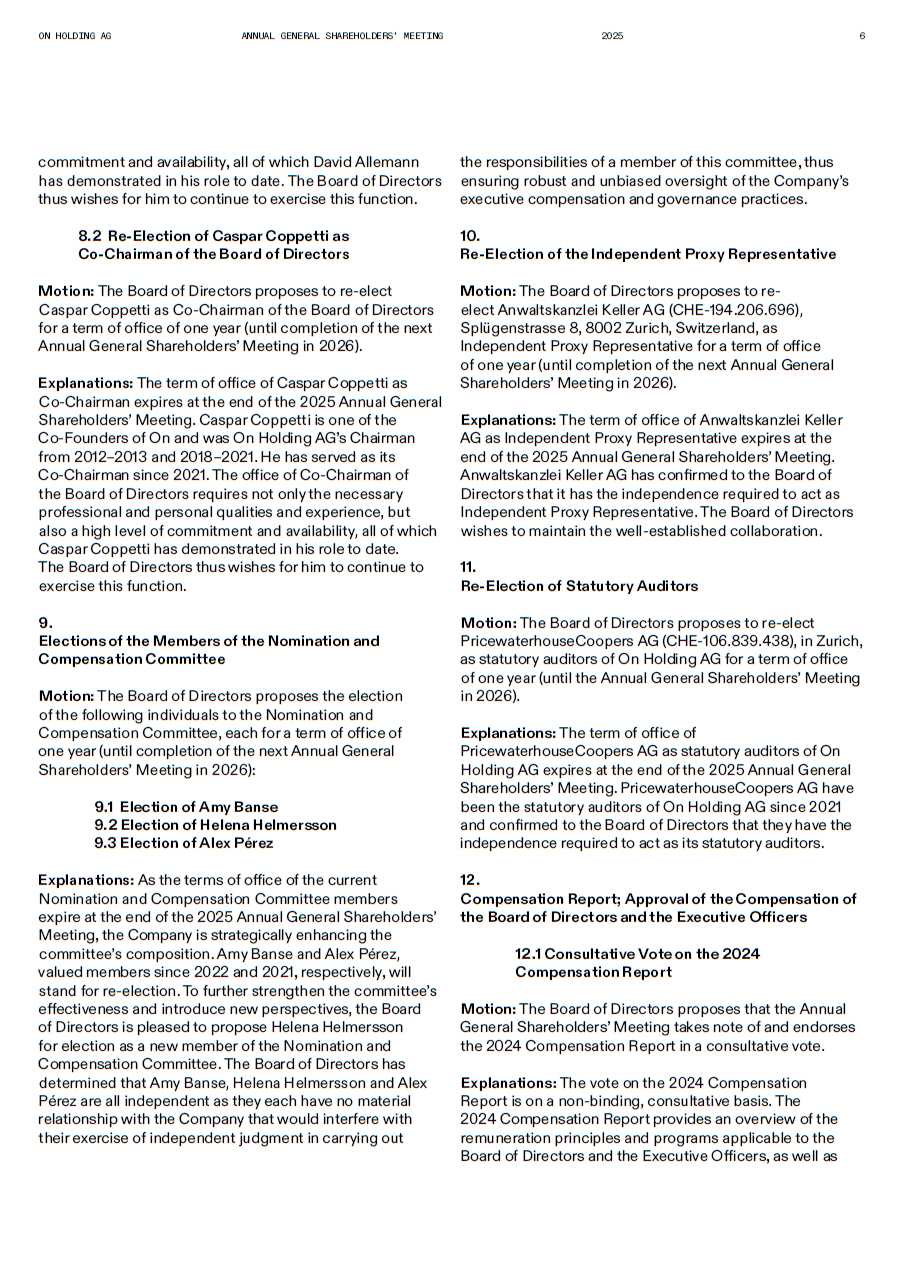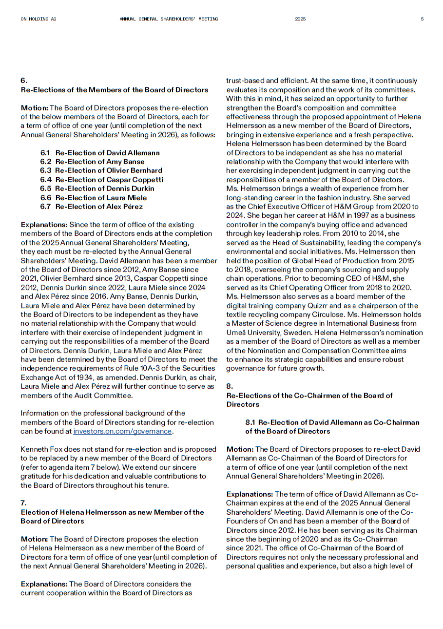 ON HOLDING AG ANNUAL GENERAL SHAREHOLDERS’ MEETING 5 2 0 25 6. Re - Elections of the Members of the Board of Directors Motion : The Board of Directors proposes the re - election of the below members of the Board of Directors, each for a term of office of one year (until completion of the next Annual General Shareholders’ Meeting in 2026 ), as follows : 1. Re - Election of David Allemann 2. Re - Election of Amy Banse 3. Re - Election of Olivier Bernhard 4. Re - Election of Caspar Coppetti 5. Re - Election of Dennis Durkin 6. Re - Election of Laura Miele 7. Re - Election of Alex Pérez Explanations: Since the term of office of the existing members of the Board of Directors ends at the completion of the 2025 Annual General Shareholders’ Meeting, they each must be re - elected by the Annual General Shareholders’ Meeting. David Allemann has been a member of the Board of Directors since 2012, Amy Banse since 2021, Olivier Bernhard since 2013, Caspar Coppetti since 2012, Dennis Durkin since 2022, Laura Miele since 2024 and Alex Pérez since 2016. Amy Banse, Dennis Durkin, Laura Miele and Alex Pérez have been determined by the Board of Directors to be independent as they have no material relationship with the Company that would interfere with their exercise of independent judgment in carrying out the responsibilities of a member of the Board of Directors. Dennis Durkin, Laura Miele and Alex Pérez have been determined by the Board of Directors to meet the independence requirements of Rule 10A - 3 of the Securities Exchange Act of 1934, as amended. Dennis Durkin, as chair, Laura Miele and Alex Pérez will further continue to serve as members of the Audit Committee. Information on the professional background of the members of the Board of Directors standing for re - election can be found at investors.on.com/governance . Kenneth Fox does not stand for re - election and is proposed to be replaced by a new member of the Board of Directors (refer to agenda item 7 below). We extend our sincere gratitude for his dedication and valuable contributions to the Board of Directors throughout his tenure. 7. Election of Helena Helmersson as new Member of the Board of Directors Motion: The Board of Directors proposes the election of Helena Helmersson as a new member of the Board of Directors for a term of office of one year (until completion of the next Annual General Shareholders’ Meeting in 2026). Explanations: The Board of Directors considers the current cooperation within the Board of Directors as trust - based and efficient. At the same time, it continuously evaluates its composition and the work of its committees. With this in mind, it has seized an opportunity to further strengthen the Board’s composition and committee effectiveness through the proposed appointment of Helena Helmersson as a new member of the Board of Directors, bringing in extensive experience and a fresh perspective. Helena Helmersson has been determined by the Board of Directors to be independent as she has no material relationship with the Company that would interfere with her exercising independent judgment in carrying out the responsibilities of a member of the Board of Directors. Ms. Helmersson brings a wealth of experience from her long - standing career in the fashion industry. She served as the Chief Executive Officer of H&M Group from 2020 to 2024. She began her career at H&M in 1997 as a business controller in the company’s buying office and advanced through key leadership roles. From 2010 to 2014, she served as the Head of Sustainability, leading the company’s environmental and social initiatives. Ms. Helmersson then held the position of Global Head of Production from 2015 to 2018, overseeing the company’s sourcing and supply chain operations. Prior to becoming CEO of H&M, she served as its Chief Operating Officer from 2018 to 2020. Ms. Helmersson also serves as a board member of the digital training company Quizrr and as a chairperson of the textile recycling company Circulose. Ms. Helmersson holds a Master of Science degree in International Business from Umeå University, Sweden. Helena Helmersson’s nomination as a member of the Board of Directors as well as a member of the Nomination and Compensation Committee aims to enhance its strategic capabilities and ensure robust governance for future growth. 8. Re - Elections of the Co - Chairmen of the Board of Directors 8.1 Re - Election of David Allemann as Co - Chairman of the Board of Directors Motion: The Board of Directors proposes to re - elect David Allemann as Co - Chairman of the Board of Directors for a term of office of one year (until completion of the next Annual General Shareholders’ Meeting in 2026). Explanations: The term of office of David Allemann as Co - Chairman expires at the end of the 2025 Annual General Shareholders’ Meeting. David Allemann is one of the Co - Founders of On and has been a member of the Board of Directors since 2012. He has been serving as its Chairman since the beginning of 2020 and as its Co - Chairman since 2021. The office of Co - Chairman of the Board of Directors requires not only the necessary professional and personal qualities and experience, but also a high level of ON HOLDING AG ANNUAL GENERAL SHAREHOLDERS’ MEETING 6 2 0 25 commitment and availability, all of which David Allemann has demonstrated in his role to date.