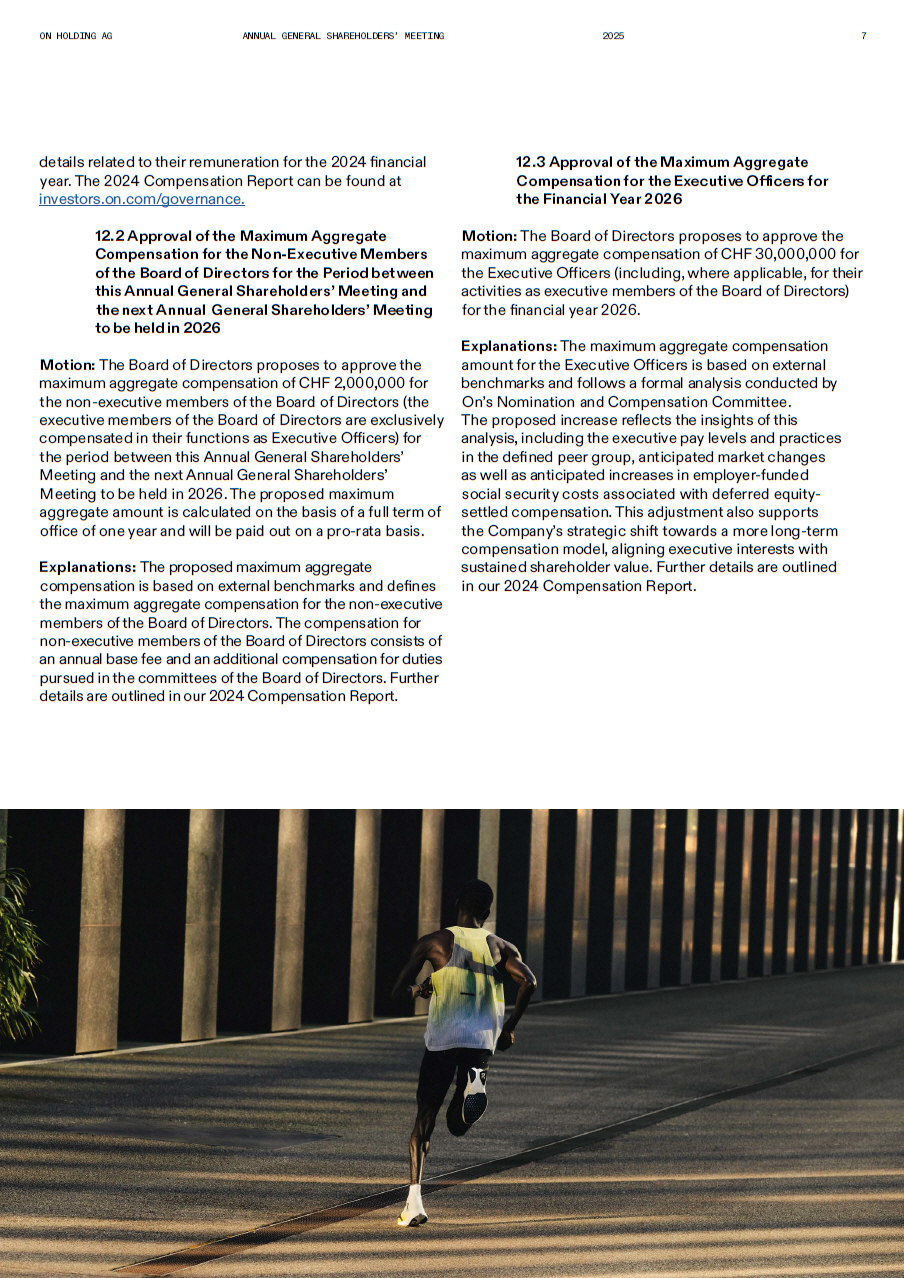 The 2024 Compensation Report can be found at investors.on.com/governance. 12.2 Approval of the Maximum Aggregate Compensation for the Non - Executive Members of the Board of Directors for the Period between this Annual General Shareholders’ Meeting and the next Annual General Shareholders’ Meeting to be held in 2026 Motion: The Board of Directors proposes to approve the maximum aggregate compensation of CHF 2,000,000 for the non - executive members of the Board of Directors (the executive members of the Board of Directors are exclusively compensated in their functions as Executive Officers) for the period between this Annual General Shareholders’ Meeting and the next Annual General Shareholders’ Meeting to be held in 2026. The proposed maximum aggregate amount is calculated on the basis of a full term of office of one year and will be paid out on a pro - rata basis. Explanations: The proposed maximum aggregate compensation is based on external benchmarks and defines the maximum aggregate compensation for the non - executive members of the Board of Directors. The compensation for non - executive members of the Board of Directors consists of an annual base fee and an additional compensation for duties pursued in the committees of the Board of Directors. Further details are outlined in our 2024 Compensation Report. 12.3 Approval of the Maximum Aggregate Compensation for the Executive Officers for the Financial Year 2026 Motion: The Board of Directors proposes to approve the maximum aggregate compensation of CHF 30,000,000 for the Executive Officers (including, where applicable, for their activities as executive members of the Board of Directors) for the financial year 2026. Explanations: The maximum aggregate compensation amount for the Executive Officers is based on external benchmarks and follows a formal analysis conducted by On’s Nomination and Compensation Committee. The proposed increase reflects the insights of this analysis, including the executive pay levels and practices in the defined peer group, anticipated market changes as well as anticipated increases in employer - funded social security costs associated with deferred equity - settled compensation. This adjustment also supports the Company’s strategic shift towards a more long - term compensation model, aligning executive interests with sustained shareholder value. Further details are outlined in our 2024 Compensation Report.
