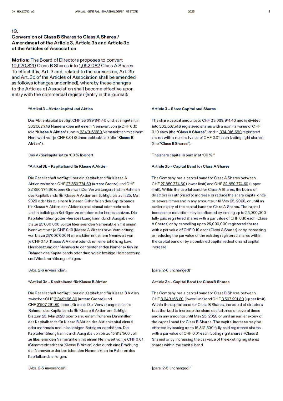 ON HOLDING AG ANNUAL GENERAL SHAREHOLDERS’ MEETING 8 2 0 25 13. Conversion of Class B Shares to Class A Shares / Amendment of the Article 3, Article 3b and Article 3c of the Articles of Association Motion: The Board of Directors proposes to convert 10,520,820 Class B Shares into 1,052,082 Class A Shares. To effect this, Art. 3 and, related to the conversion, Art. 3b and Art. 3c of the Articles of Association shall be amended as follows (changes underlined), whereby these changes to the Articles of Association shall become effective upon entry with the commercial register (entry in the journal): “Artikel 3 – Aktienkapital und Aktien Das Aktienkapital beträgt CHF 33’699’941.40 und ist eingeteilt in 303’507’746 Namenaktien mit einem Nennwert von je CHF 0.10 (die “Klasse A Aktien” ) und in 334’916’680 Namenaktien mit einem Nennwert von je CHF 0.01 (Stimmrechtsaktien) (die “Klasse B Aktien” ). Das Aktienkapital ist zu 100 % liberiert. “Artikel 3b – Kapitalband für Klasse A Aktien Die Gesellschaft verfügt über ein Kapitalband für Klasse A Aktien zwischen CHF 27 ’ 850 ’ 774 . 60 (untere Grenze) und CHF 32 ’ 850 ’ 774 . 60 (obere Grenze) . Der Verwaltungsrat ist im Rahmen des Kapitalbands für Klasse A Aktien ermächtigt, bis zum 25 . Mai 2028 oder bis zu einem früheren Dahinfallen des Kapitalbands für Klasse A Aktien das Aktienkapital einmal oder mehrmals und in beliebigen Beträgen zu erhöhen oder herabzusetzen. Die Kapitalerhöhung oder - herabsetzung kann durch Ausgabe von bis zu 25’000’000 voll zu liberierenden Namenaktien mit einem Nennwert von je CHF 0.10 (Klasse A Aktien) bzw. Vernichtung von bis zu 25’000’000 Namenaktien mit einem Nennwert von je CHF 0.10 (Klasse A Aktien) oder durch eine Erhöhung bzw. Herabsetzung der Nennwerte der bestehenden Namenaktien im Rahmen des Kapitalbands oder durch gleichzeitige Herabsetzung und Wiedererhöhung erfolgen. [Abs. 2 - 6 unverändert] “Artikel 3c – Kapitalband für Klasse B Aktien Die Gesellschaft verfügt über ein Kapitalband für Klasse B Aktien zwischen CHF 3’349’166.80 (untere Grenze) und CHF 3’507’291.80 (obere Grenze). Der Verwaltungsrat ist im Rahmen des Kapitalbands für Klasse B Aktien ermächtigt, bis zum 25. Mai 2028 oder bis zu einem früheren Dahinfallen des Kapitalbands für Klasse B Aktien das Aktienkapital einmal oder mehrmals und in beliebigen Beträgen zu erhöhen. Die Kapitalerhöhung kann durch Ausgabe von bis zu 15’812’500 voll zu liberierenden Namenaktien mit einem Nennwert von je CHF 0.01 (Stimmrechtsaktien) (Klasse B Aktien) oder durch eine Erhöhung der Nennwerte der bestehenden Namenaktien im Rahmen des Kapitalbands erfolgen. [Abs. 2 - 5 unverändert] Article 3 – Share Capital and Shares The share capital amounts to CHF 33,699,941.40 and is divided into 303,507,746 registered shares with a nominal value of CHF 0.10 each (the “Class A Shares” ) and in 334,916,680 registered shares with a nominal value of CHF 0.01 each (voting right shares) (the “Class B Shares” ). The share capital is paid in at 100 %.” Article 3b – Capital Band for Class A Shares The Company has a capital band for Class A Shares between CHF 27,850,774.60 (lower limit) and CHF 32,850,774.60 (upper limit). Within the capital band for Class A Shares, the board of directors is authorized to increase or reduce the share capital once or several times and in any amounts until May 25, 2028, or until an earlier expiry of the capital band for Class A Shares. The capital increase or reduction may be effected by issuing up to 25,000,000 fully paid registered shares with a par value of CHF 0.10 each (Class A Shares) or by cancelling up to 25,000,000 registered shares with a par value of CHF 0.10 each (Class A Shares) or by increasing or reducing the par value of the existing registered shares within the capital band or by a combined capital reduction and capital increase. [para. 2 - 6 unchanged]” Article 3c – Capital Band for Class B Shares The Company has a capital band for Class B Shares between CHF 3,349,166.80 (lower limit) and CHF 3,507,291.80 (upper limit). Within the capital band for Class B Shares, the board of directors is authorized to increase the share capital once or several times and in any amounts until May 25, 2028 or until an earlier expiry of the capital band for Class B Shares. The capital increase may be effected by issuing up to 15,812,500 fully paid registered shares with a par value of CHF 0.01 each (voting right shares) (Class B Shares) or by increasing the par value of the existing registered shares within the capital band. [para. 2 - 5 unchanged]”
