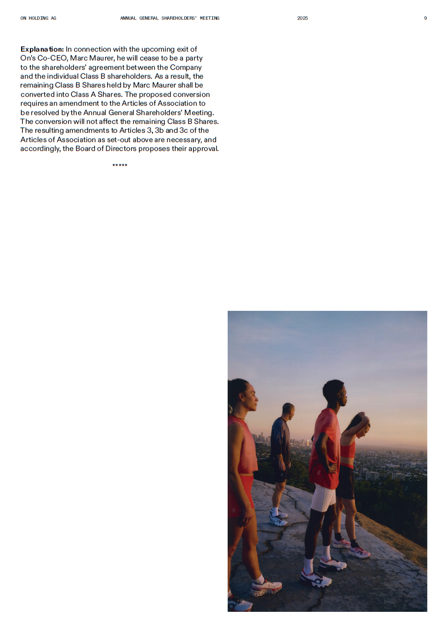 ON HOLDING AG ANNUAL GENERAL SHAREHOLDERS’ MEETING 9 2 0 25 Explanation: In connection with the upcoming exit of On’s Co - CEO, Marc Maurer, he will cease to be a party to the shareholders’ agreement between the Company and the individual Class B shareholders. As a result, the remaining Class B Shares held by Marc Maurer shall be converted into Class A Shares. The proposed conversion requires an amendment to the Articles of Association to be resolved by the Annual General Shareholders’ Meeting. The conversion will not affect the remaining Class B Shares. The resulting amendments to Articles 3, 3b and 3c of the Articles of Association as set - out above are necessary, and accordingly, the Board of Directors proposes their approval.