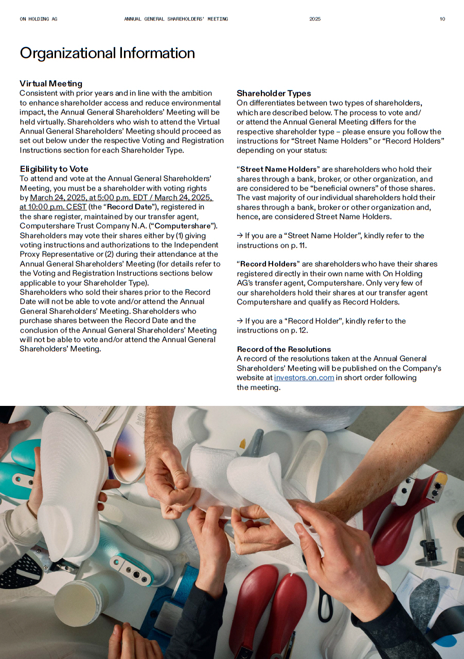 ***** ON HOLDING AG ANNUAL GENERAL SHAREHOLDERS’ MEETING 10 2 0 25 Shareholder Types On differentiates between two types of shareholders, which are described below . The process to vote and/ or attend the Annual General Meeting differs for the respective shareholder type – please ensure you follow the instructions for “Street Name Holders” or “Record Holders” depending on your status: “ Street Name Holders ” are shareholders who hold their shares through a bank, broker, or other organization, and are considered to be “beneficial owners” of those shares. The vast majority of our individual shareholders hold their shares through a bank, broker or other organization and, hence, are considered Street Name Holders. * If you are a “Street Name Holder”, kindly refer to the instructions on p. 11. “ Record Holders ” are shareholders who have their shares registered directly in their own name with On Holding AG’s transfer agent, Computershare. Only very few of our shareholders hold their shares at our transfer agent Computershare and qualify as Record Holders. * If you are a “Record Holder”, kindly refer to the instructions on p. 12. Record of the Resolutions A record of the resolutions taken at the Annual General Shareholders’ Meeting will be published on the Company’s website at investors.on.com in short order following the meeting. Organizational Information Virtual Meeting Consistent with prior years and in line with the ambition to enhance shareholder access and reduce environmental impact, the Annual General Shareholders’ Meeting will be held virtually. Shareholders who wish to attend the Virtual Annual General Shareholders’ Meeting should proceed as set out below under the respective Voting and Registration Instructions section for each Shareholder Type. Eligibility to Vote To attend and vote at the Annual General Shareholders’ Meeting, you must be a shareholder with voting rights by March 24, 2025, at 5:00 p.m. EDT / March 24, 2025, at 10:00 p.m. CEST (the “ Record Date ”), registered in the share register, maintained by our transfer agent, Computershare Trust Company N.A. (“ Computershare ”). Shareholders may vote their shares either by (1) giving voting instructions and authorizations to the Independent Proxy Representative or (2) during their attendance at the Annual General Shareholders’ Meeting (for details refer to the Voting and Registration Instructions sections below applicable to your Shareholder Type). Shareholders who sold their shares prior to the Record Date will not be able to vote and/or attend the Annual General Shareholders’ Meeting. Shareholders who purchase shares between the Record Date and the conclusion of the Annual General Shareholders’ Meeting will not be able to vote and/or attend the Annual General Shareholders’ Meeting. Place image ON HOLDING AG ANNUAL GENERAL SHAREHOLDERS’ MEETING 11 2 0 25 The following instructions apply to “Street Name Holders” (see definitions on p.