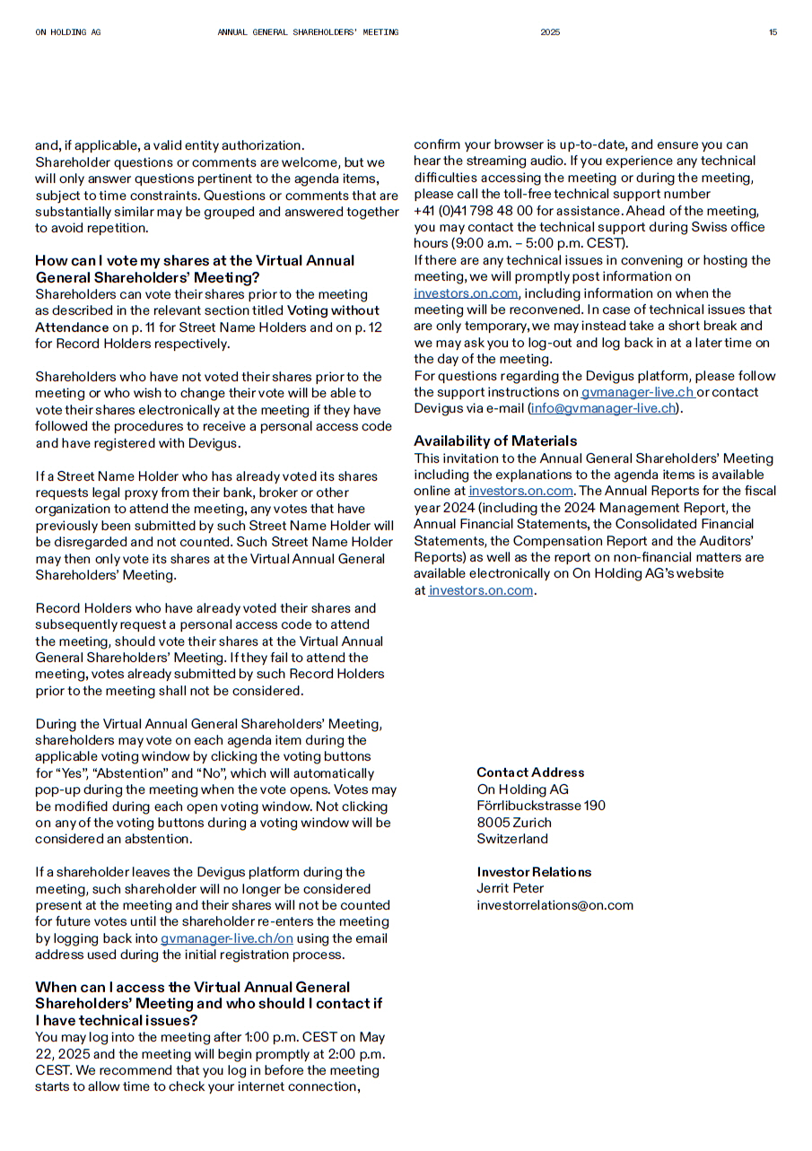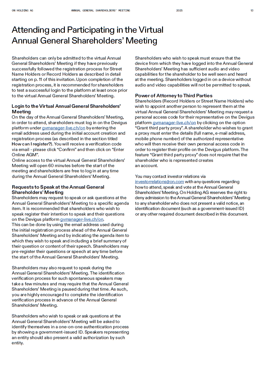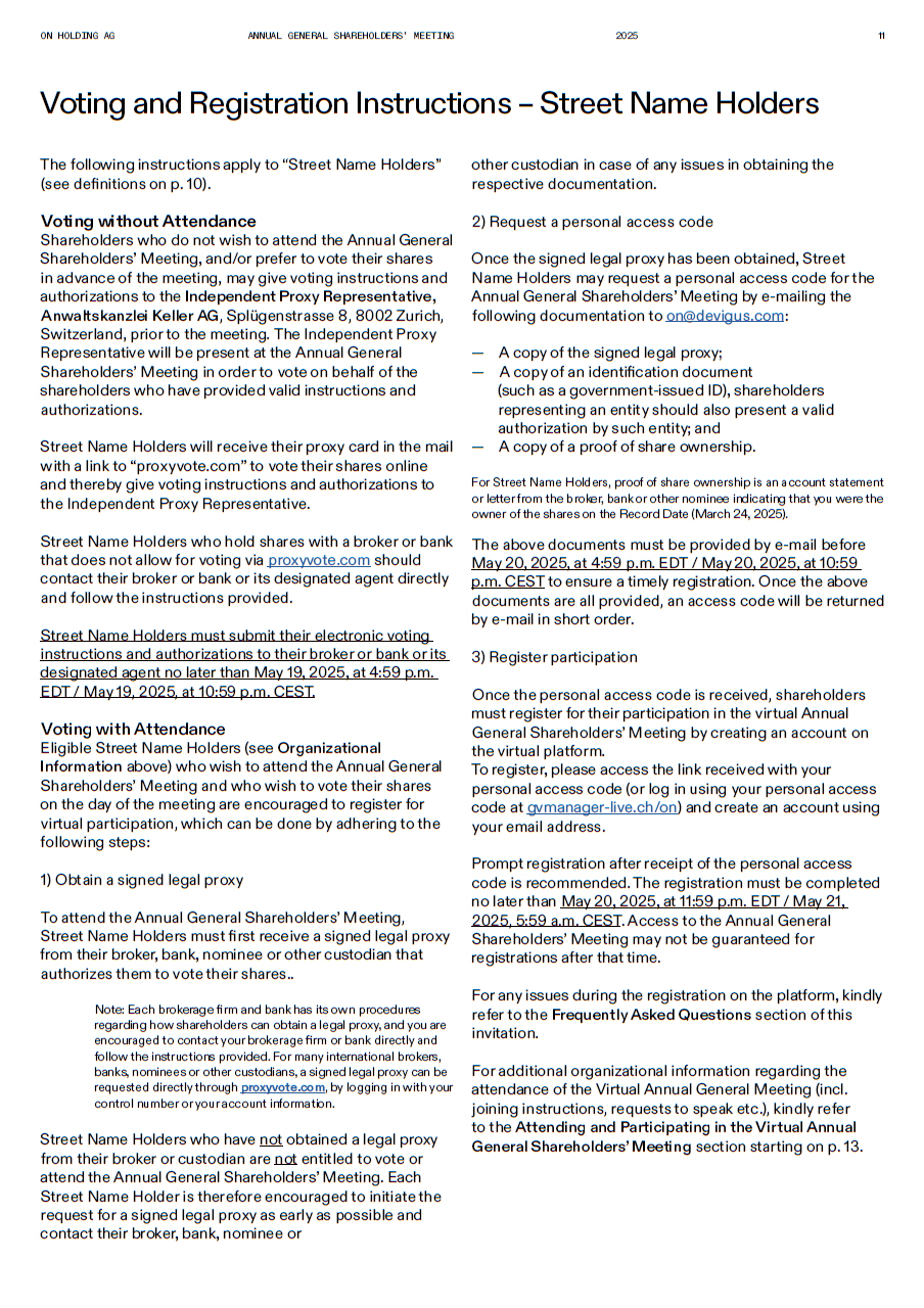 10). Voting without Attendance Shareholders who do not wish to attend the Annual General Shareholders’ Meeting, and/or prefer to vote their shares in advance of the meeting, may give voting instructions and authorizations to the Independent Proxy Representative, Anwaltskanzlei Keller AG , Splügenstrasse 8, 8002 Zurich, Switzerland, prior to the meeting. The Independent Proxy Representative will be present at the Annual General Shareholders’ Meeting in order to vote on behalf of the shareholders who have provided valid instructions and authorizations. Street Name Holders will receive their proxy card in the mail with a link to “proxyvote.com” to vote their shares online and thereby give voting instructions and authorizations to the Independent Proxy Representative. Street Name Holders who hold shares with a broker or bank that does not allow for voting via proxyvote.com should contact their broker or bank or its designated agent directly and follow the instructions provided. Street Name Holders must submit their electronic voting instructions and authorizations to their broker or bank or its designated agent no later than May 19, 2025, at 4:59 p.m. EDT / May 19, 2025, at 10:59 p.m. CEST. Voting with Attendance Eligible Street Name Holders (see Organizational Information above) who wish to attend the Annual General Shareholders’ Meeting and who wish to vote their shares on the day of the meeting are encouraged to register for virtual participation, which can be done by adhering to the following steps: 1) Obtain a signed legal proxy To attend the Annual General Shareholders’ Meeting, Street Name Holders must first receive a signed legal proxy from their broker, bank, nominee or other custodian that authorizes them to vote their shares.. Note: Each brokerage firm and bank has its own procedures regarding how shareholders can obtain a legal proxy, and you are encouraged to contact your brokerage firm or bank directly and follow the instructions provided. For many international brokers, banks, nominees or other custodians, a signed legal proxy can be requested directly through proxyvote.com , by logging in with your control number or your account information. Street Name Holders who have not obtained a legal proxy from their broker or custodian are not entitled to vote or attend the Annual General Shareholders’ Meeting. Each Street Name Holder is therefore encouraged to initiate the request for a signed legal proxy as early as possible and contact their broker, bank, nominee or other custodian in case of any issues in obtaining the respective documentation. 2) Request a personal access code Once the signed legal proxy has been obtained, Street Name Holders may request a personal access code for the Annual General Shareholders’ Meeting by e - mailing the following documentation to on@devigus.com : — A copy of the signed legal proxy; — A copy of an identification document (such as a government - issued ID), shareholders representing an entity should also present a valid authorization by such entity; and — A copy of a proof of share ownership. For Street Name Holders, proof of share ownership is an account statement or letter from the broker, bank or other nominee indicating that you were the owner of the shares on the Record Date (March 24 , 2025 ) . The above documents must be provided by e - mail before May 20, 2025, at 4:59 p.m. EDT / May 20, 2025, at 10:59 p.m. CEST to ensure a timely registration. Once the above documents are all provided, an access code will be returned by e - mail in short order. 3) Register participation Once the personal access code is received, shareholders must register for their participation in the virtual Annual General Shareholders’ Meeting by creating an account on the virtual platform. To register, please access the link received with your personal access code (or log in using your personal access code at gvmanager - live.ch/on ) and create an account using your email address. Prompt registration after receipt of the personal access code is recommended. The registration must be completed no later than May 20, 2025, at 11:59 p.m. EDT / May 21, 2025, 5:59 a.m. CEST . Access to the Annual General Shareholders’ Meeting may not be guaranteed for registrations after that time. For any issues during the registration on the platform, kindly refer to the Frequently Asked Questions section of this invitation. For additional organizational information regarding the attendance of the Virtual Annual General Meeting (incl. joining instructions, requests to speak etc.), kindly refer to the Attending and Participating in the Virtual Annual General Shareholders’ Meeting section starting on p. 13. Voting and Registration Instructions – Street Name Holders ON HOLDING AG ANNUAL GENERAL SHAREHOLDERS’ MEETING 12 2 0 25 The following instructions apply to “Record Holders” (see definitions on p.