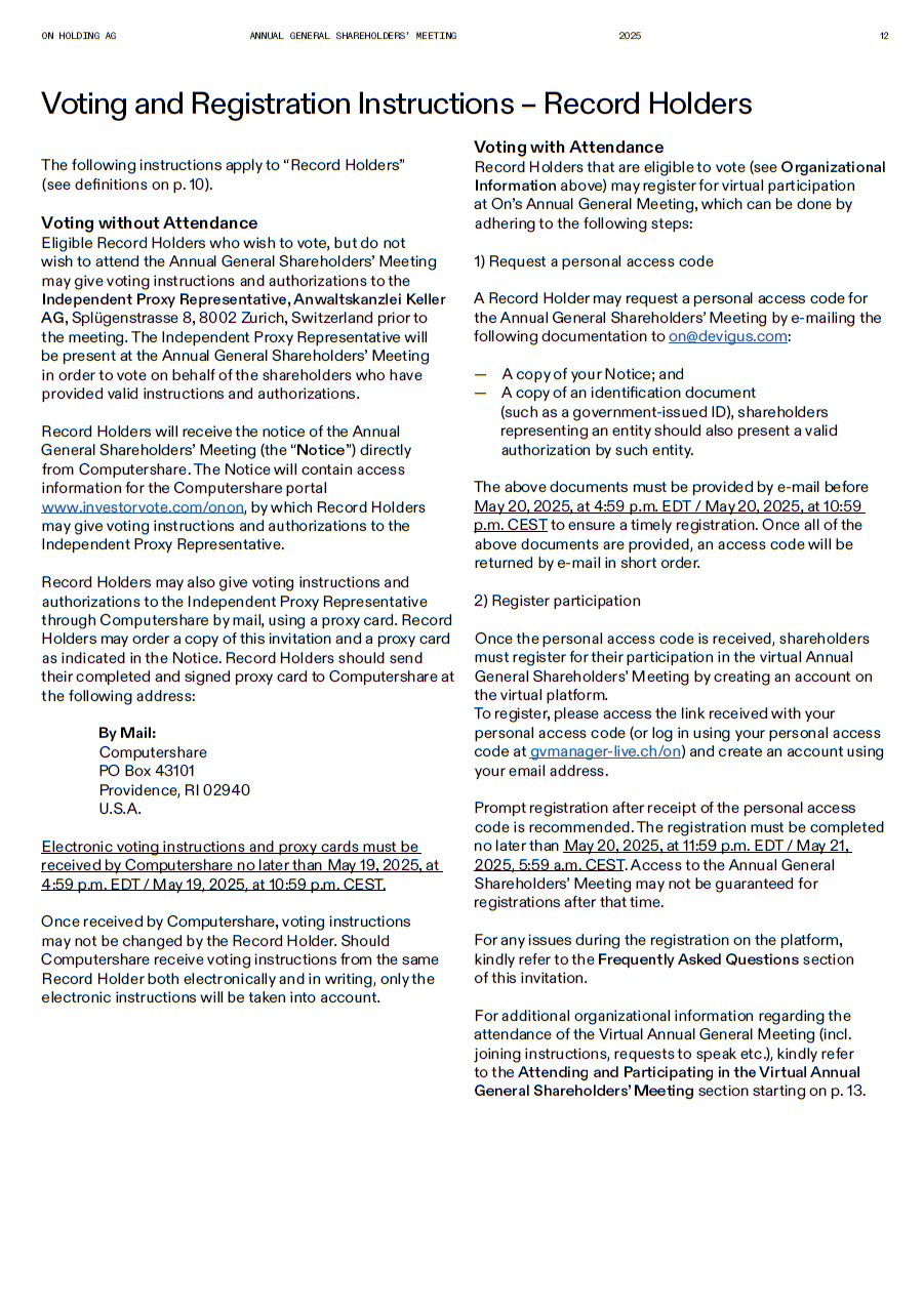 10). Voting without Attendance Eligible Record Holders who wish to vote, but do not wish to attend the Annual General Shareholders’ Meeting may give voting instructions and authorizations to the Independent Proxy Representative, Anwaltskanzlei Keller AG , Splügenstrasse 8, 8002 Zurich, Switzerland prior to the meeting. The Independent Proxy Representative will be present at the Annual General Shareholders’ Meeting in order to vote on behalf of the shareholders who have provided valid instructions and authorizations. Record Holders will receive the notice of the Annual General Shareholders’ Meeting (the “ Notice ”) directly from Computershare. The Notice will contain access information for the Computershare portal www.investorvote.com/onon , by which Record Holders may give voting instructions and authorizations to the Independent Proxy Representative. Record Holders may also give voting instructions and authorizations to the Independent Proxy Representative through Computershare by mail, using a proxy card. Record Holders may order a copy of this invitation and a proxy card as indicated in the Notice. Record Holders should send their completed and signed proxy card to Computershare at the following address: By Mail: Compu t e r sha r e PO Box 43101 Providence, RI 02940 U.S.A. Electronic voting instructions and proxy cards must be received by Computershare no later than May 19, 2025, at 4:59 p.m. EDT / May 19, 2025, at 10:59 p.m. CEST. Once received by Computershare, voting instructions may not be changed by the Record Holder. Should Computershare receive voting instructions from the same Record Holder both electronically and in writing, only the electronic instructions will be taken into account. Voting and Registration Instructions – Record Holders Voting with Attendance Record Holders that are eligible to vote (see Organizational Information above) may register for virtual participation at On’s Annual General Meeting, which can be done by adhering to the following steps: 1) Request a personal access code A Record Holder may request a personal access code for the Annual General Shareholders’ Meeting by e - mailing the following documentation to on@devigus.com : — A copy of your Notice; and — A copy of an identification document (such as a government - issued ID), shareholders representing an entity should also present a valid authorization by such entity. The above documents must be provided by e - mail before May 20, 2025, at 4:59 p.m. EDT / May 20, 2025, at 10:59 p.m. CEST to ensure a timely registration. Once all of the above documents are provided, an access code will be returned by e - mail in short order. 2) Register participation Once the personal access code is received, shareholders must register for their participation in the virtual Annual General Shareholders’ Meeting by creating an account on the virtual platform. To register, please access the link received with your personal access code (or log in using your personal access code at gvmanager - live.ch/on ) and create an account using your email address. Prompt registration after receipt of the personal access code is recommended. The registration must be completed no later than May 20, 2025, at 11:59 p.m. EDT / May 21, 2025, 5:59 a.m. CEST . Access to the Annual General Shareholders’ Meeting may not be guaranteed for registrations after that time. For any issues during the registration on the platform, kindly refer to the Frequently Asked Questions section of this invitation. For additional organizational information regarding the attendance of the Virtual Annual General Meeting (incl. joining instructions, requests to speak etc.), kindly refer to the Attending and Participating in the Virtual Annual General Shareholders’ Meeting section starting on p. 13.