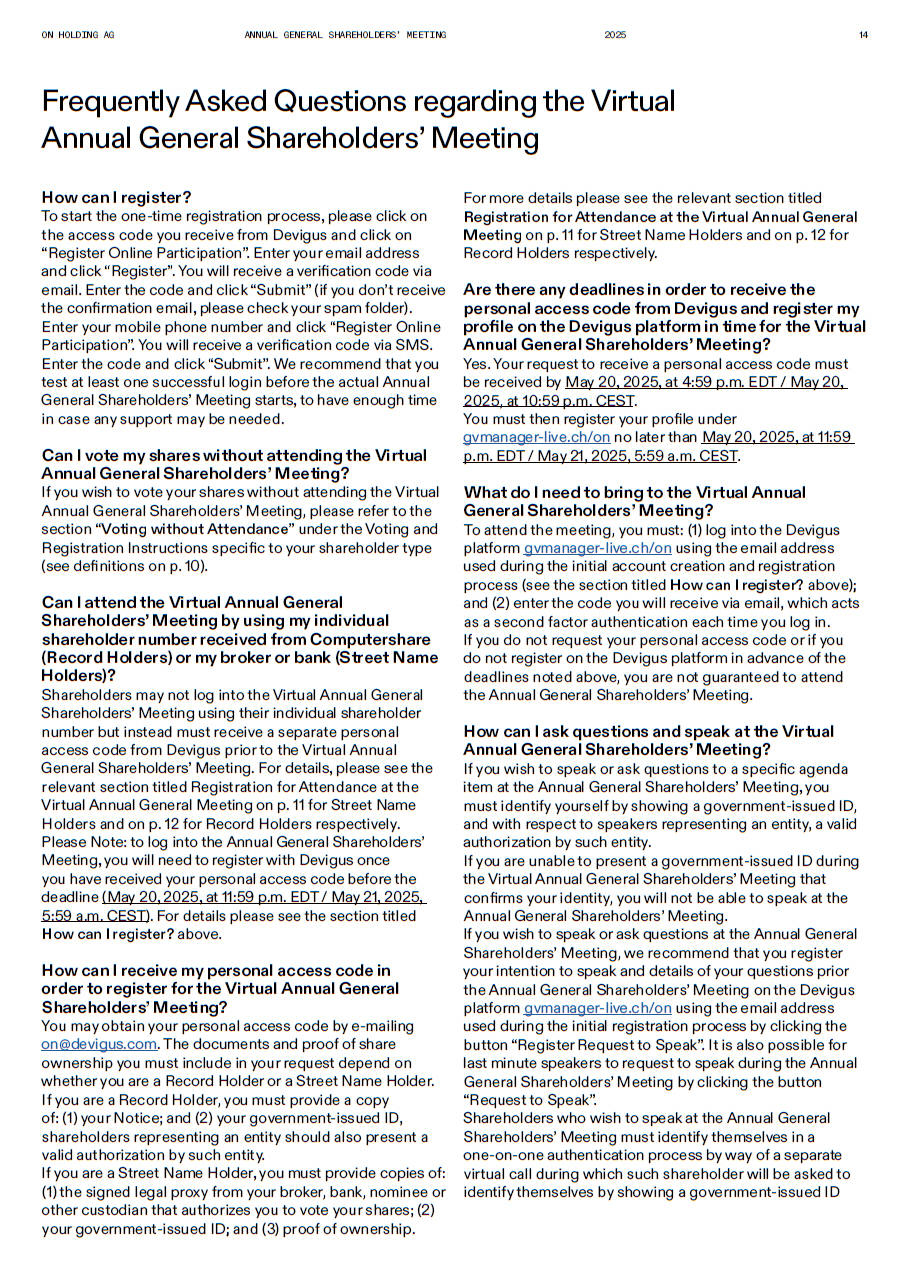 ON HOLDING AG ANNUAL GENERAL SHAREHOLDERS’ MEETING 14 2 0 25 How can I register? To start the one - time registration process, please click on the access code you receive from Devigus and click on “Register Online Participation”. Enter your email address and click “Register”. You will receive a verification code via email. Enter the code and click “Submit” (if you don’t receive the confirmation email, please check your spam folder). Enter your mobile phone number and click “Register Online Participation”. You will receive a verification code via SMS. Enter the code and click “Submit”. We recommend that you test at least one successful login before the actual Annual General Shareholders’ Meeting starts, to have enough time in case any support may be needed. Can I vote my shares without attending the Virtual Annual General Shareholders’ Meeting? If you wish to vote your shares without attending the Virtual Annual General Shareholders’ Meeting, please refer to the section “ Voting without Attendance ” under the Voting and Registration Instructions specific to your shareholder type (see definitions on p. 10). Can I attend the Virtual Annual General Shareholders’ Meeting by using my individual shareholder number received from Computershare (Record Holders) or my broker or bank (Street Name Holders)? Shareholders may not log into the Virtual Annual General Shareholders’ Meeting using their individual shareholder number but instead must receive a separate personal access code from Devigus prior to the Virtual Annual General Shareholders’ Meeting. For details, please see the relevant section titled Registration for Attendance at the Virtual Annual General Meeting on p. 11 for Street Name Holders and on p. 12 for Record Holders respectively. Please Note: to log into the Annual General Shareholders’ Meeting, you will need to register with Devigus once you have received your personal access code before the deadline (May 20, 2025, at 11:59 p.m. EDT / May 21, 2025, 5:59 a.m. CEST) . For details please see the section titled How can I register? above. How can I receive my personal access code in order to register for the Virtual Annual General Shareholders’ Meeting? You may obtain your personal access code by e - mailing on@devigus.com . The documents and proof of share ownership you must include in your request depend on whether you are a Record Holder or a Street Name Holder. If you are a Record Holder, you must provide a copy of: (1) your Notice; and (2) your government - issued ID, shareholders representing an entity should also present a valid authorization by such entity. If you are a Street Name Holder, you must provide copies of: (1) the signed legal proxy from your broker, bank, nominee or other custodian that authorizes you to vote your shares; (2) your government - issued ID; and (3) proof of ownership. For more details please see the relevant section titled Registration for Attendance at the Virtual Annual General Meeting on p. 11 for Street Name Holders and on p. 12 for Record Holders respectively. Are there any deadlines in order to receive the personal access code from Devigus and register my profile on the Devigus platform in time for the Virtual Annual General Shareholders’ Meeting? Yes . Your request to receive a personal access code must be received by May 20 , 2025 , at 4 : 59 p . m . EDT / May 20 , 2025 , at 10 : 59 p . m . CEST . You must then register your profile under gvmanager - live . ch/on no later than May 20 , 2025 , at 11 : 59 p . m . EDT / May 21 , 2025 , 5 : 59 a . m . CEST . What do I need to bring to the Virtual Annual General Shareholders’ Meeting? To attend the meeting, you must: (1) log into the Devigus platform gvmanager - live.ch/on using the email address used during the initial account creation and registration process (see the section titled How can I register? above); and (2) enter the code you will receive via email, which acts as a second factor authentication each time you log in. If you do not request your personal access code or if you do not register on the Devigus platform in advance of the deadlines noted above, you are not guaranteed to attend the Annual General Shareholders’ Meeting . How can I ask questions and speak at the Virtual Annual General Shareholders’ Meeting? If you wish to speak or ask questions to a specific agenda item at the Annual General Shareholders’ Meeting, you must identify yourself by showing a government - issued ID, and with respect to speakers representing an entity, a valid authorization by such entity. If you are unable to present a government - issued ID during the Virtual Annual General Shareholders’ Meeting that confirms your identity, you will not be able to speak at the Annual General Shareholders’ Meeting. If you wish to speak or ask questions at the Annual General Shareholders’ Meeting, we recommend that you register your intention to speak and details of your questions prior the Annual General Shareholders’ Meeting on the Devigus platform gvmanager - live.ch/on using the email address used during the initial registration process by clicking the button “Register Request to Speak”. It is also possible for last minute speakers to request to speak during the Annual General Shareholders’ Meeting by clicking the button “Request to Speak”. Shareholders who wish to speak at the Annual General Shareholders’ Meeting must identify themselves in a one - on - one authentication process by way of a separate virtual call during which such shareholder will be asked to identify themselves by showing a government - issued ID Frequently Asked Questions regarding the Virtual Annual General Shareholders’ Meeting ON HOLDING AG ANNUAL GENERAL SHAREHOLDERS’ MEETING 15 2 0 25 and, if applicable, a valid entity authorization.