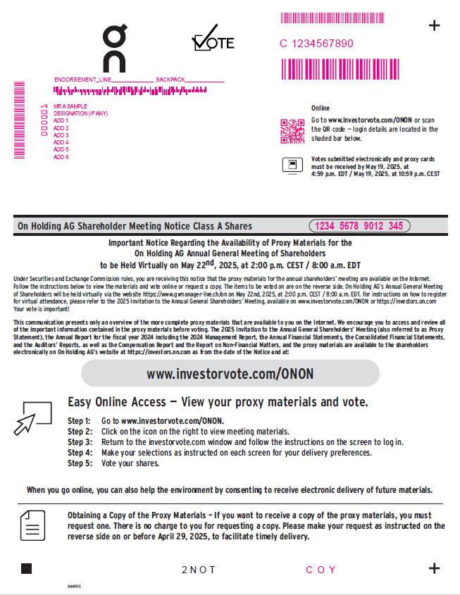 Online Go to www.investorvote.com/ONON or scan the QR code — login details are located in the shaded bar below. 044VHE Important Notice Regarding the Availability of Proxy Materials for the On Holding AG Annual General Meeting of Shareholders to be Held Virtually on May 22 nd , 2025, at 2:00 p.m. CEST / 8:00 a.m. EDT Under Securities and Exchange Commission rules, you are receiving this notice that the proxy materials for the annual shareholders’ meeting are available on the Internet. Follow the instructions below to view the materials and vote online or request a copy. The items to be voted on are on the reverse side. On Holding AG’s Annual General Meeting of Shareholders will be held virtually via the website https:// www.gvmanager - live.ch/on on May 22nd, 2025, at 2:00 p.m. CEST / 8:00 a.m. EDT. For instructions on how to register for virtual attendance, please refer to the 2025 Invitation to the Annual General Shareholders’ Meeting, available on www.investorvote.com/ONON or https://investors.on.com Your vote is important! This communication presents only an overview of the more complete proxy materials that are available to you on the Internet. We encourage you to access and review all of the important information contained in the proxy materials before voting. The 2025 Invitation to the Annual General Shareholders’ Meeting (also referred to as Proxy Statement), the Annual Report for the fiscal year 2024 including the 2024 Management Report, the Annual Financial Statements, the Consolidated Financial Statements, and the Auditors’ Reports, as well as the Compensation Report and the Report on Non - Financial Matters, and the proxy materials are available to the shareholders electronically on On Holding AG’s website at https://investors.on.com as from the date of the Notice and at: 2 N O T www.investorvote.com/ONON Easy Online Access — View your proxy materials and vote. When you go online, you can also help the environment by consenting to receive electronic delivery of future materials. Obtaining a Copy of the Proxy Materials – If you want to receive a copy of the proxy materials, you must request one. There is no charge to you for requesting a copy. Please make your request as instructed on the reverse side on or before April 29, 2025, to facilitate timely delivery. Step 1: Step 2: Step 3: Step 4: Step 5: Go to www.investorvote.com/ONON. Click on the icon on the right to view meeting materials. Return to the investorvote.com window and follow the instructions on the screen to log in. Make your selections as instructed on each screen for your delivery preferences. Vote your shares. Votes submitted electronically and proxy cards must be received by May 19, 2025, at 4:59 p.m. EDT / May 19, 2025, at 10:59 p.m. CEST MMMMMMMMMMMM MMM MMM MMM 000001 MR A SAMPLE DESIGNATION (IF ANY) ADD 1 ADD 2 ADD 3 ADD 4 ADD 5 ADD 6 ENDORSEMENT_LINE______________ SACKPACK_____________ On Holding AG Shareholder Meeting Notice Class A Shares 1234 5678 9012 345 C 1234567890 C O Y MMMMMMM Agenda items to be voted on at the meeting are listed below along with the Board of Directors’ motions.