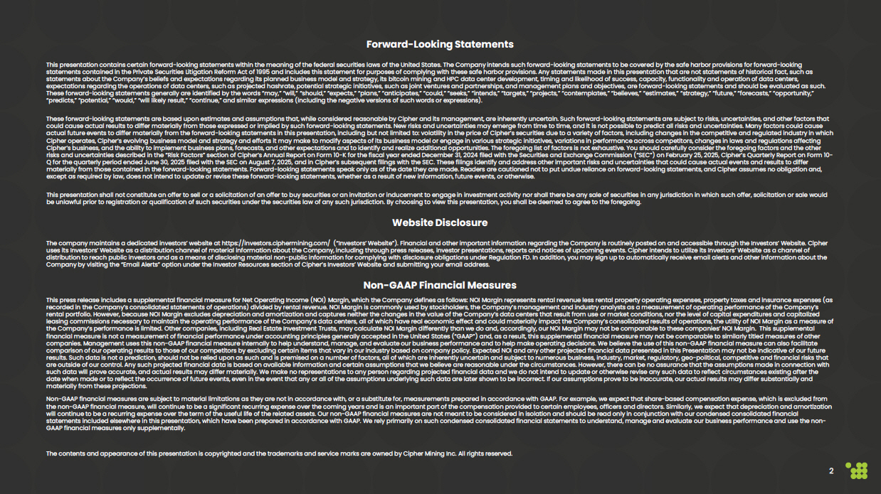 The Company intends such forward - looking statements to be covered by the safe harbor provisions for forward - looking statements contained in the Private Securities Litigation Reform Act of 1995 and includes this statement for purposes of complying with these safe harbor provisions. Any statements made in this presentation that are not statements of historical fact, such as statements about the Company’s beliefs and expectations regarding its planned business model and strategy, its bitcoin mining and HPC data center development, timing and likelihood of success, capacity, functionality and operation of data centers, expectations regarding the operations of data centers, such as projected hashrate, potential strategic initiatives, such as joint ventures and partnerships, and management plans and objectives, are forward - looking statements and should be evaluated as such. These forward - looking statements generally are identified by the words “may,” “will,” “should,” “expects,” “plans,” “anticipates,” “could,” “seeks,” “intends,” “targets,” “projects,” “contemplates,” “believes,” “estimates,” “strategy,” “future,” “forecasts,” “opportunity,” “predicts,” “potential,” “would,” “will likely result,” “continue,” and similar expressions (including the negative versions of such words or expressions). These forward - looking statements are based upon estimates and assumptions that, while considered reasonable by Cipher and its management, are inherently uncertain. Such forward - looking statements are subject to risks, uncertainties, and other factors that could cause actual results to differ materially from those expressed or implied by such forward - looking statements. New risks and uncertainties may emerge from time to time, and it is not possible to predict all risks and uncertainties. Many factors could cause actual future events to differ materially from the forward - looking statements in this presentation, including but not limited to: volatility in the price of Cipher’s securities due to a variety of factors, including changes in the competitive and regulated industry in which Cipher operates, Cipher’s evolving business model and strategy and efforts it may make to modify aspects of its business model or engage in various strategic initiatives, variations in performance across competitors, changes in laws and regulations affecting Cipher’s business, and the ability to implement business plans, forecasts, and other expectations and to identify and realize additional opportunities. The foregoing list of factors is not exhaustive. You should carefully consider the foregoing factors and the other risks and uncertainties described in the “Risk Factors” section of Cipher’s Annual Report on Form 10 - K for the fiscal year ended December 31, 2024 filed with the Securities and Exchange Commission (“SEC”) on February 25, 2025, Cipher’s Quarterly Report on Form 10 - Q for the quarterly period ended June 30, 2025 filed with the SEC on August 7, 2025, and in Cipher’s subsequent filings with the SEC. These filings identify and address other important risks and uncertainties that could cause actual events and results to differ materially from those contained in the forward - looking statements. Forward - looking statements speak only as of the date they are made. Readers are cautioned not to put undue reliance on forward - looking statements, and Cipher assumes no obligation and, except as required by law, does not intend to update or revise these forward - looking statements, whether as a result of new information, future events, or otherwise. This presentation shall not constitute an offer to sell or a solicitation of an offer to buy securities or an invitation or inducement to engage in investment activity nor shall there be any sale of securities in any jurisdiction in which such offer, solicitation or sale would be unlawful prior to registration or qualification of such securities under the securities law of any such jurisdiction. By choosing to view this presentation, you shall be deemed to agree to the foregoing. Website Disclosure The company maintains a dedicated investors’ website at https://investors.ciphermining.com/ (“Investors’ Website”). Financial and other important information regarding the Company is routinely posted on and accessible through the Investors’ Website. Cipher uses its Investors’ Website as a distribution channel of material information about the Company, including through press releases, investor presentations, reports and notices of upcoming events. Cipher intends to utilize its Investors’ Website as a channel of distribution to reach public investors and as a means of disclosing material non - public information for complying with disclosure obligations under Regulation FD. In addition, you may sign up to automatically receive email alerts and other information about the Company by visiting the “Email Alerts” option under the Investor Resources section of Cipher’s Investors’ Website and submitting your email address. Non - GAAP Financial Measures This press release includes a supplemental financial measure for Net Operating Income (NOI) Margin, which the Company defines as follows: NOI Margin represents rental revenue less rental property operating expenses, property taxes and insurance expenses (as recorded in the Company’s consolidated statements of operations) divided by rental revenue. NOI Margin is commonly used by stockholders, the Company’s management and industry analysts as a measurement of operating performance of the Company’s rental portfolio. However, because NOI Margin excludes depreciation and amortization and captures neither the changes in the value of the Company’s data centers that result from use or market conditions, nor the level of capital expenditures and capitalized leasing commissions necessary t