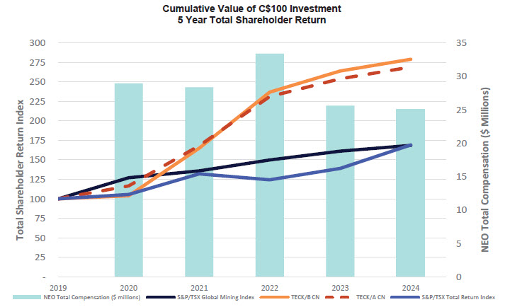 | (d) | with the advice of the Compensation & Talent Committee, approving the compensation of the Management team and approving an appropriate compensation program for Teck’s personnel, including approval of any equity grants under Teck’s long-term incentive programs; |