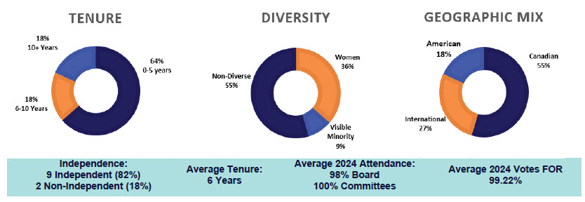 Teck is committed to maintaining best practices in corporate governance. In 2024, we undertook an externally facilitated board, committee and peer evaluation process, with a focus on Board effectiveness and enabling Teck to build the Board of the future, with a continued focus on emerging risks and strategic priorities. The Board continued succession planning activities, welcoming one new independent director in 2024, with another new independent nominee standing for election at the Meeting. Each nominee has been proposed for nomination with reference to the skills determined by the Board to be required at this time, as set out in the skills matrix.