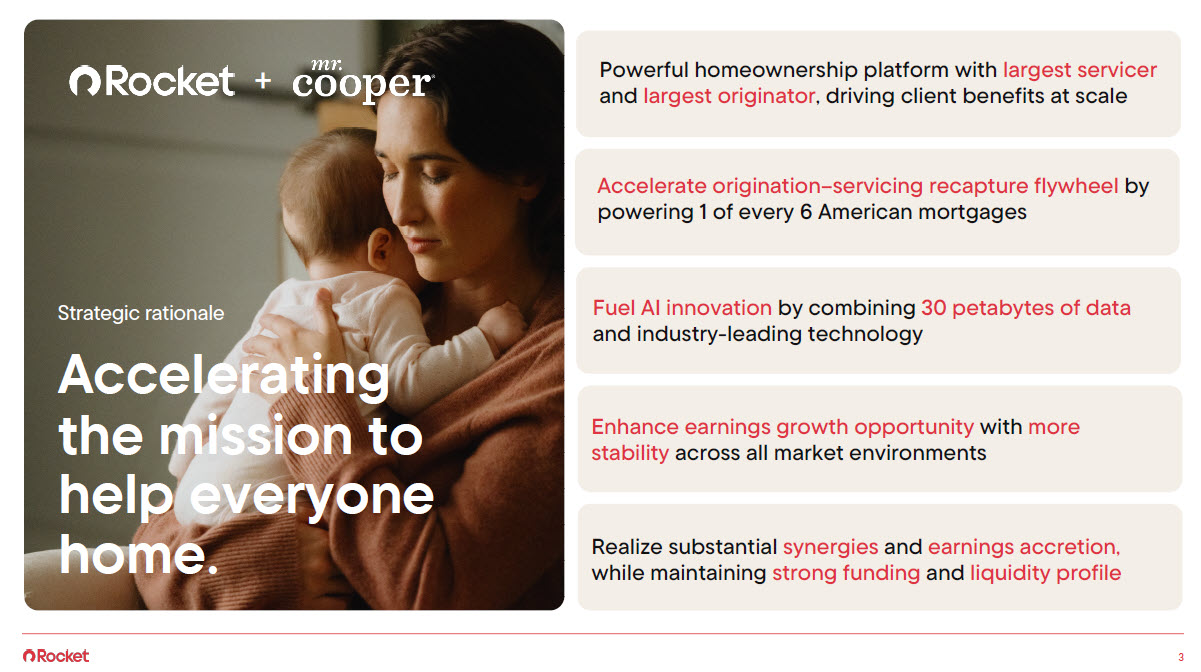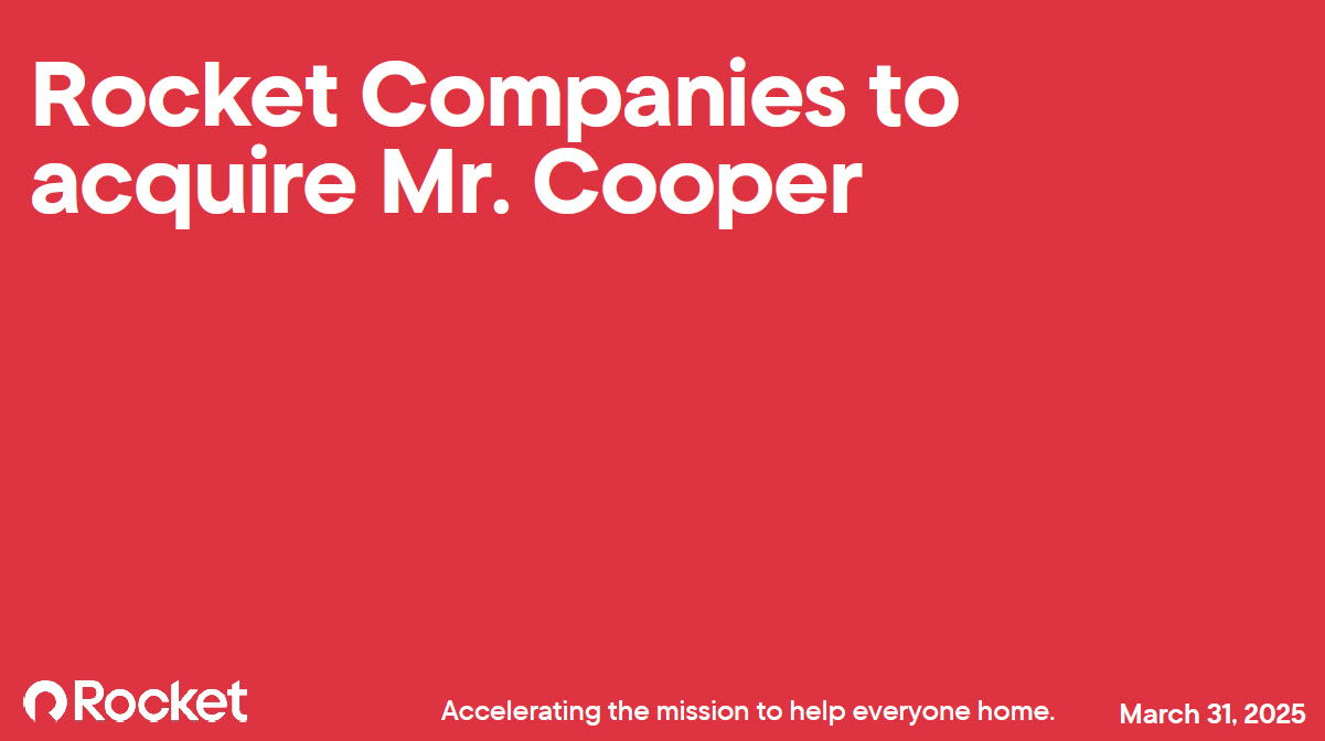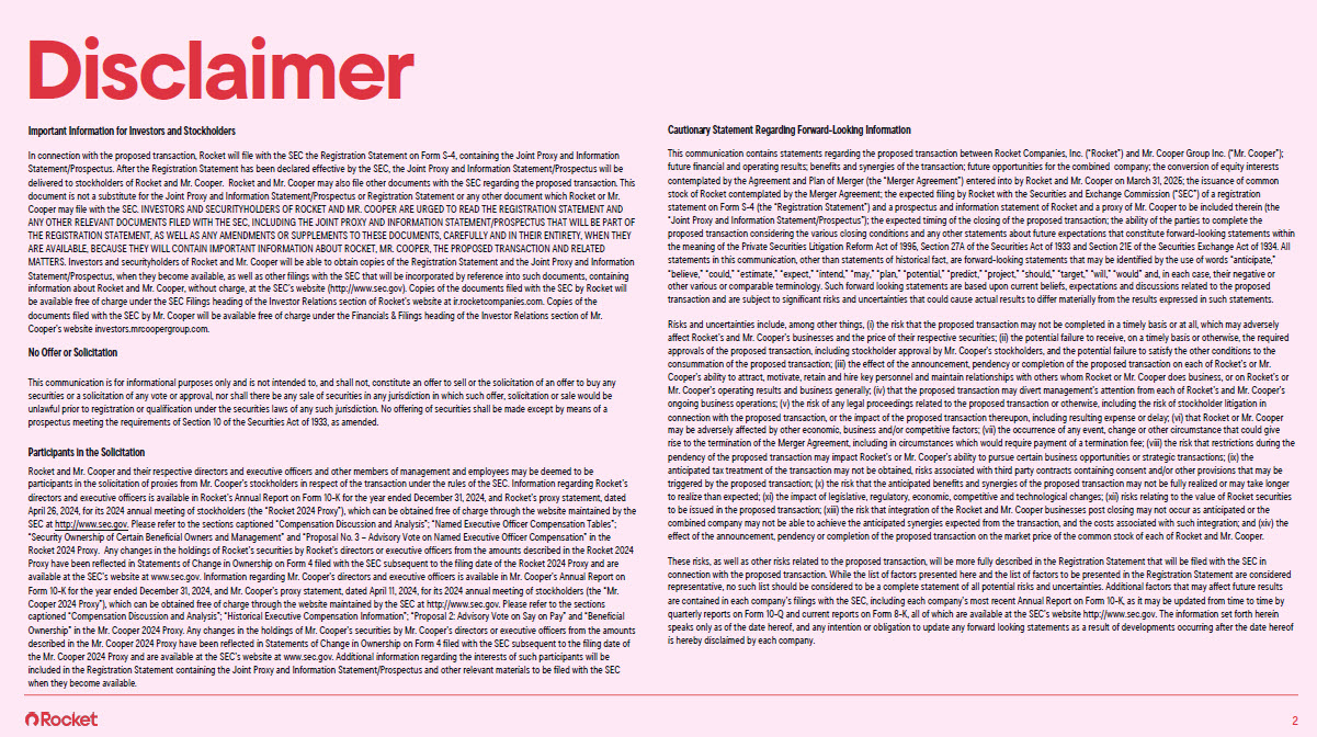 Disclaimer Important Information for Investors and Stockholders In connection with the proposed transaction, Rocket will file with the SEC the Registration Statement on Form S-4, containing the Joint Proxy and Information Statement/Prospectus. After the Registration Statement has been declared effective by the SEC, the Joint Proxy and Information Statement/Prospectus will be delivered to stockholders of Rocket and Mr. Cooper. Rocket and Mr. Cooper may also file other documents with the SEC regarding the proposed transaction. This document is not a substitute for the Joint Proxy and Information Statement/Prospectus or Registration Statement or any other document which Rocket or Mr. Cooper may file with the SEC. INVESTORS AND SECURITYHOLDERS OF ROCKET AND MR. COOPER ARE URGED TO READ THE REGISTRATION STATEMENT AND ANY OTHER RELEVANT DOCUMENTS FILED WITH THE SEC, INCLUDING THE JOINT PROXY AND INFORMATION STATEMENT/PROSPECTUS THAT WILL BE PART OF THE REGISTRATION STATEMENT, AS WELL AS ANY AMENDMENTS OR SUPPLEMENTS TO THESE DOCUMENTS, CAREFULLY AND IN THEIR ENTIRETY, WHEN THEY ARE AVAILABLE, BECAUSE THEY WILL CONTAIN IMPORTANT INFORMATION ABOUT ROCKET, MR. COOPER, THE PROPOSED TRANSACTION AND RELATED MATTERS. Investors and securityholders of Rocket and Mr. Cooper will be able to obtain copies of the Registration Statement and the Joint Proxy and Information Statement/Prospectus, when they become available, as well as other filings with the SEC that will be incorporated by reference into such documents, containing information about Rocket and Mr. Cooper, without charge, at the SEC’s website (http://www.sec.gov). Copies of the documents filed with the SEC by Rocket will be available free of charge under the SEC Filings heading of the Investor Relations section of Rocket’s website at ir.rocketcompanies.com. Copies of the documents filed with the SEC by Mr. Cooper will be available free of charge under the Financials & Filings heading of the Investor Relations section of Mr. Cooper’s website investors.mrcoopergroup.com. No Offer or Solicitation This communication is for informational purposes only and is not intended to, and shall not, constitute an offer to sell or the solicitation of an offer to buy any securities or a solicitation of any vote or approval, nor shall there be any sale of securities in any jurisdiction in which such offer, solicitation or sale would be unlawful prior to registration or qualification under the securities laws of any such jurisdiction. No offering of securities shall be made except by means of a prospectus meeting the requirements of Section 10 of the Securities Act of 1933, as amended. Participants in the Solicitation Rocket and Mr. Cooper and their respective directors and executive officers and other members of management and employees may be deemed to be participants in the solicitation of proxies from Mr. Cooper’s stockholders in respect of the transaction under the rules of the SEC. Information regarding Rocket’s directors and executive officers is available in Rocket’s Annual Report on Form 10-K for the year ended December 31, 2024, and Rocket’s proxy statement, dated April 26, 2024, for its 2024 annual meeting of stockholders (the “Rocket 2024 Proxy”), which can be obtained free of charge through the website maintained by the SEC at http://www.sec.gov. Please refer to the sections captioned “Compensation Discussion and Analysis”; “Named Executive Officer Compensation Tables”; “Security Ownership of Certain Beneficial Owners and Management” and “Proposal No. 3 – Advisory Vote on Named Executive Officer Compensation” in the Rocket 2024 Proxy. Any changes in the holdings of Rocket’s securities by Rocket’s directors or executive officers from the amounts described in the Rocket 2024 Proxy have been reflected in Statements of Change in Ownership on Form 4 filed with the SEC subsequent to the filing date of the Rocket 2024 Proxy and are available at the SEC’s website at www.sec.gov. Information regarding Mr. Cooper’s directors and executive officers is available in Mr. Cooper’s Annual Report on Form 10-K for the year ended December 31, 2024, and Mr. Cooper’s proxy statement, dated April 11, 2024, for its 2024 annual meeting of stockholders (the “Mr. Cooper 2024 Proxy”), which can be obtained free of charge through the website maintained by the SEC at http://www.sec.gov. Please refer to the sections captioned “Compensation Discussion and Analysis”; “Historical Executive Compensation Information”; “Proposal 2: Advisory Vote on Say on Pay” and “Beneficial Ownership” in the Mr. Cooper 2024 Proxy. Any changes in the holdings of Mr. Cooper’s securities by Mr. Cooper’s directors or executive officers from the amounts described in the Mr. Cooper 2024 Proxy have been reflected in Statements of Change in Ownership on Form 4 filed with the SEC subsequent to the filing date of the Mr. Cooper 2024 Proxy and are available at the SEC’s website at www.sec.gov. Additional information regarding the interests of such participants will be included in the Registration Statement containing the Joint Proxy and Information Statement/Prospectus and other relevant materials to be filed with the SEC when they become available. Cautionary Statement Regarding Forward-Looking Information This communication contains statements regarding the proposed transaction between Rocket Companies, Inc. (“Rocket”) and Mr. Cooper Group Inc. (“Mr. Cooper”); future financial and operating results; benefits and synergies of the transaction; future opportunities for the combined company; the conversion of equity interests contemplated by the Agreement and Plan of Merger (the “Merger Agreement”) entered into by Rocket and Mr. Cooper on March 31, 2025; the issuance of common stock of Rocket contemplated by the Merger Agreement; the expected filing by Rocket with the Securities and Exchange Commission (“SEC”) of a registrati