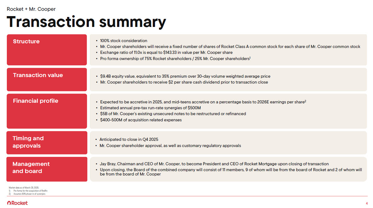 Under the terms of the agreement, Mr. Cooper shareholders will receive a fixed exchange ratio of 11.0 Rocket shares for each share of Mr. Cooper common stock. This represents a $143.33 per share value based on the closing price as of March 28, 2025, and a premium of 35% over the volume weighted average price (VWAP) of Mr. Cooper’s common stock for the 30 days ending March 28, 2025. Upon completion of the transaction, Rocket shareholders will own approximately 75% of the combined company on a fully diluted basis pro forma for the Redfin transaction, while Mr. Cooper shareholders will own approximately 25%. The all-stock transaction is intended to be tax-free to Mr. Cooper shareholders.