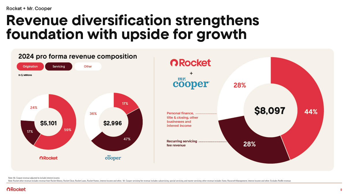 Revenue diversification strengthens foundation with upside for growth 2024 pro forma revenue composition Origination Servicing Other In $, Millions + 28% 24% 36% $5,101 $2,996 17% Personal finance, title & closing, other businesses and interest income $8,097 44% 17% 59% 47% Recurring servicing fee revenue 28% Note: Mr. Cooper revenue adjusted to include interest income. Note: Rocket other revenue includes revenue from Rocket Money, Rocket Close, Rocket Loans, Rocket Homes, interest income and other, Mr. Cooper servicing fee revenue includes subservicing, special servicing, and master servicing; other revenue includes Xome, Roosevelt Management, interest income and other. Excludes Redfin revenue.